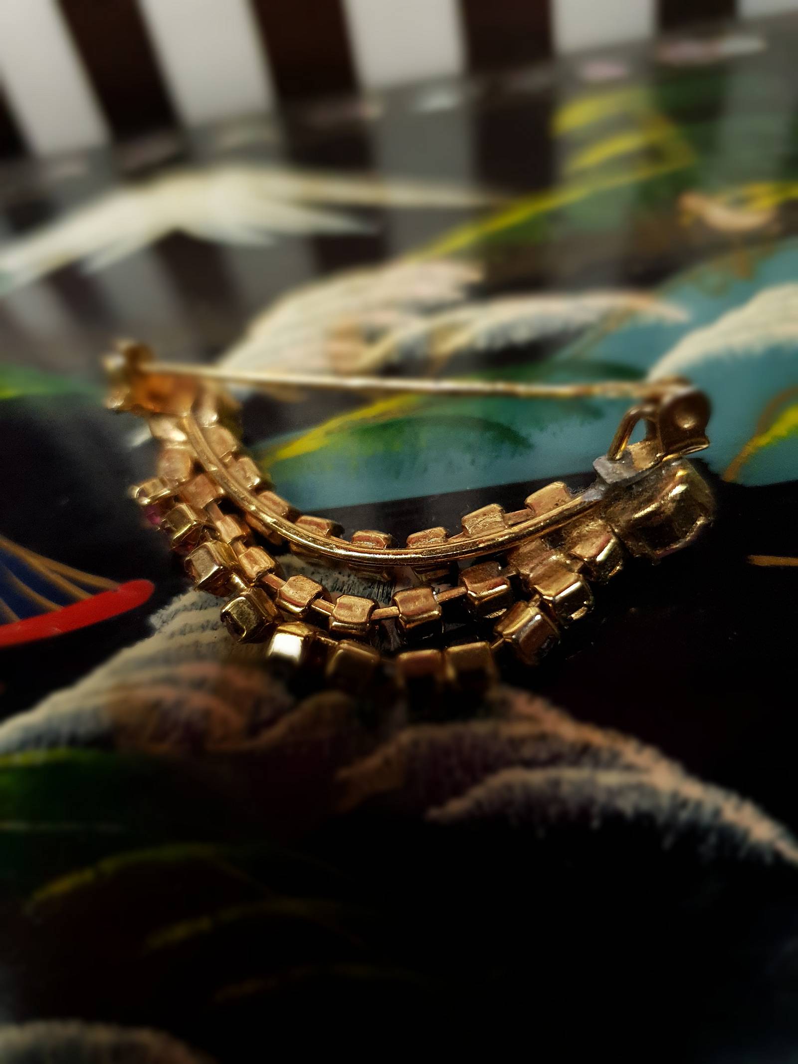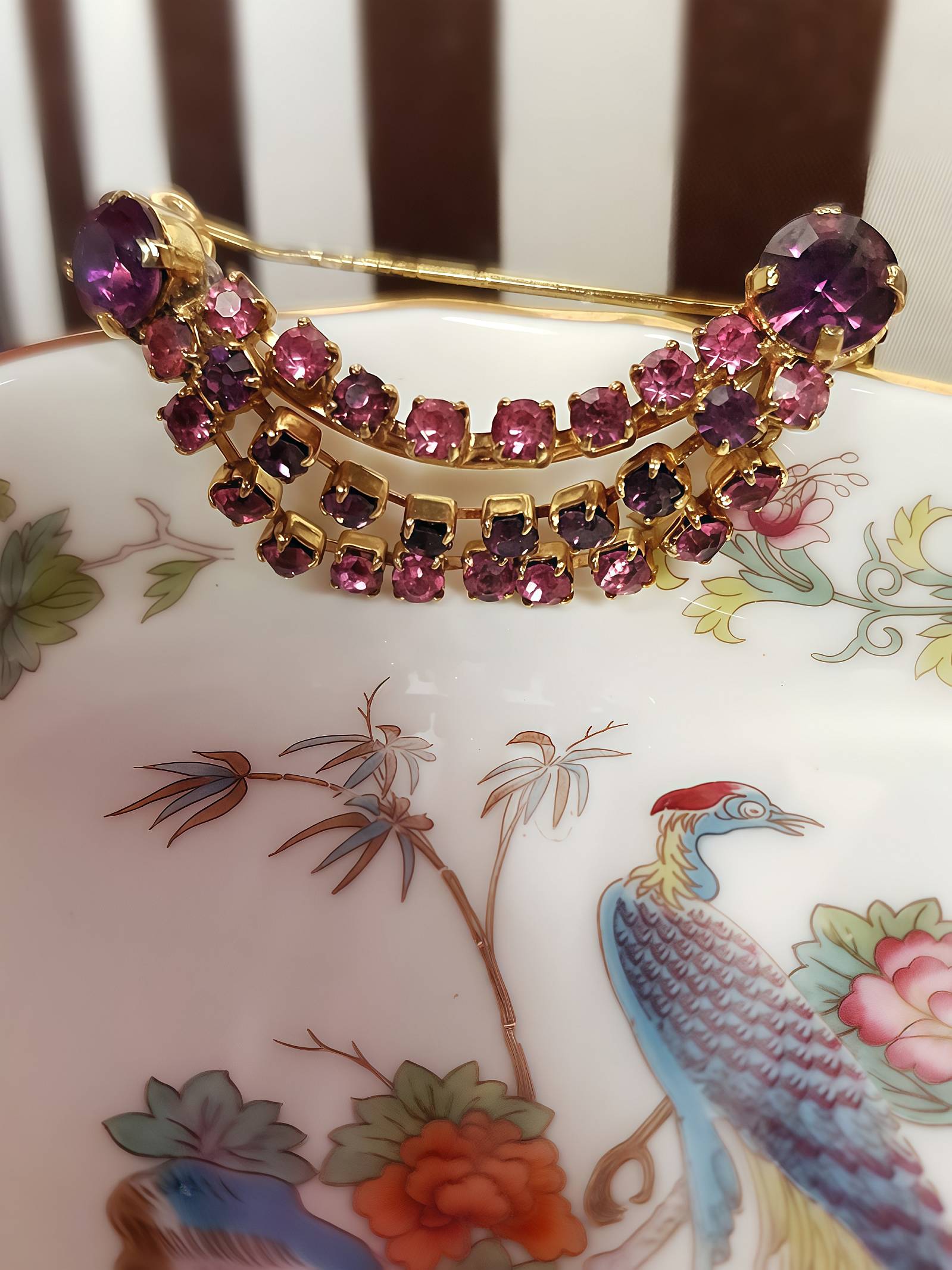 This vintage 50s rhinestone brooch features a gorgeous design of pink and purple glass prong-set rhinestones cascading in three tiers. Crafted in gold-tone metal, the last two rows are articulated, adding dimension and movement to this eye-catching piece.