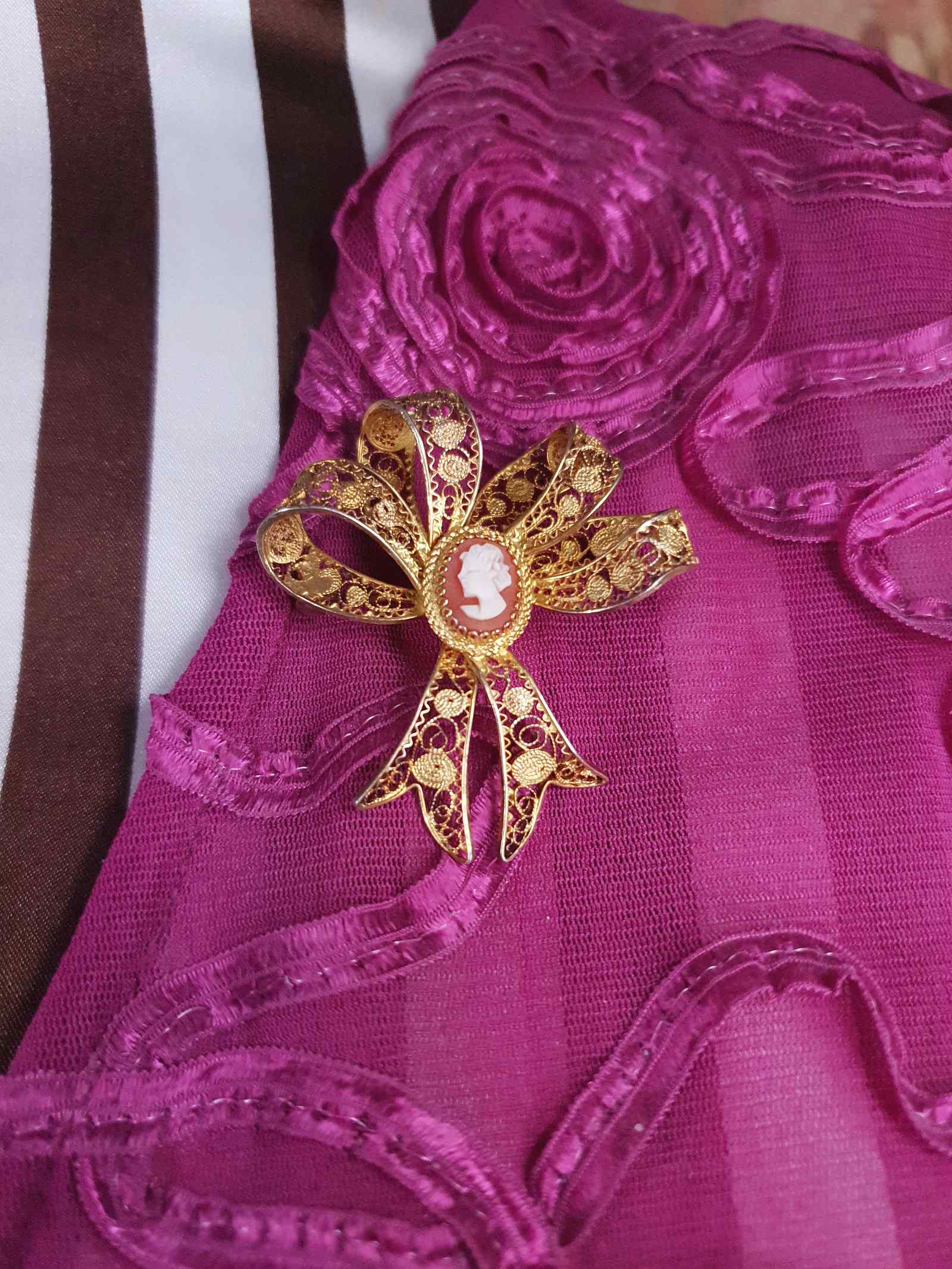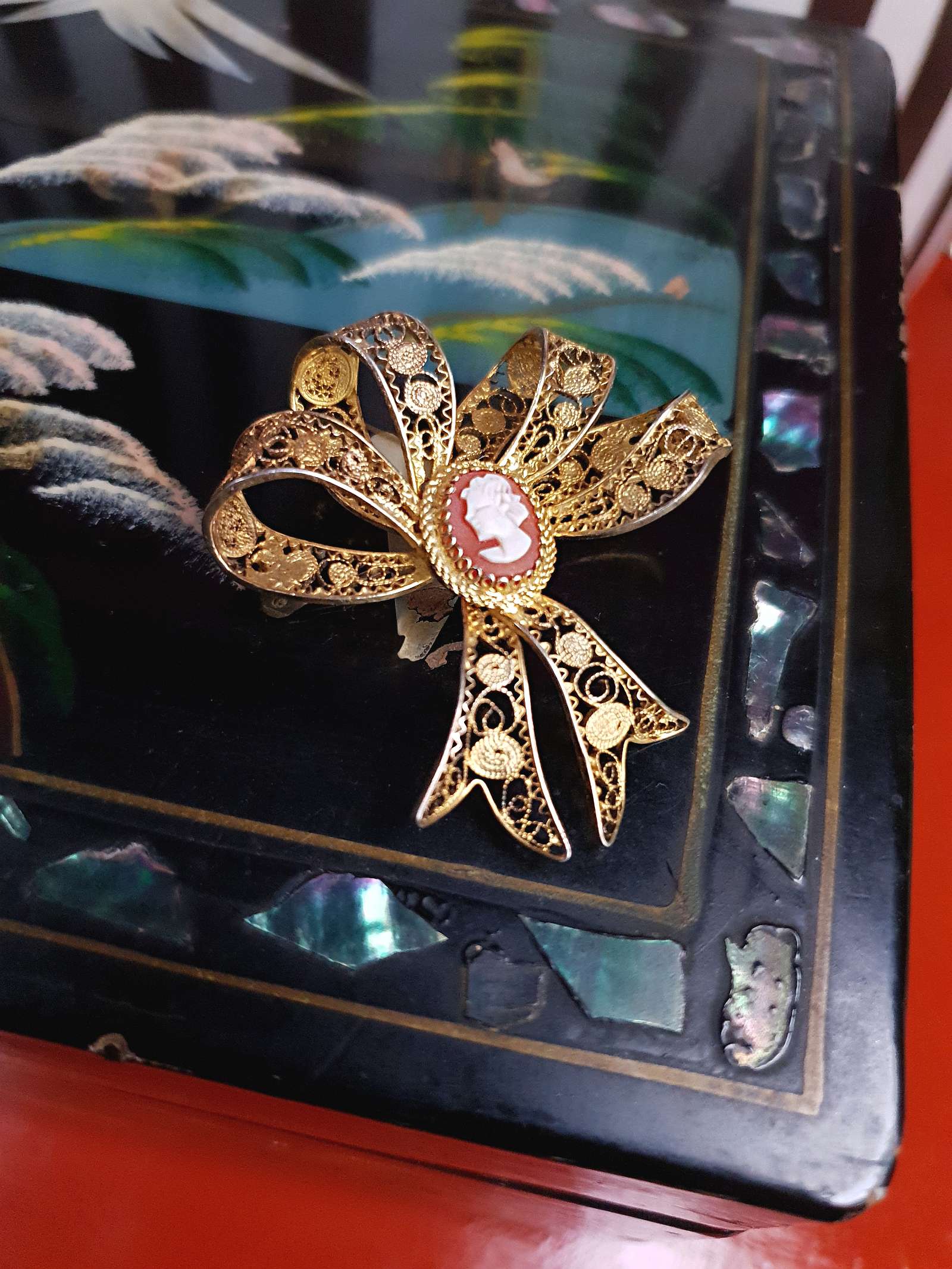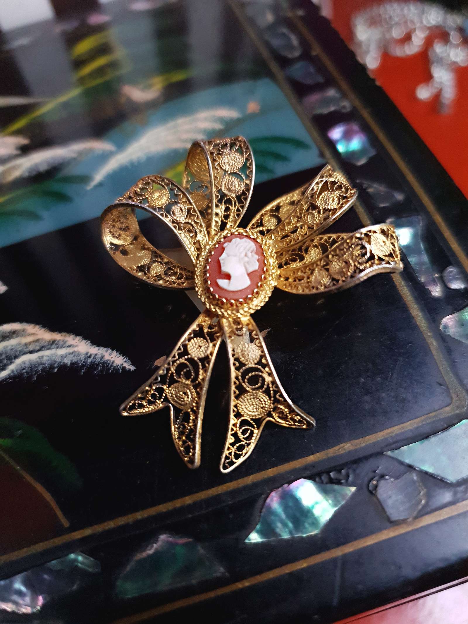 Elegant 50s vintage brooch crafted from hallmarked 900 silver (90% silver) with a 14ct gold vermeil finish. Features an intricate filigree bow design and a classic hand-carved cameo centre. C pin clasp closure.