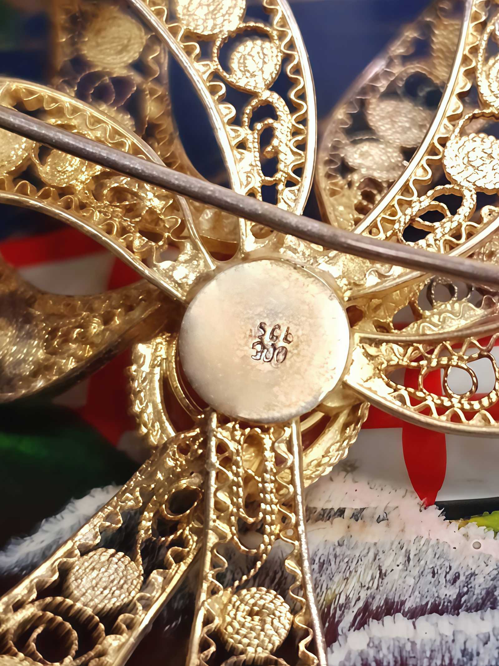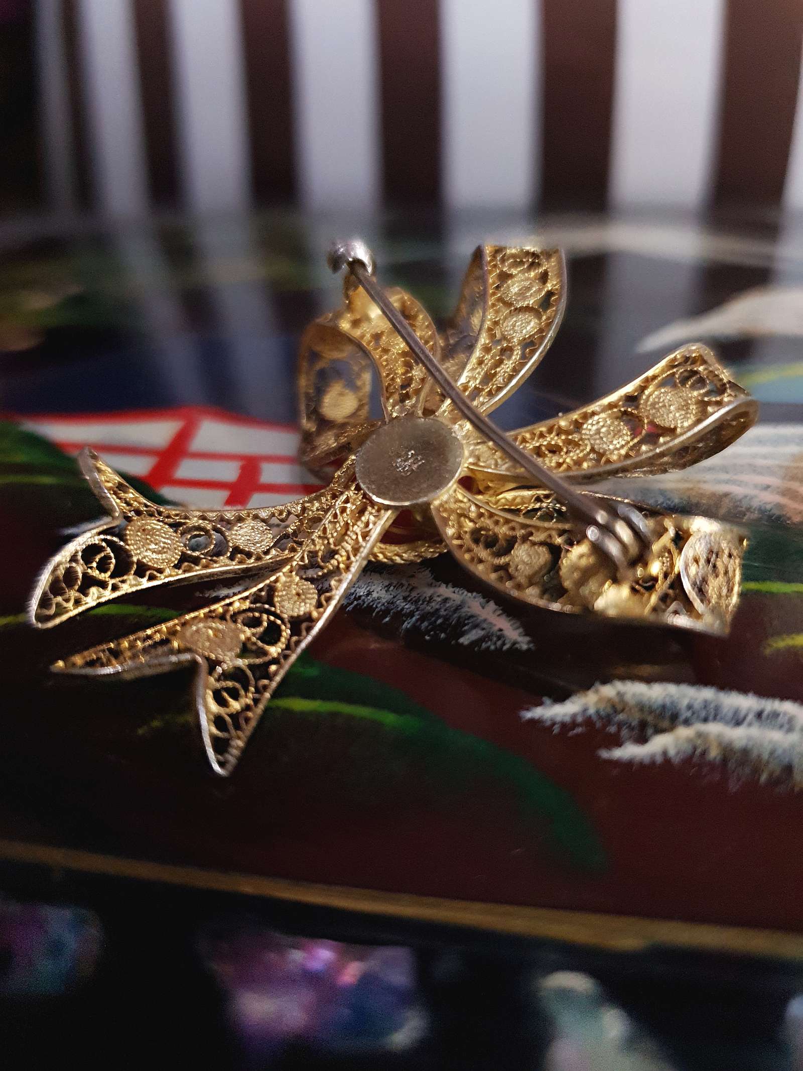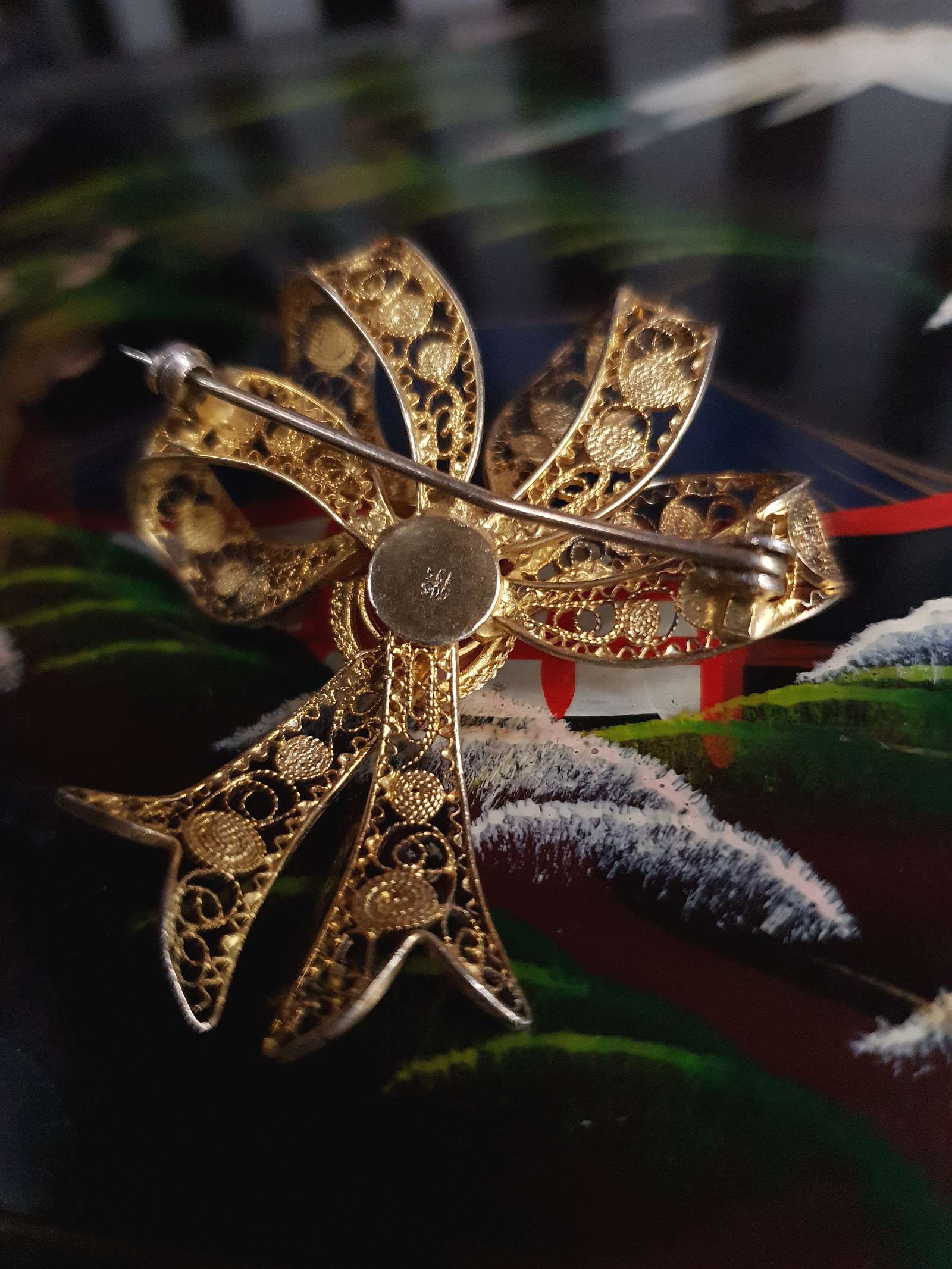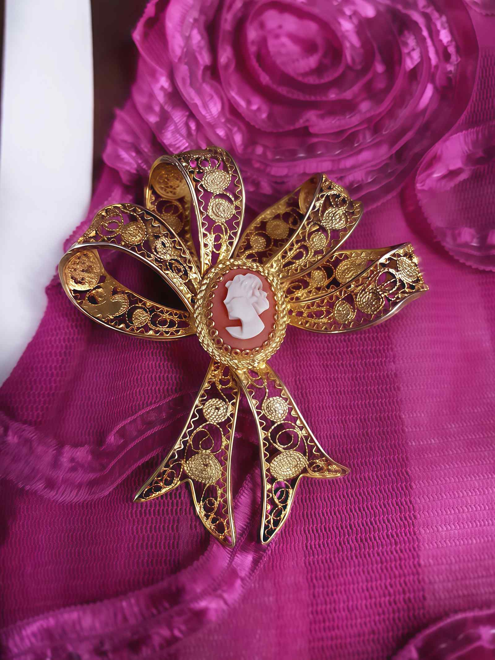 Elegant 50s vintage brooch crafted from hallmarked 900 silver (90% silver) with a 14ct gold vermeil finish. Features an intricate filigree bow design and a classic hand-carved cameo centre. C pin clasp closure.