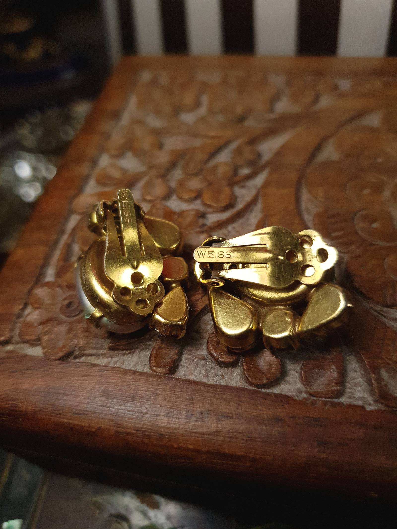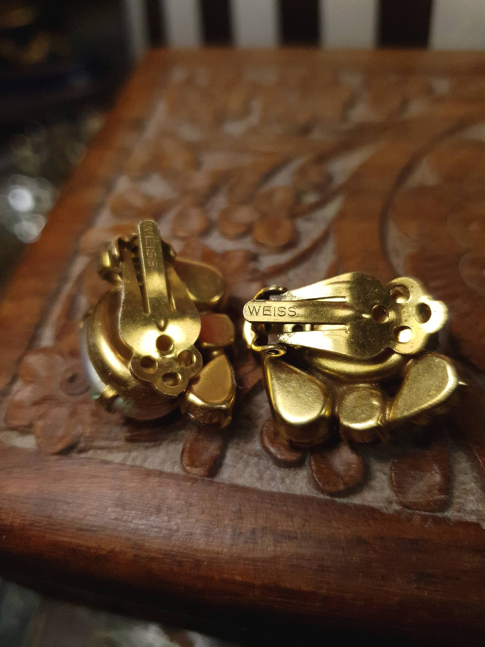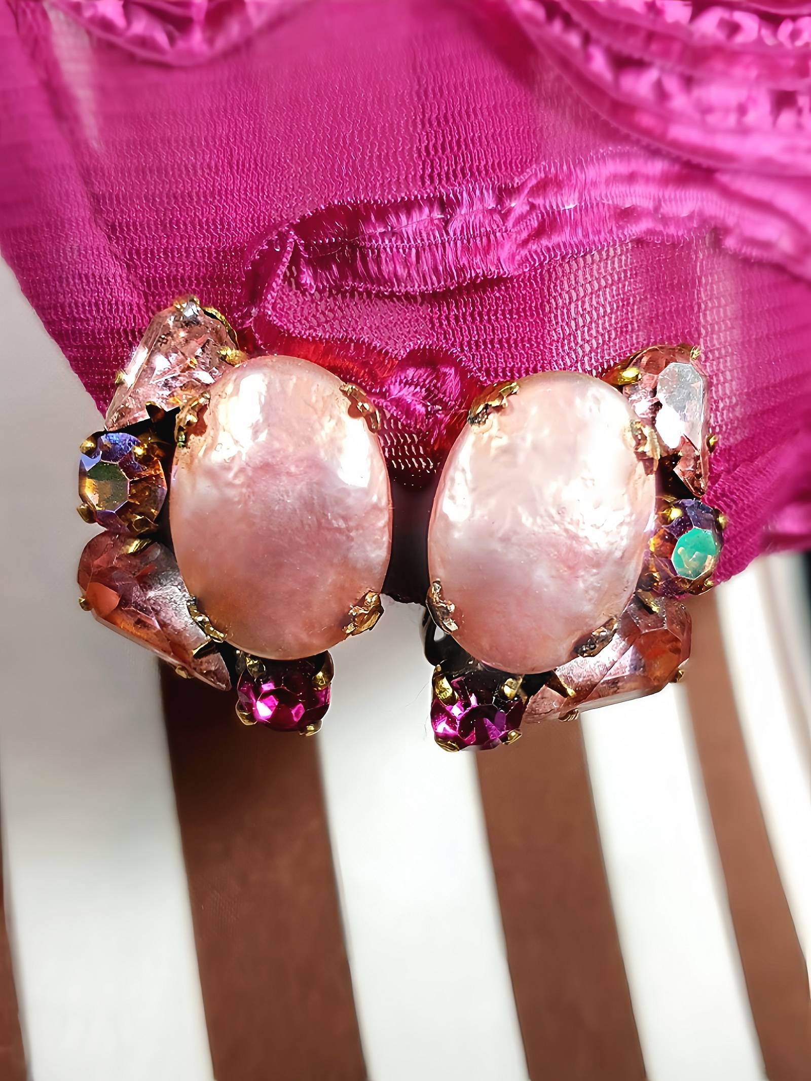 Vintage 1950s Weiss Earrings Pink Rhinestone Pearl Aurora Borealis Clip-Ons AB