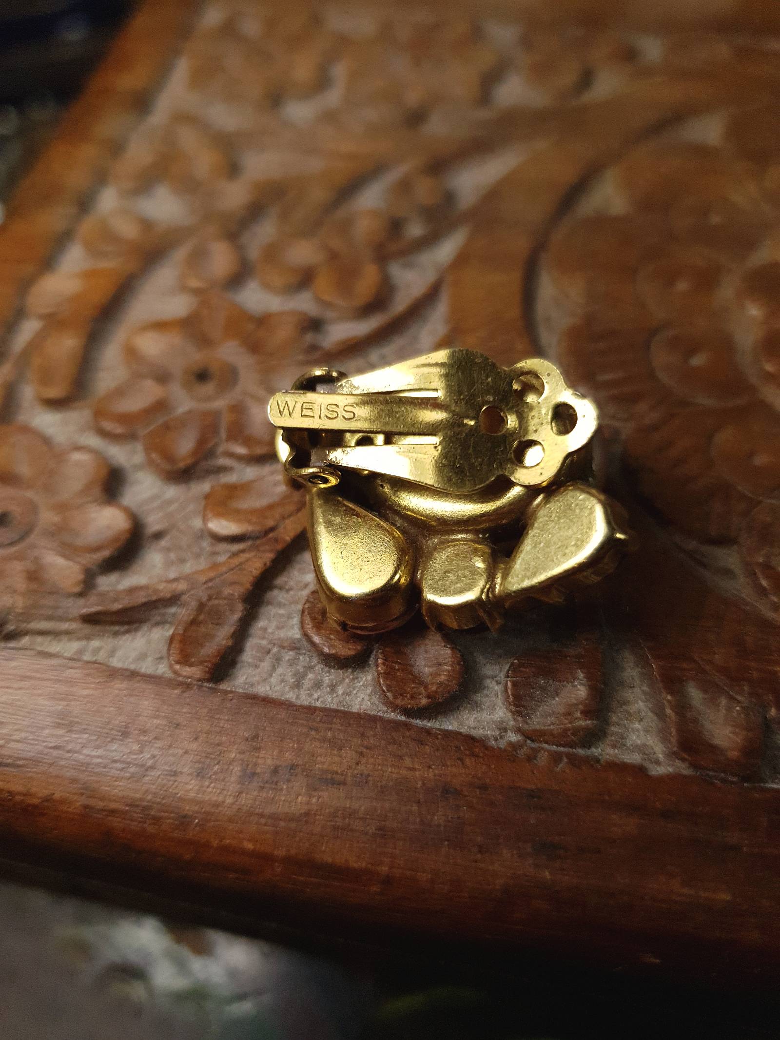 A beautiful rare pair of 50s clip-on earrings from American jewellery designer Albert Weiss. Crafted with cerise and pale pink Aurora Borealis rhinestones in teardrop and round cuts. A large oval palest pink glass pearl completes the look, all prong set in gold-tone metal. Signed Weiss. Perfect for your mid-century jewellery collection.