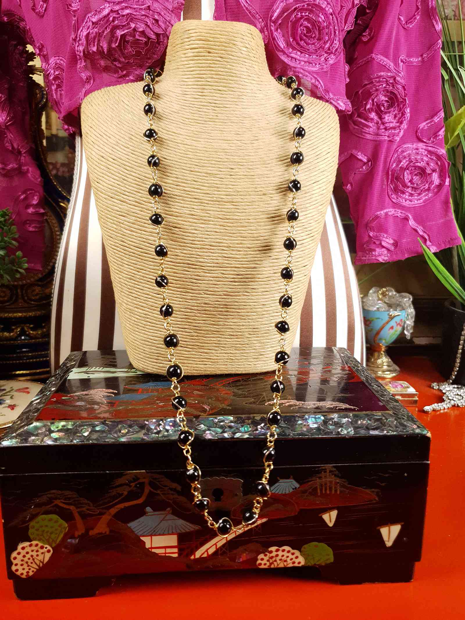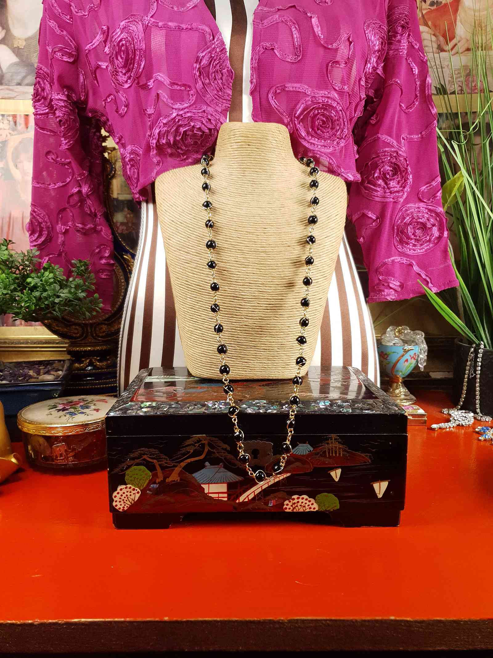 This classic vintage 60s necklace showcases deep black glass beads, each encased in delicate gold-tone wire wrapping and connected by matching chain links. Medium length with a secure spring ring clasp. Perfect for adding vintage sophistication to everyday wear or special occasions.