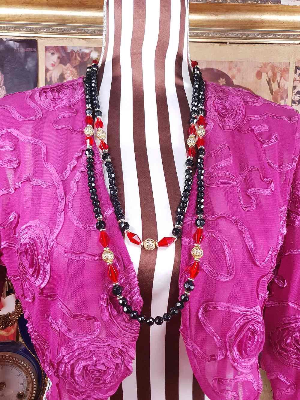 A true vintage 1960s gem, this bohemian necklace combines faceted black resin beads with rich red briolette beads and ornamental gold-tone metal filigree beads. Pull-over design and generous length make it endlessly adaptable—wear solo for impact or layer with other pieces for curated vintage style.