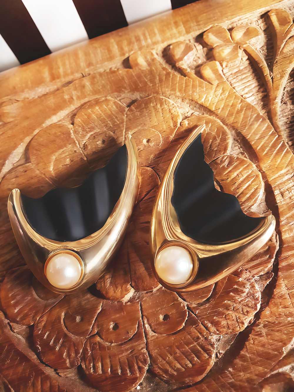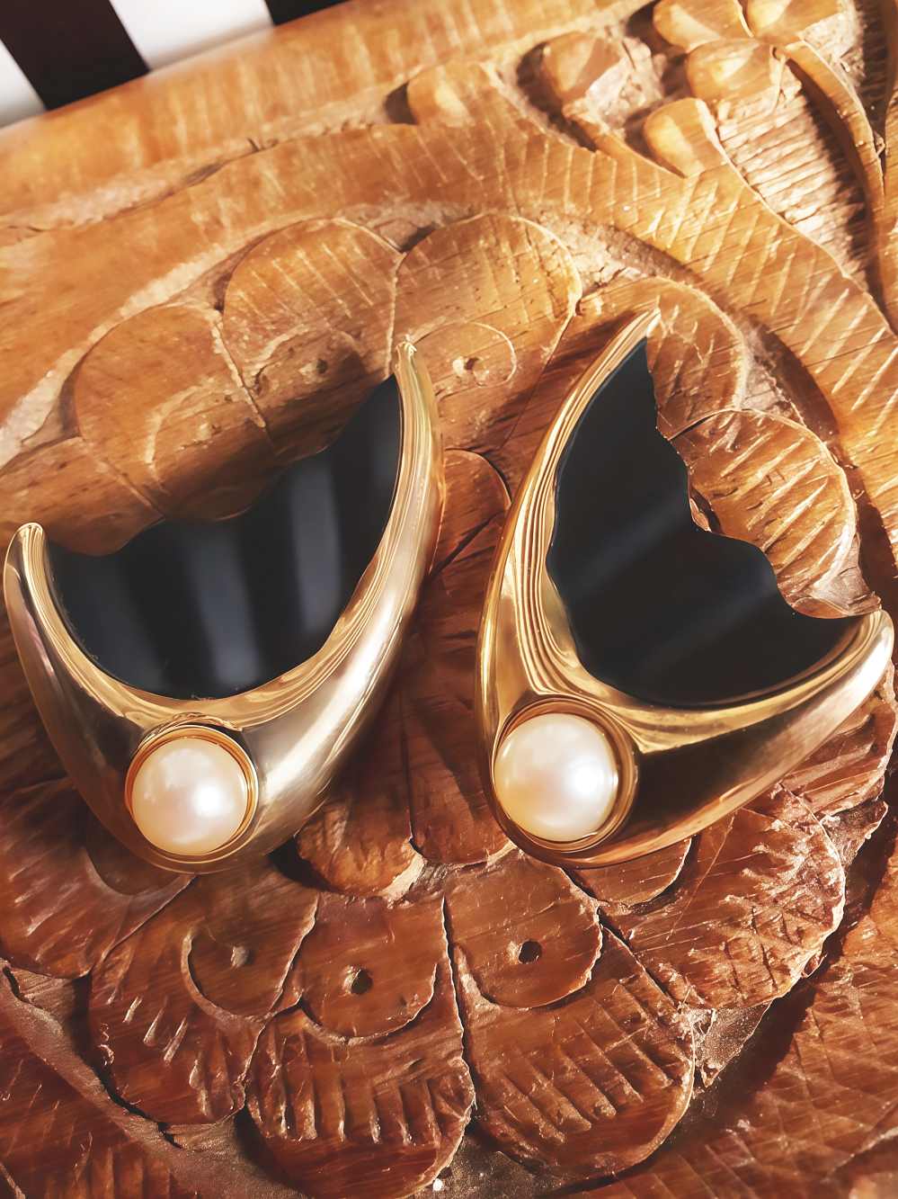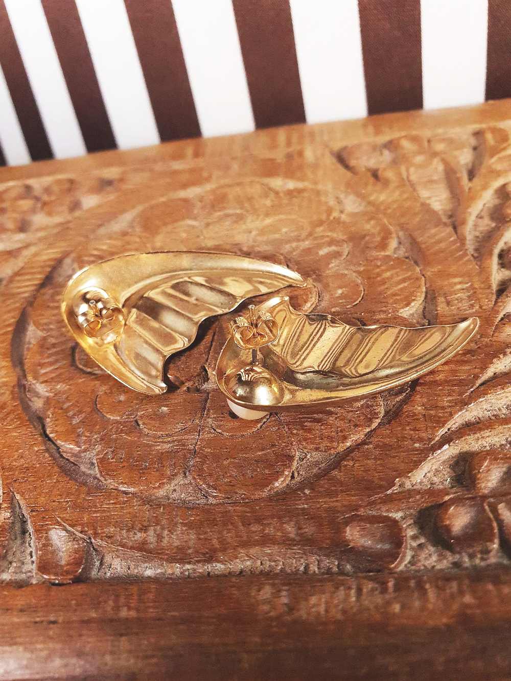 These retro 60s earrings feature a cream faux pearl set in gold-tone metal with a groovy wavy design. For pierced ears.