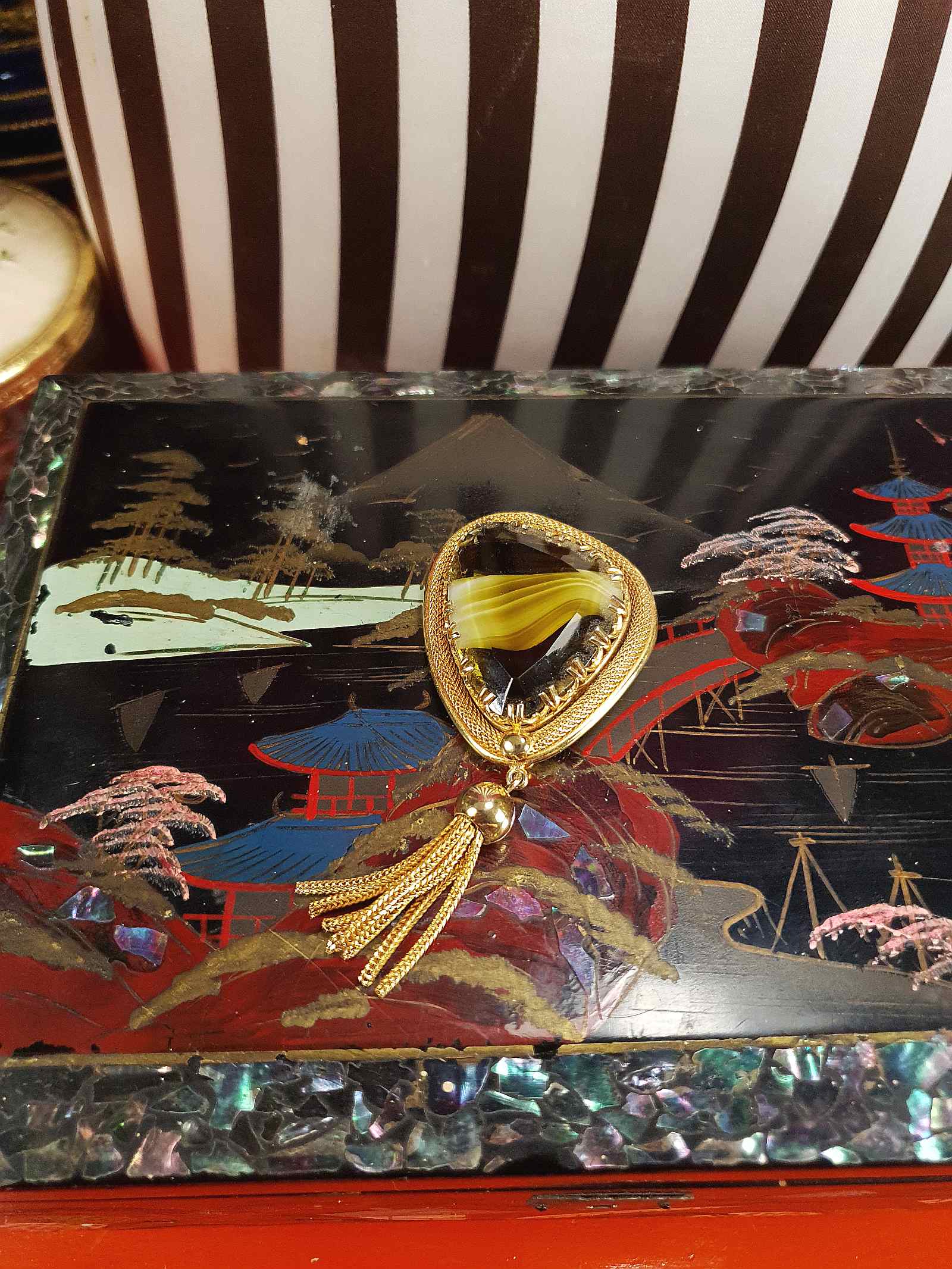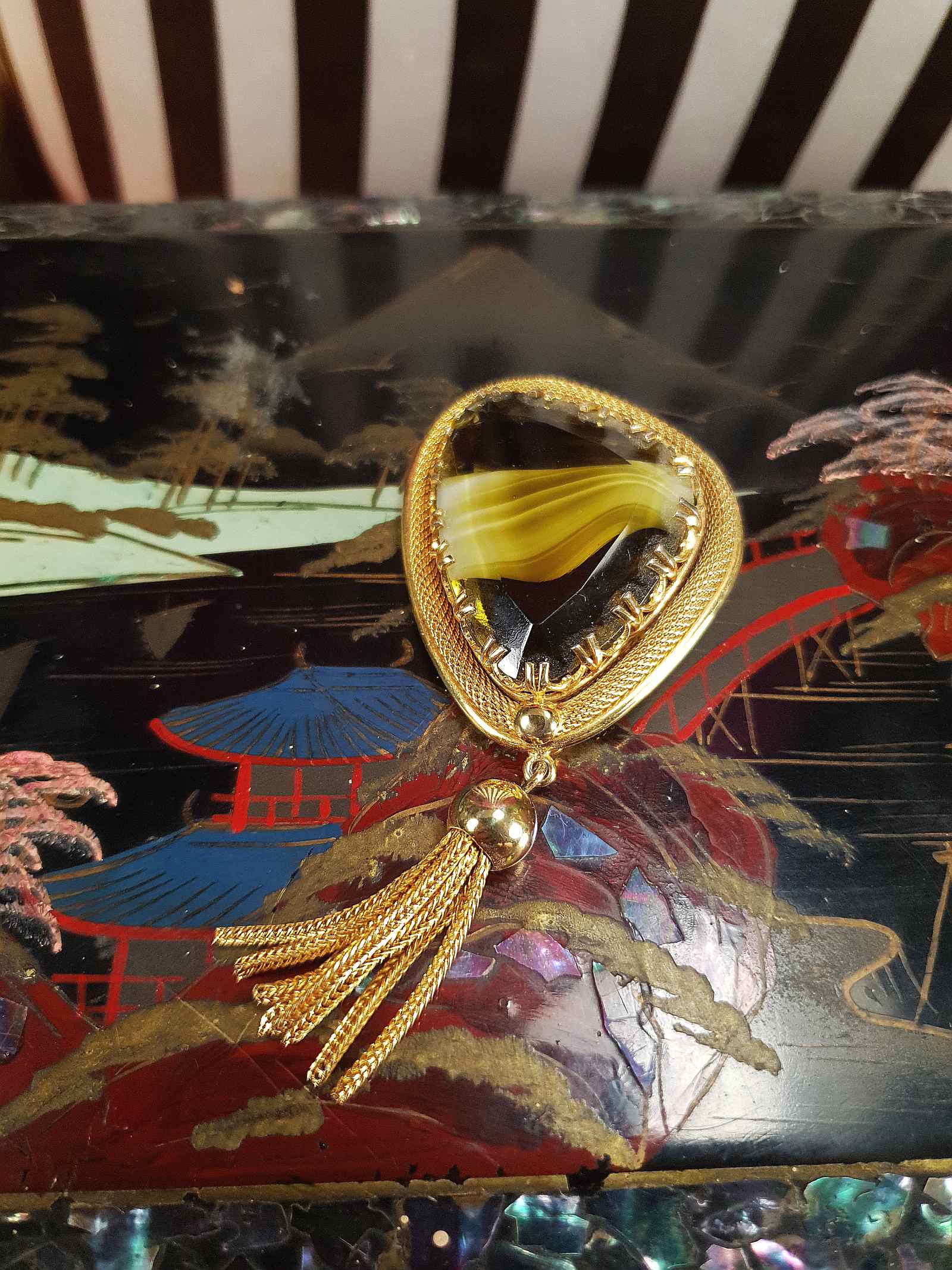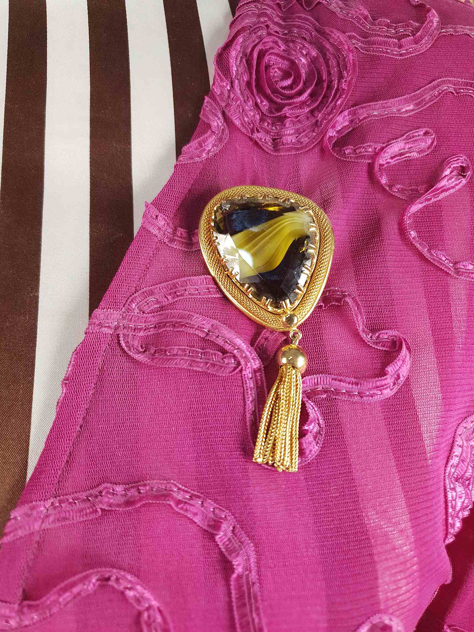 A beautiful vintage 60s brooch featuring an asymmetrical triangle of green spinx art glass agate prong-set ornately in gold-tone metal. The glass jewel is framed by delicate rope detailing and crowned with a graceful tassel, creating movement and vintage charm.