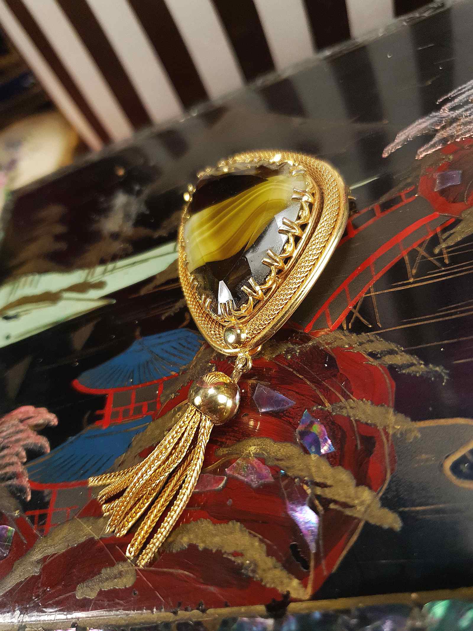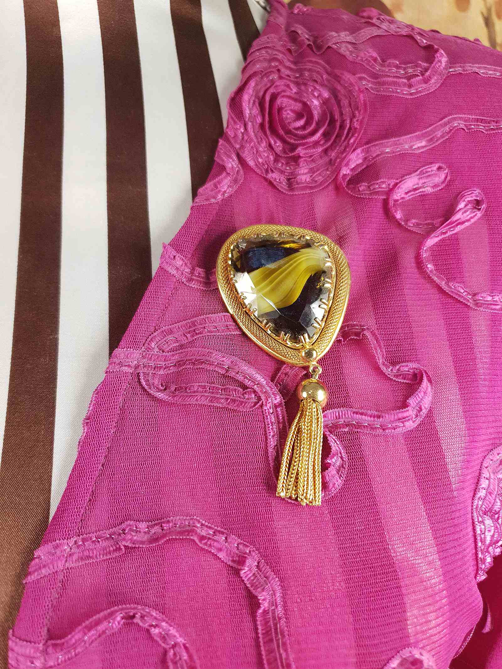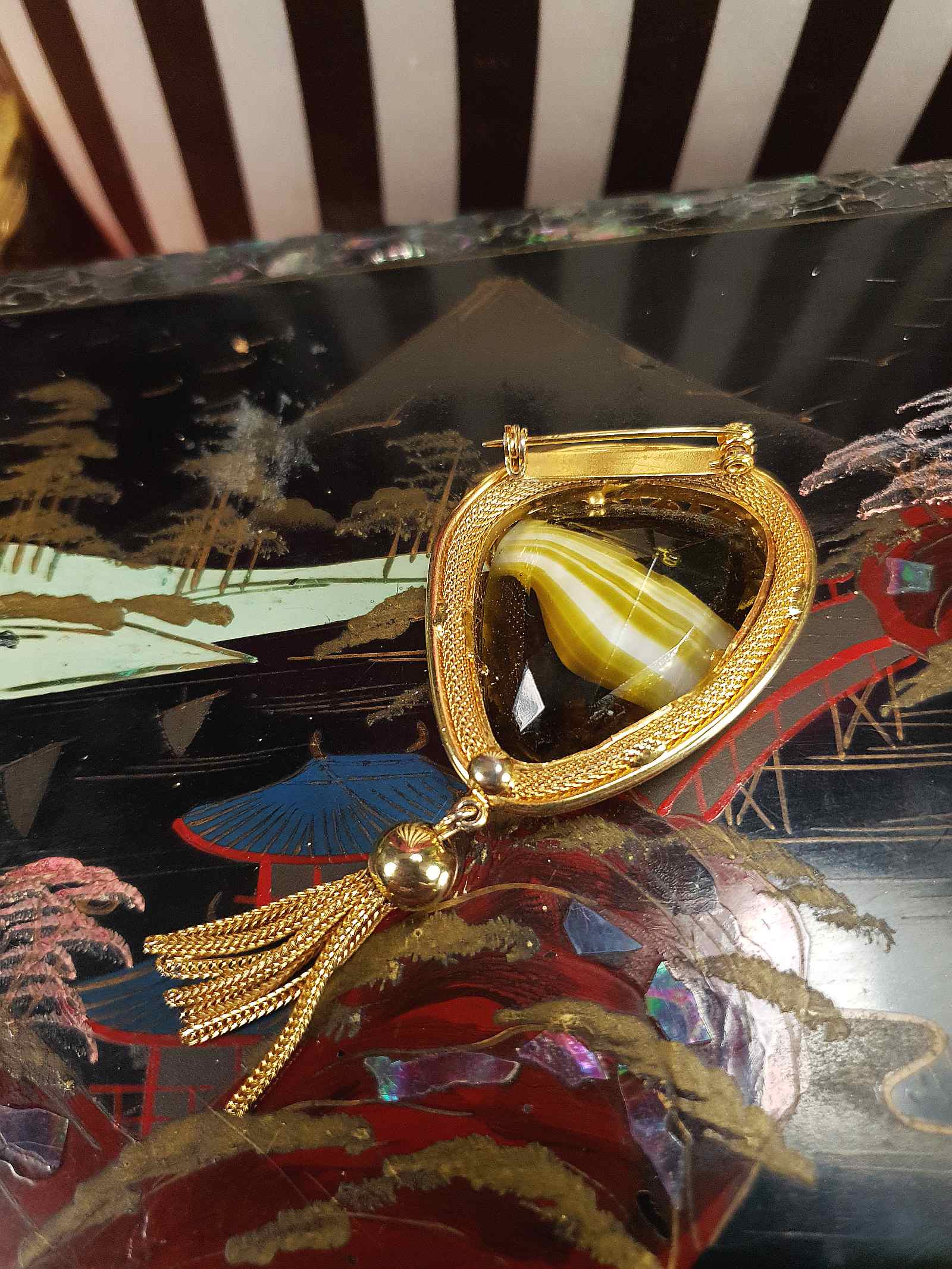 A beautiful vintage 60s brooch featuring an asymmetrical triangle of green spinx art glass agate prong-set ornately in gold-tone metal. The glass jewel is framed by delicate rope detailing and crowned with a graceful tassel, creating movement and vintage charm.