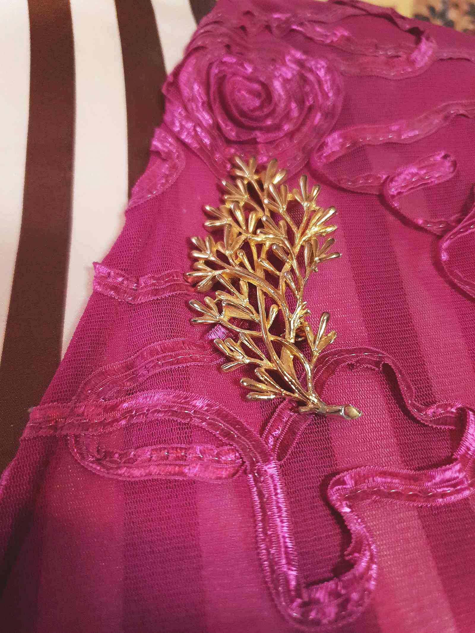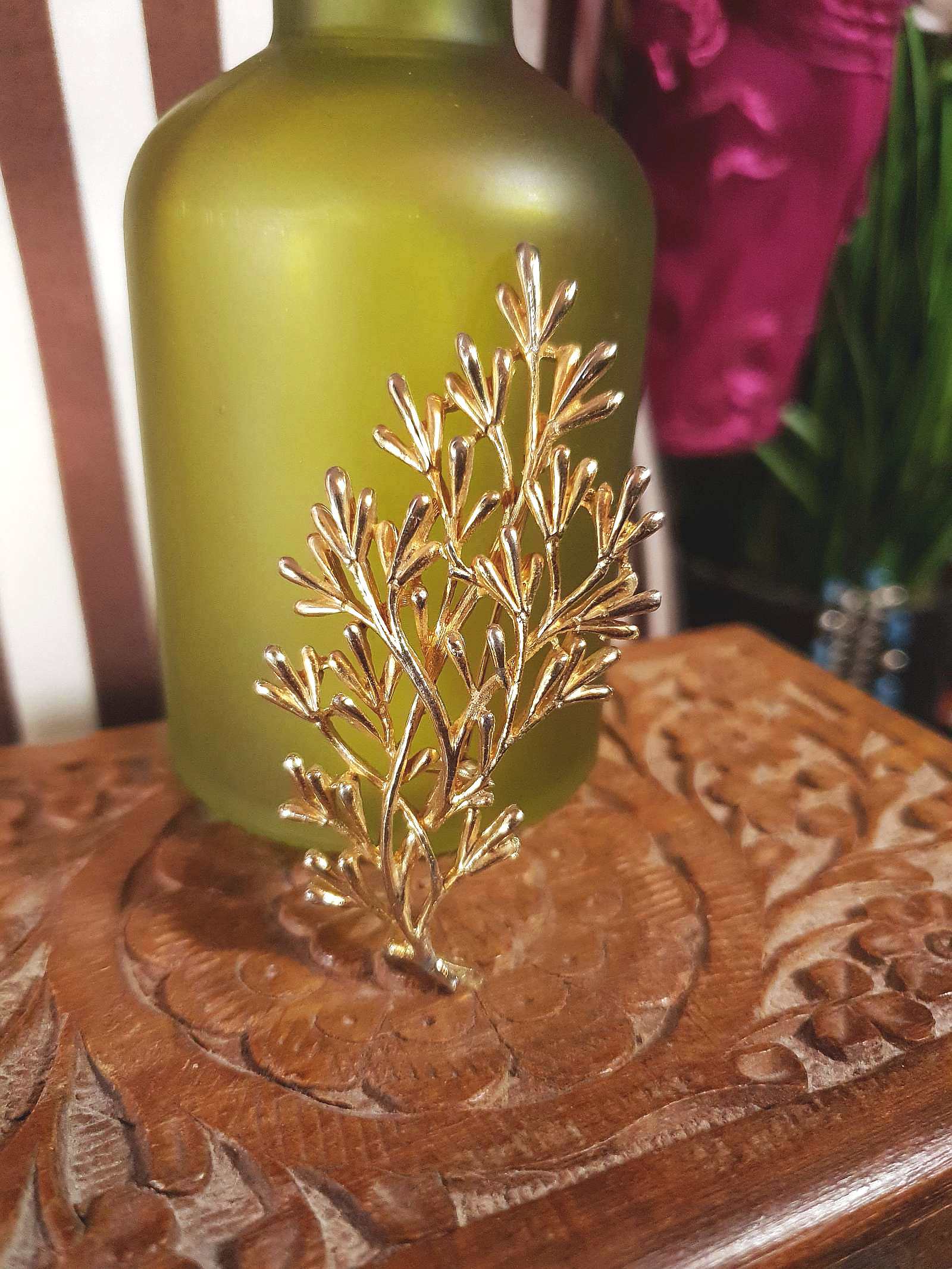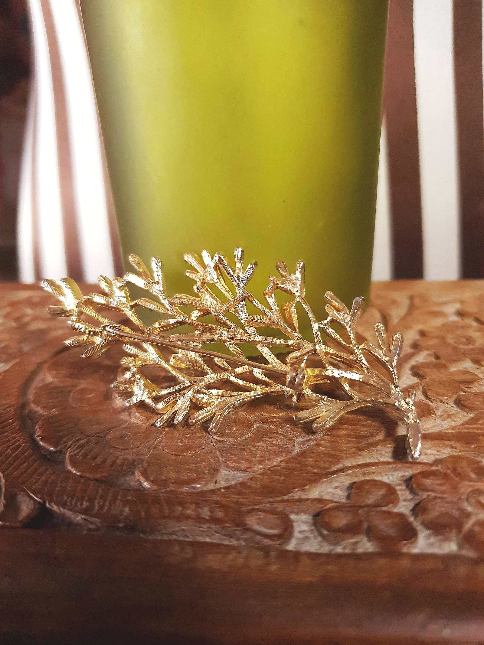 This vintage brooch features a beautiful leaf sprig design and is crafted in pale gold-tone metal. The intricate branch and leaves add a touch of nature-inspired elegance to any outfit.