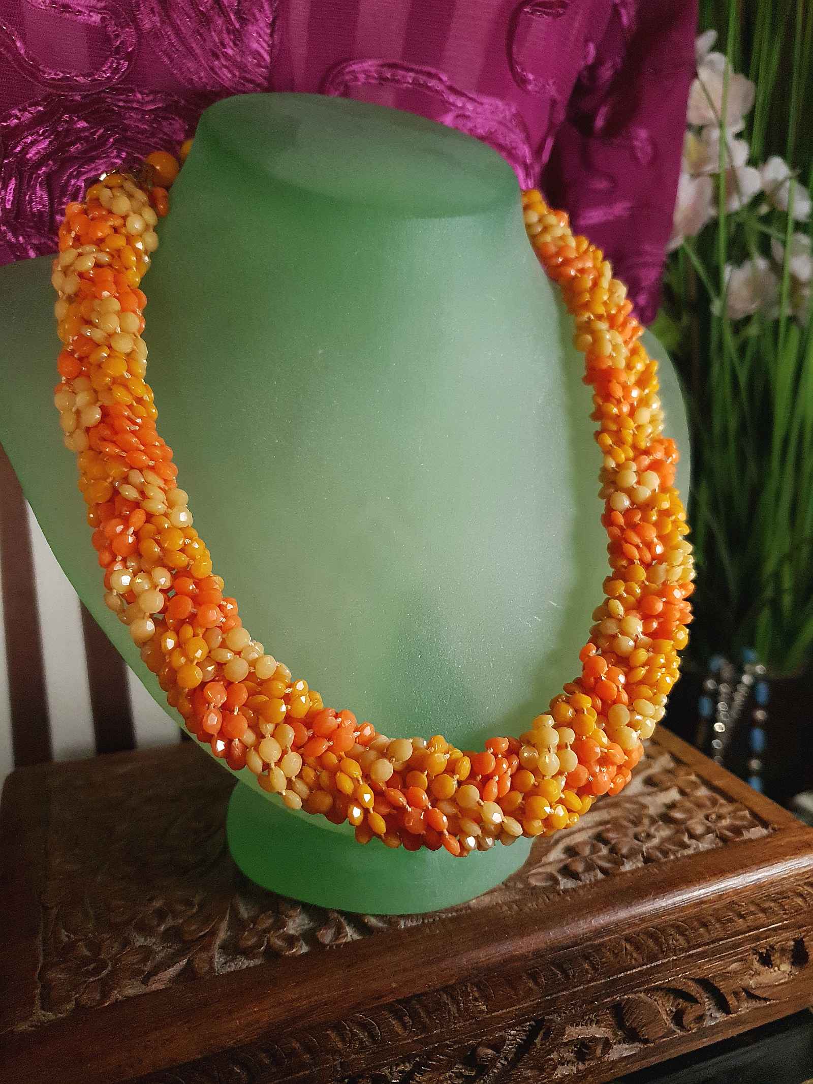 A gorgeous vintage beaded plastic resin bead necklace from the 60s featuring small faceted beads in three shades of orange. The beads catch the light beautifully. Gold-tone metal. Hong Kong signed hook clasp with round bead extender for the perfect fit.