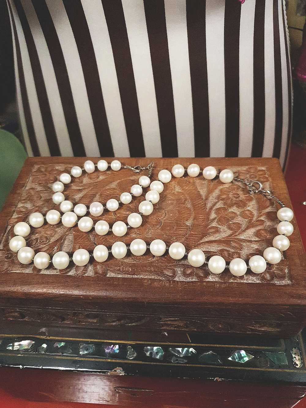 This vintage pearl set is a true gem from the 1960s. The freshwater pearls have a gorgeous, soft, creamy white iridescent lustre and are accented beautifully with sterling silver balls. The choker necklace and bracelet are both adorned with a 925 sterling silver hallmark. Spring ring clasp closure.
