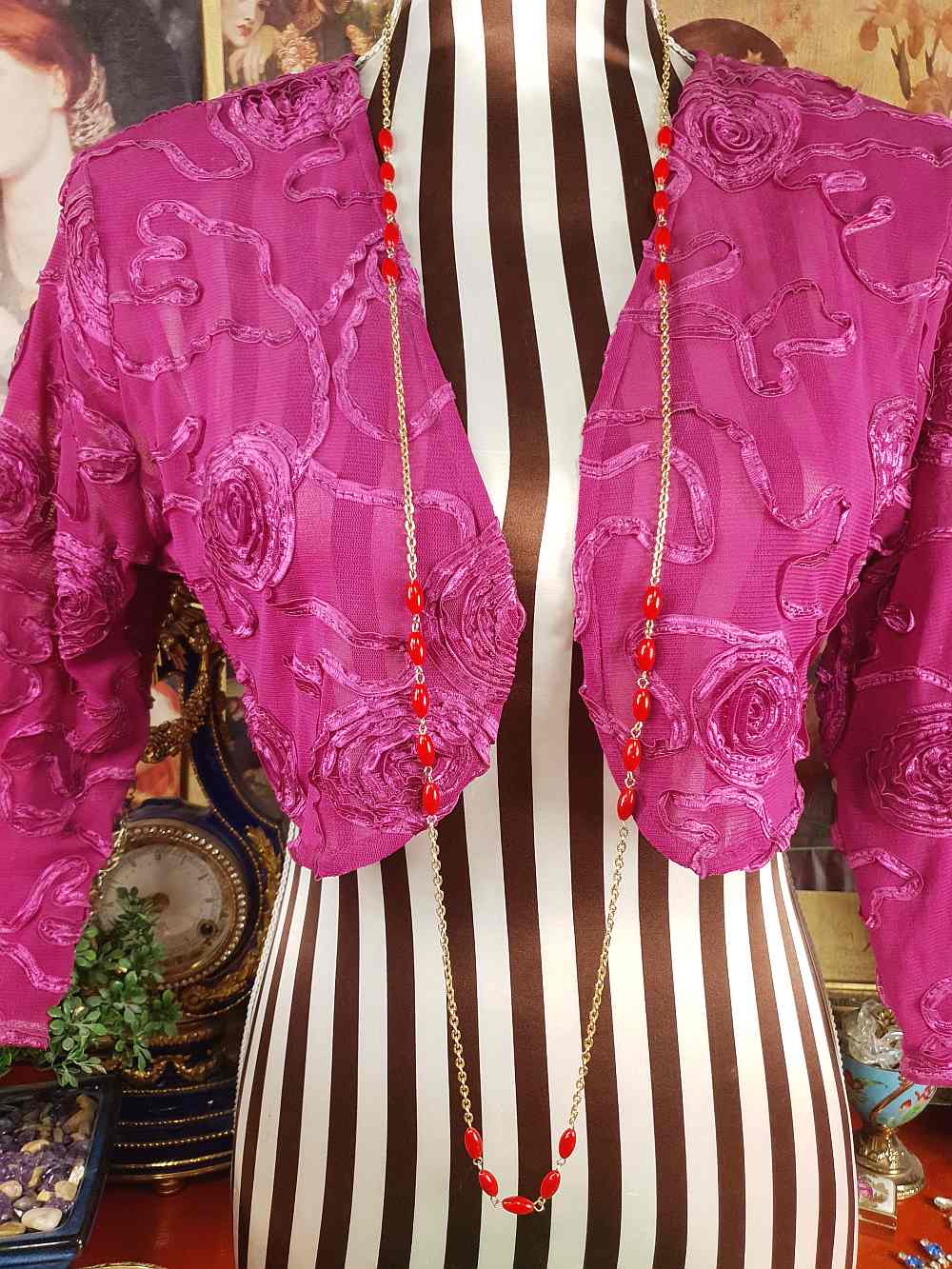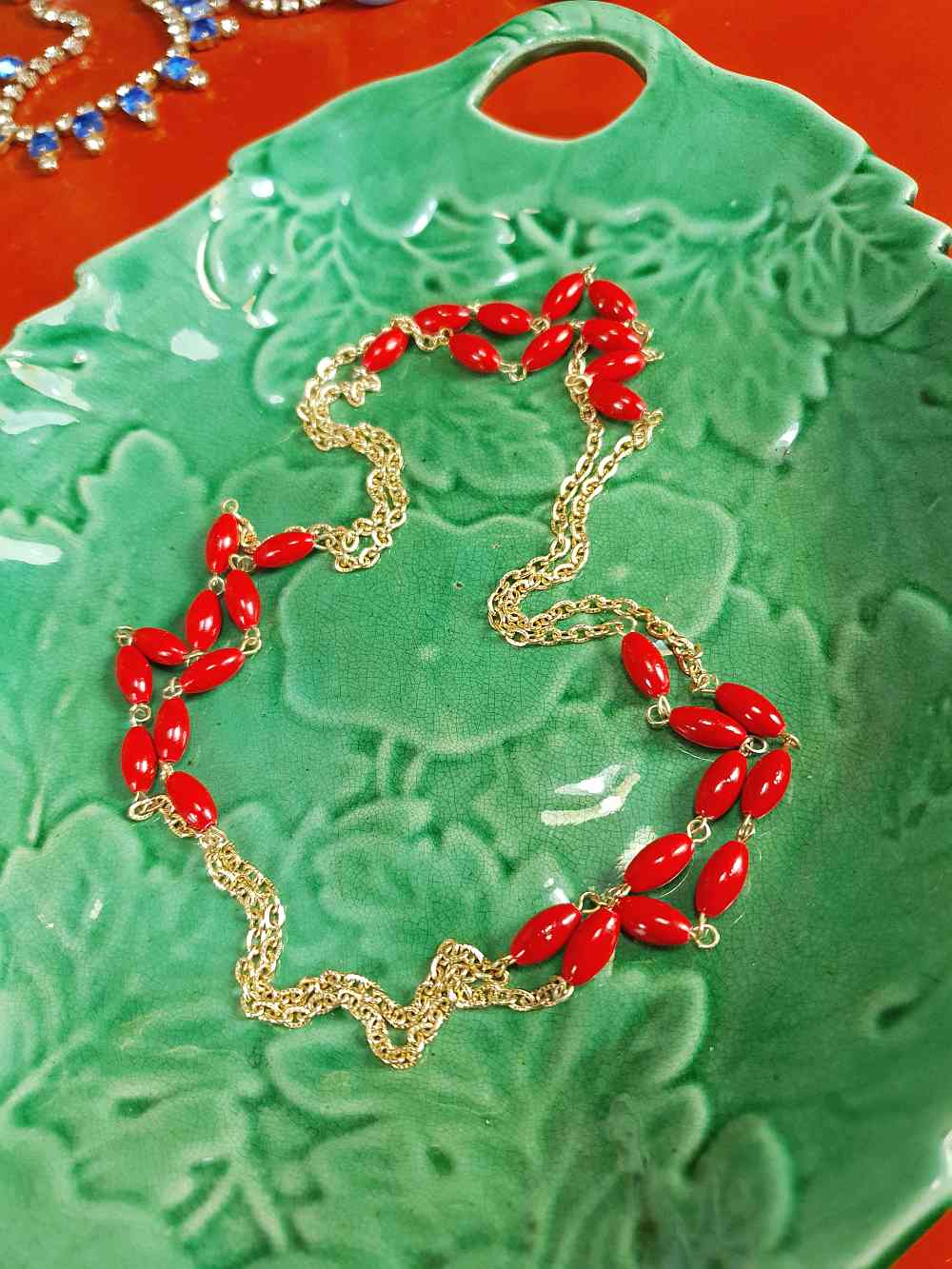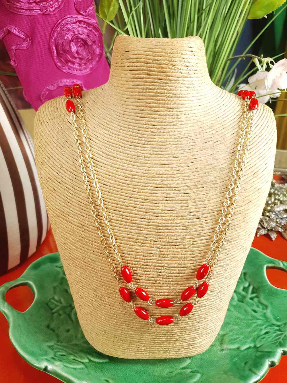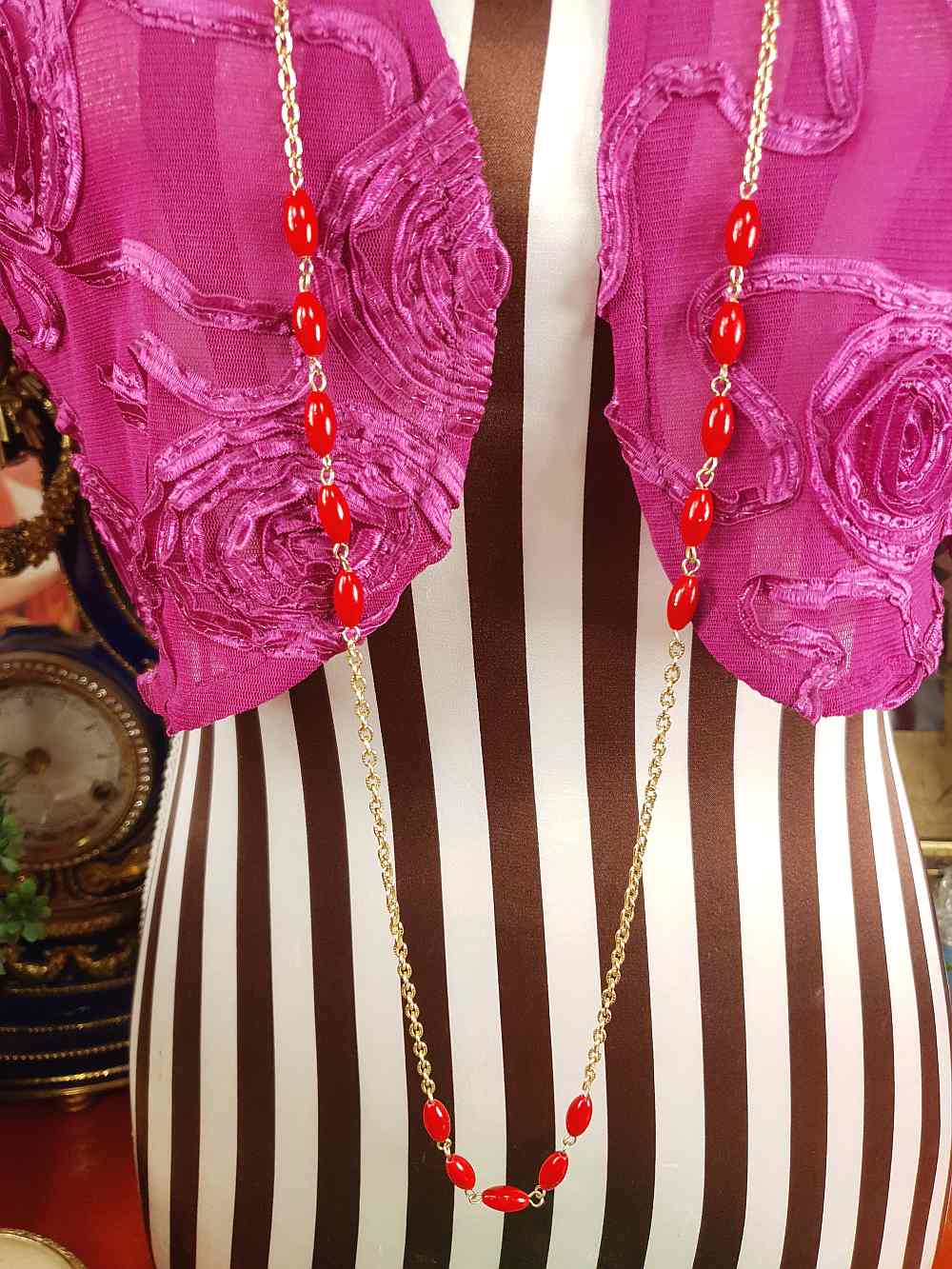 Vintage 1960s Red Bead Long Necklace 47" - Gold Tone Chain