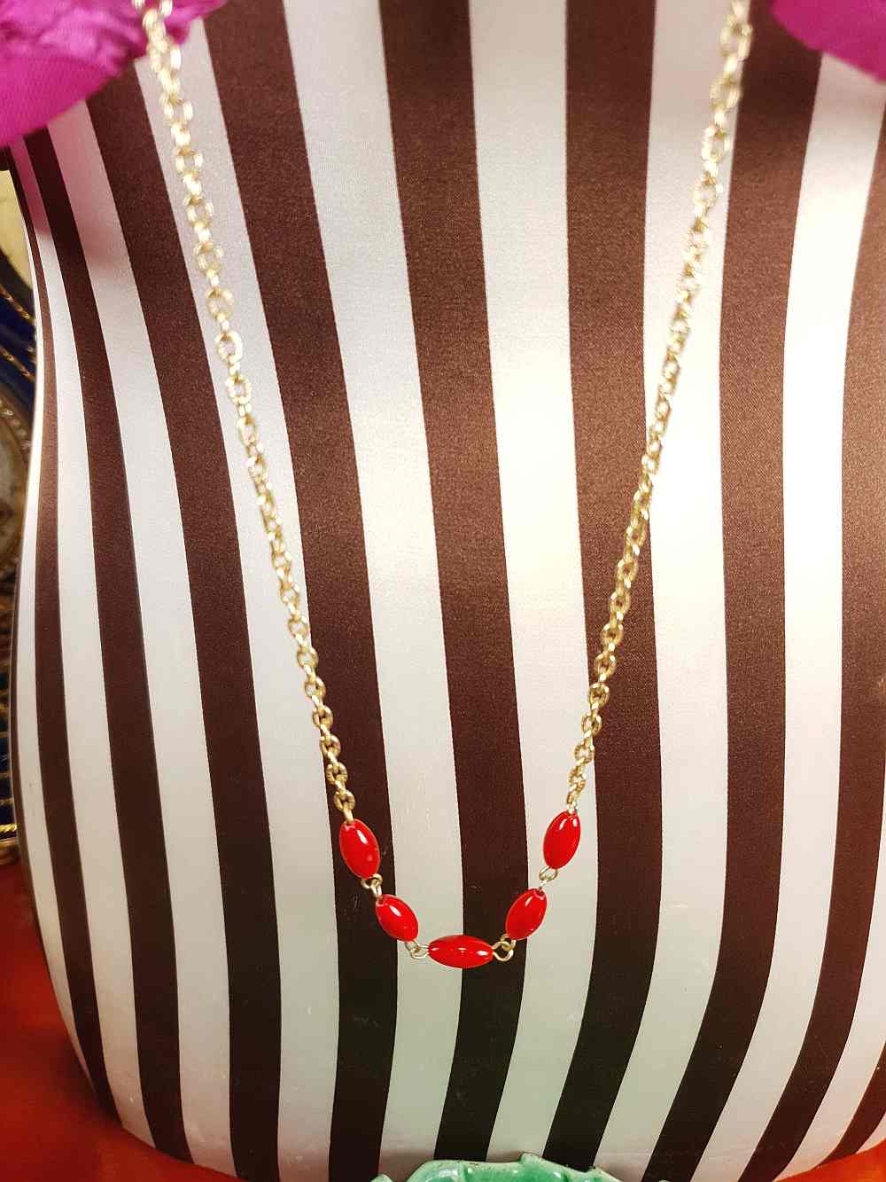 Classic vintage 60s long necklace with rich red resin beads in elongated oval form, threaded onto a polished gold-tone metal belcher chain. Over-the-head style for easy styling. A versatile vintage accessory, wear long or in layers.