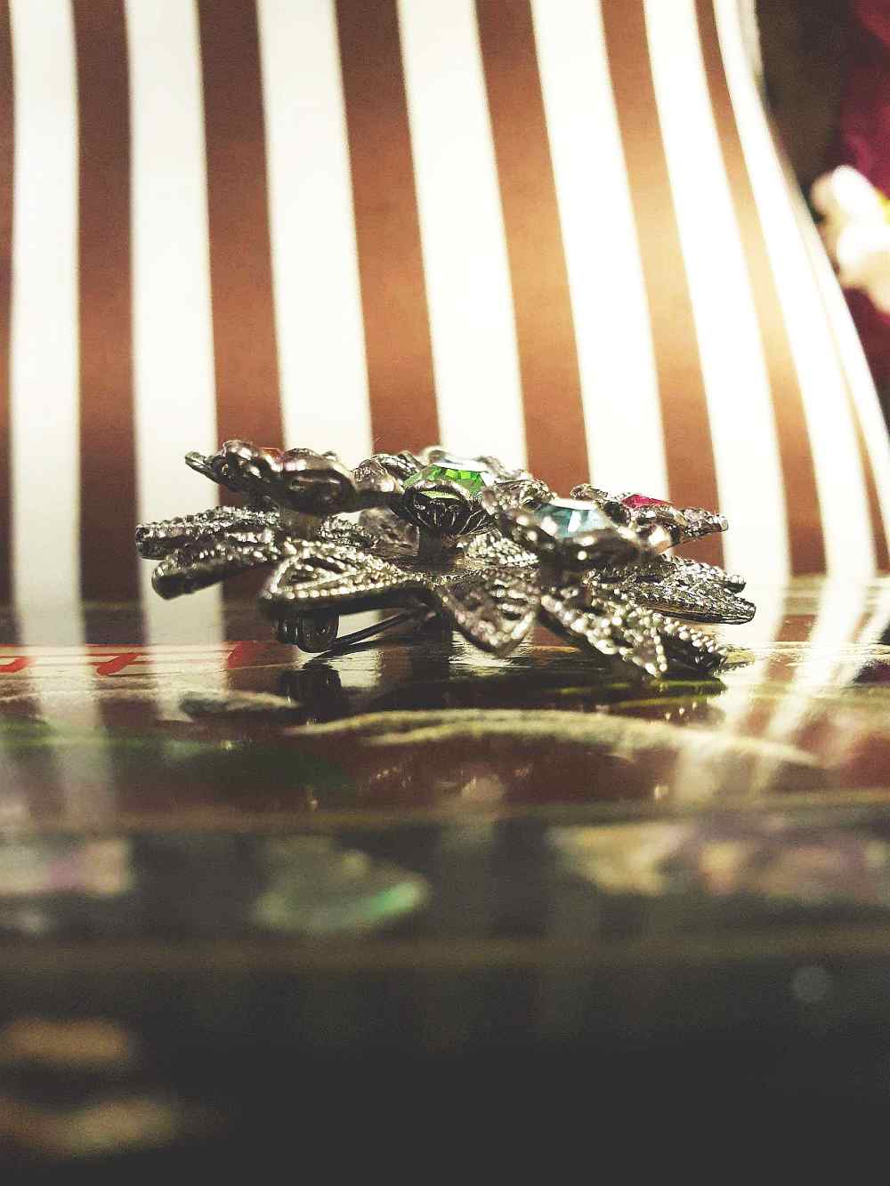 Experience timeless elegance with this Victorian revival vintage 60s flower brooch. Featuring a beautiful two-tier ornate filigree floral design, adorned with beautiful glass rhinestones in delicate shades of blue, pink, orange, green, and palest lilac set in dark silver-tone metal.