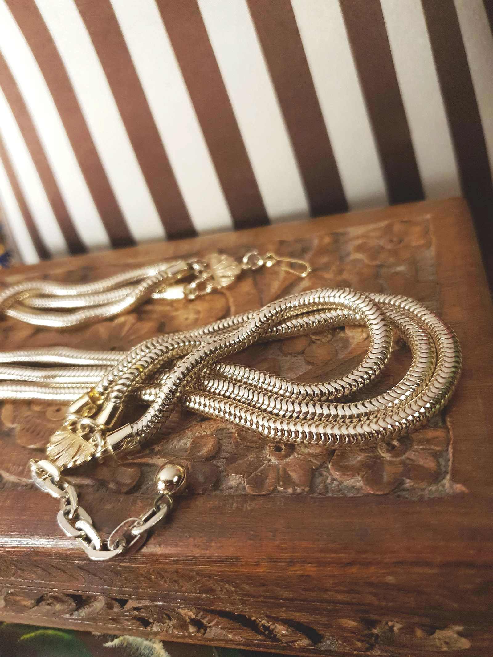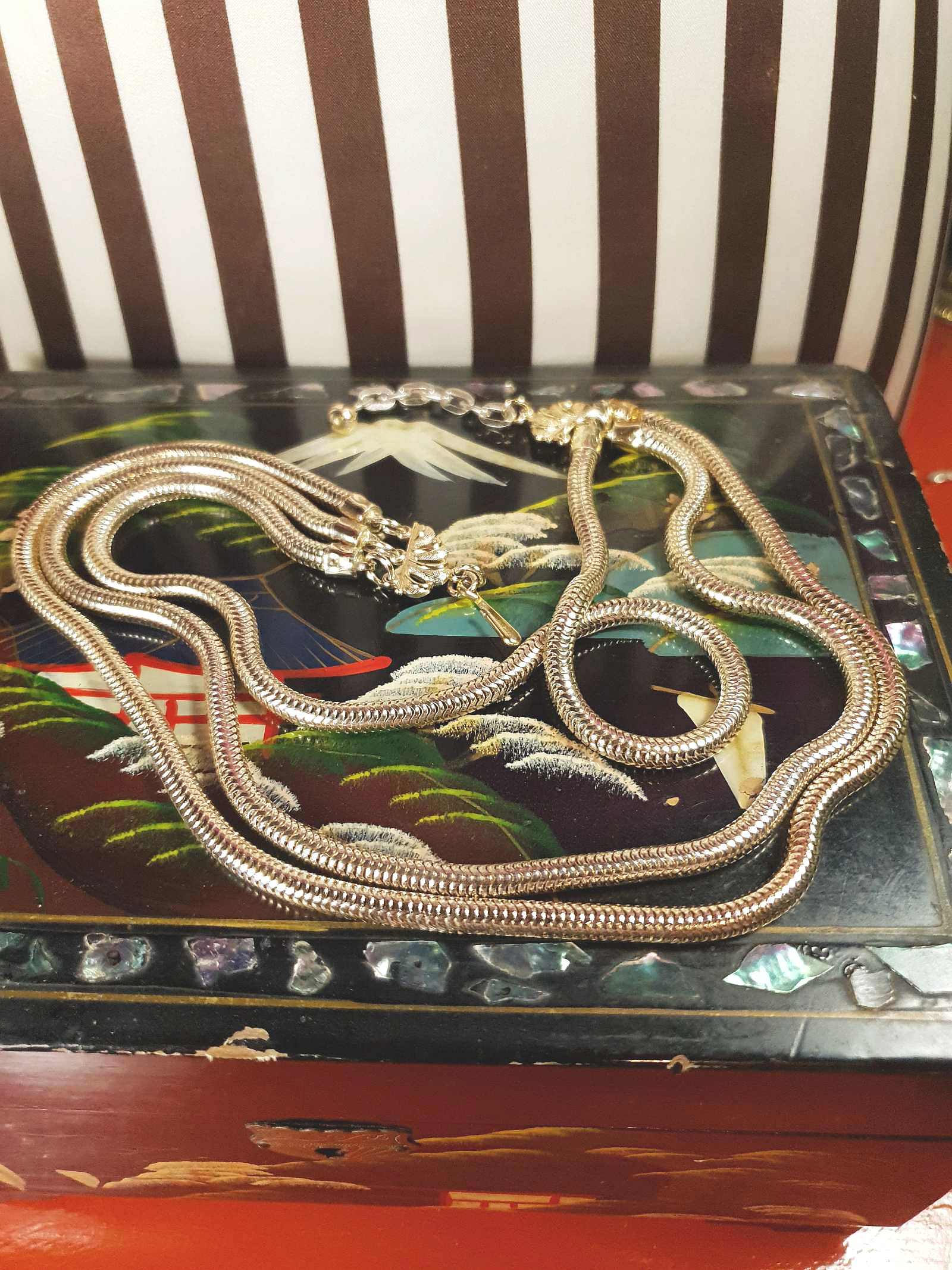 A classic necklace from the 60s featuring a three-tier snake chain design. Crafted with shiny gold-tone metal with a lightweight and slinky feel. Featuring an ornate swirl hook clasp with an extender for a customised fit.