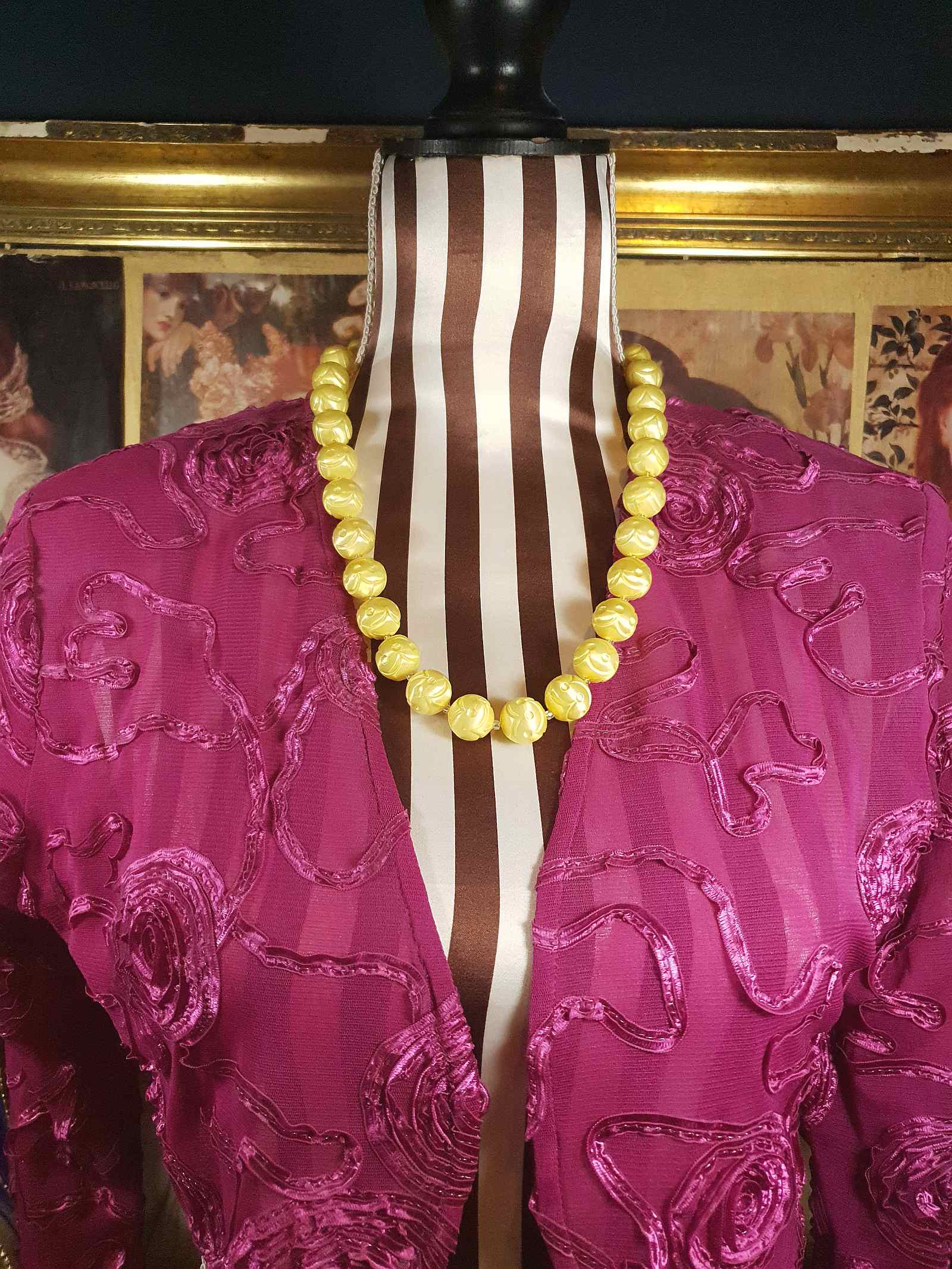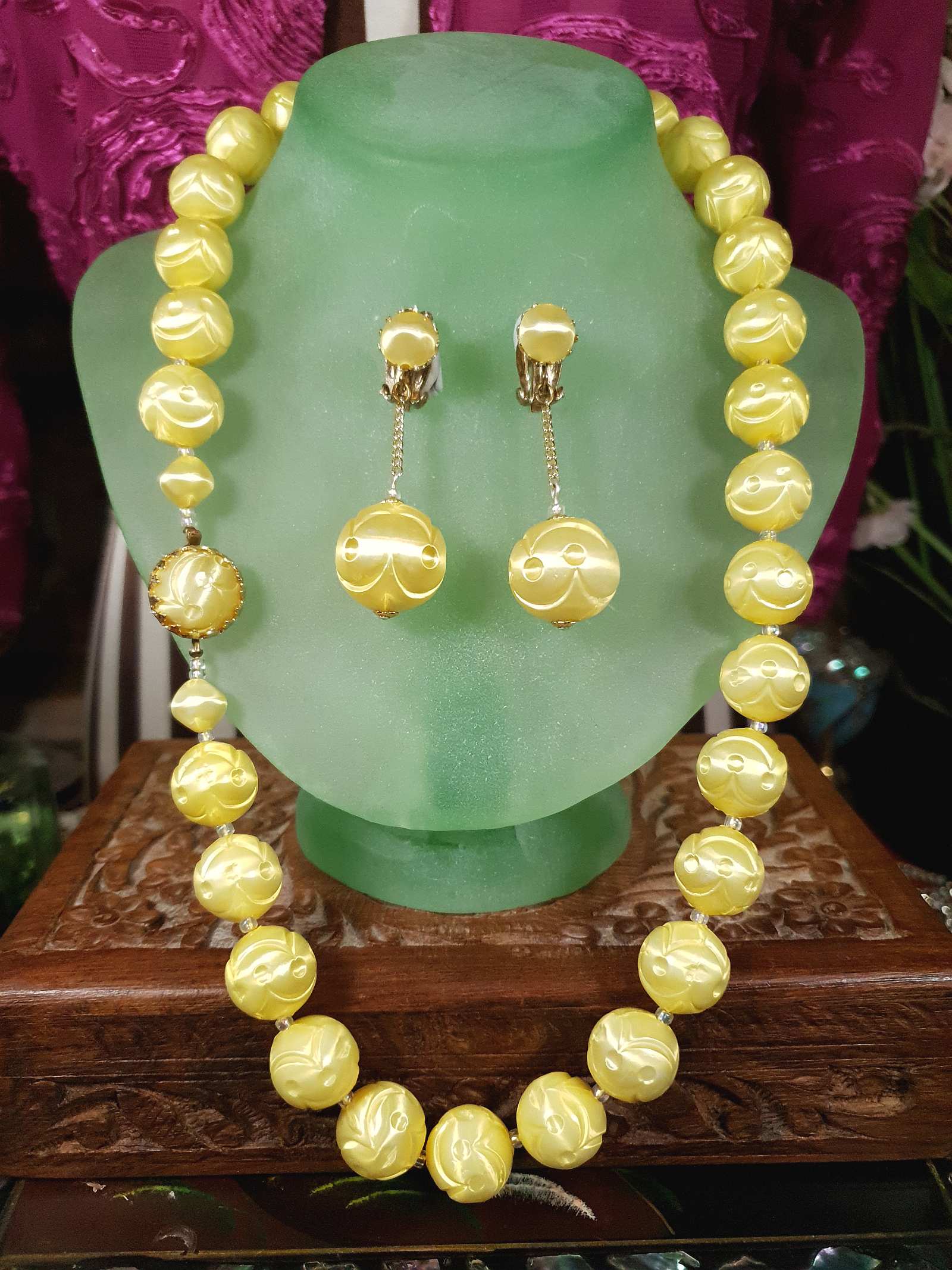 Brighten your vintage collection with this delightful and rare 50s demi-parure set, featuring a mid-tone yellow puff-bead necklace and matching clip-on earrings. The lightweight soft sheen beads, made of resin, are intricately designed with a swirl and dot pattern. The necklace is strung with alternating smaller clear spacer beads. Secures with an ornate round box clasp. The earrings dangle gracefully on delicate gold-tone chains, completing this harmonious set. This set is signed "Japan," and reflects the vibrant style of the era.