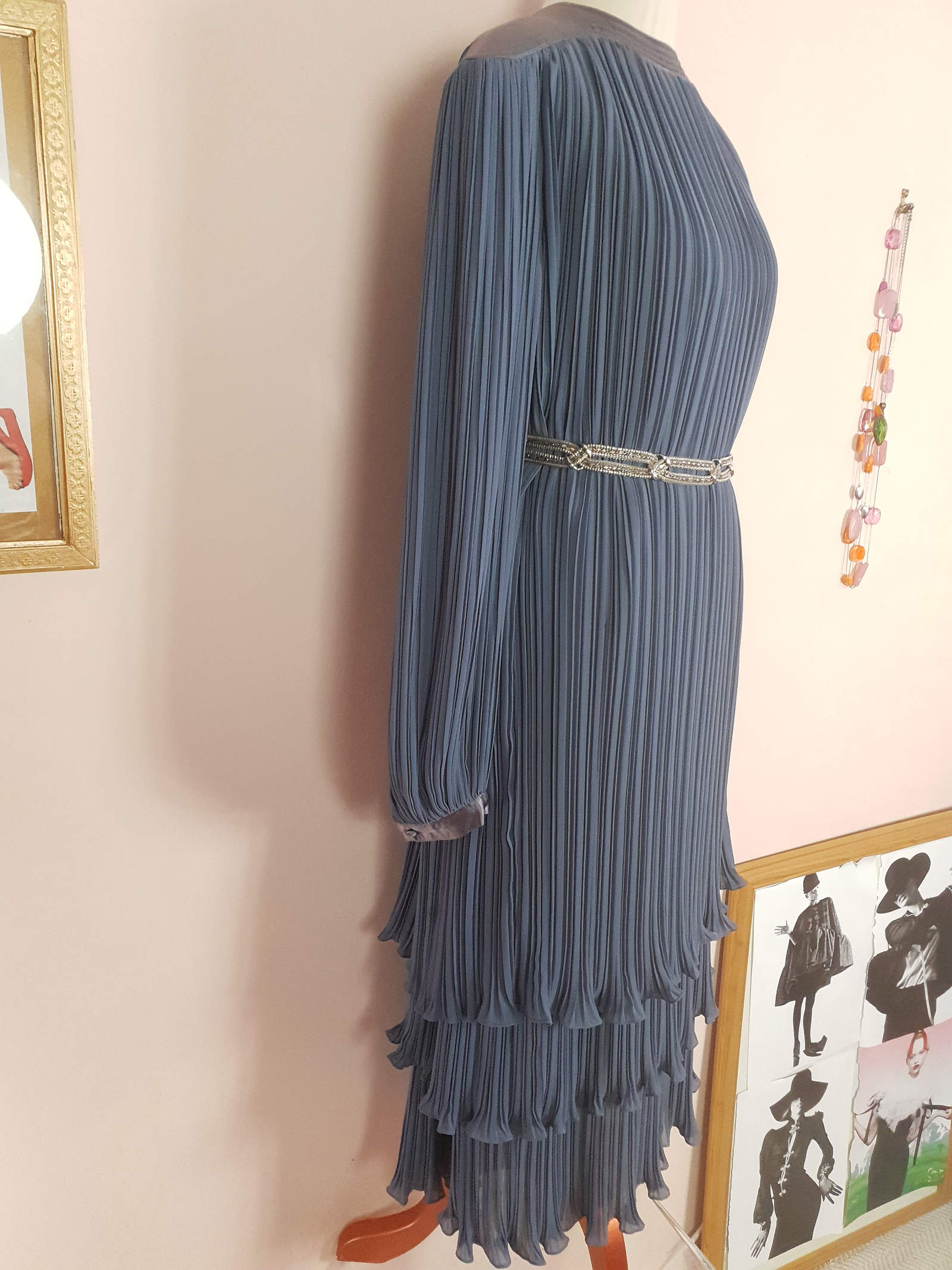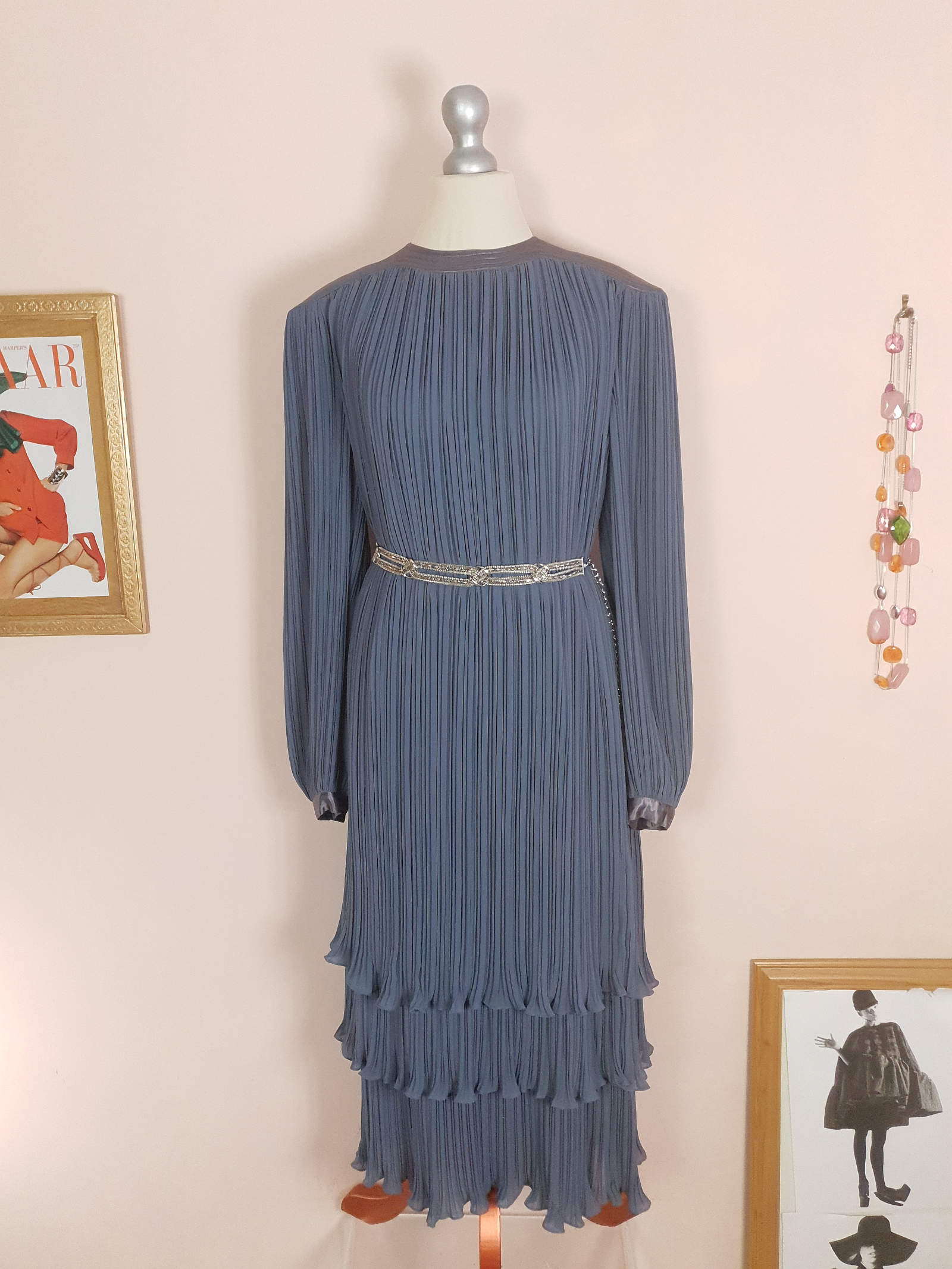 Transport yourself to the fashion of the 70s with this beautiful grey pleated vintage dress from Parigi. The chiffon and satin fabric combine for a floaty, layered look while the bishop sleeves add a stylish silhouette. Perfect for any occasion. Style with a belt (not included) or hang loose!