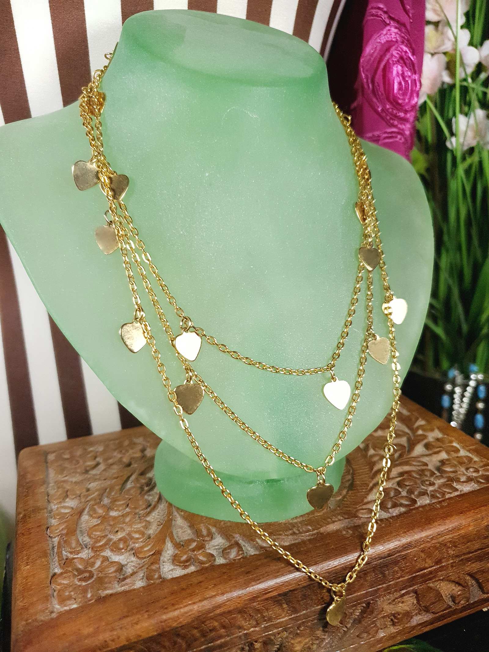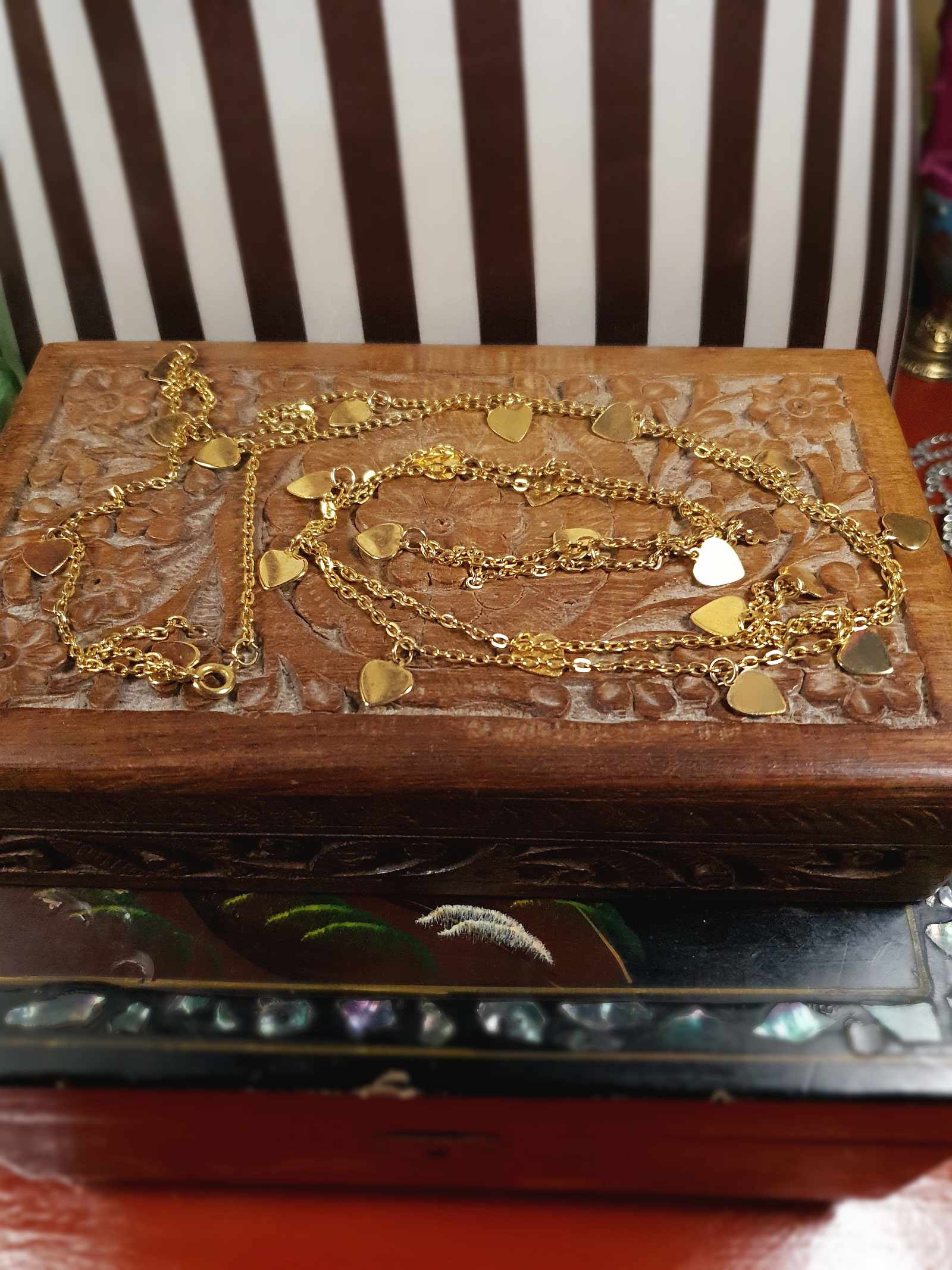 This vintage 70s long heart chain necklace exudes retro charm and is crafted with gold-tone metal hearts on a cable link chain. Versatile wear, can be worn long or in a variety of different ways. Spring ring clasp closure.