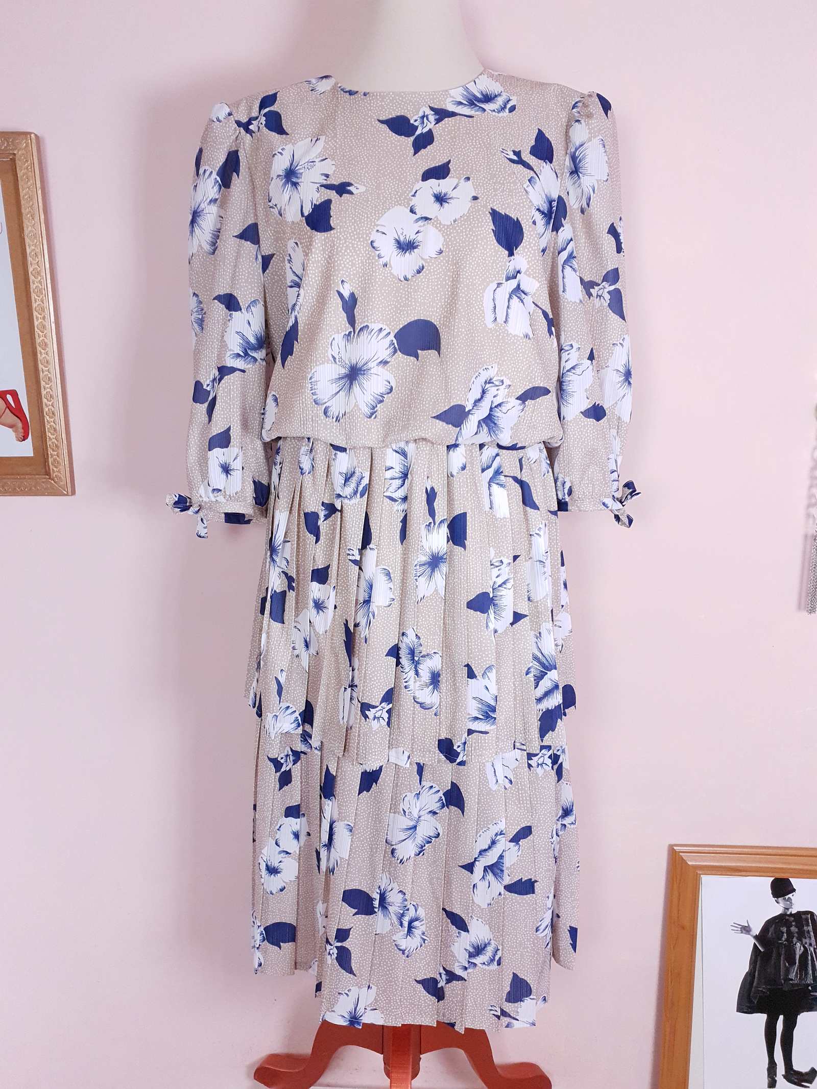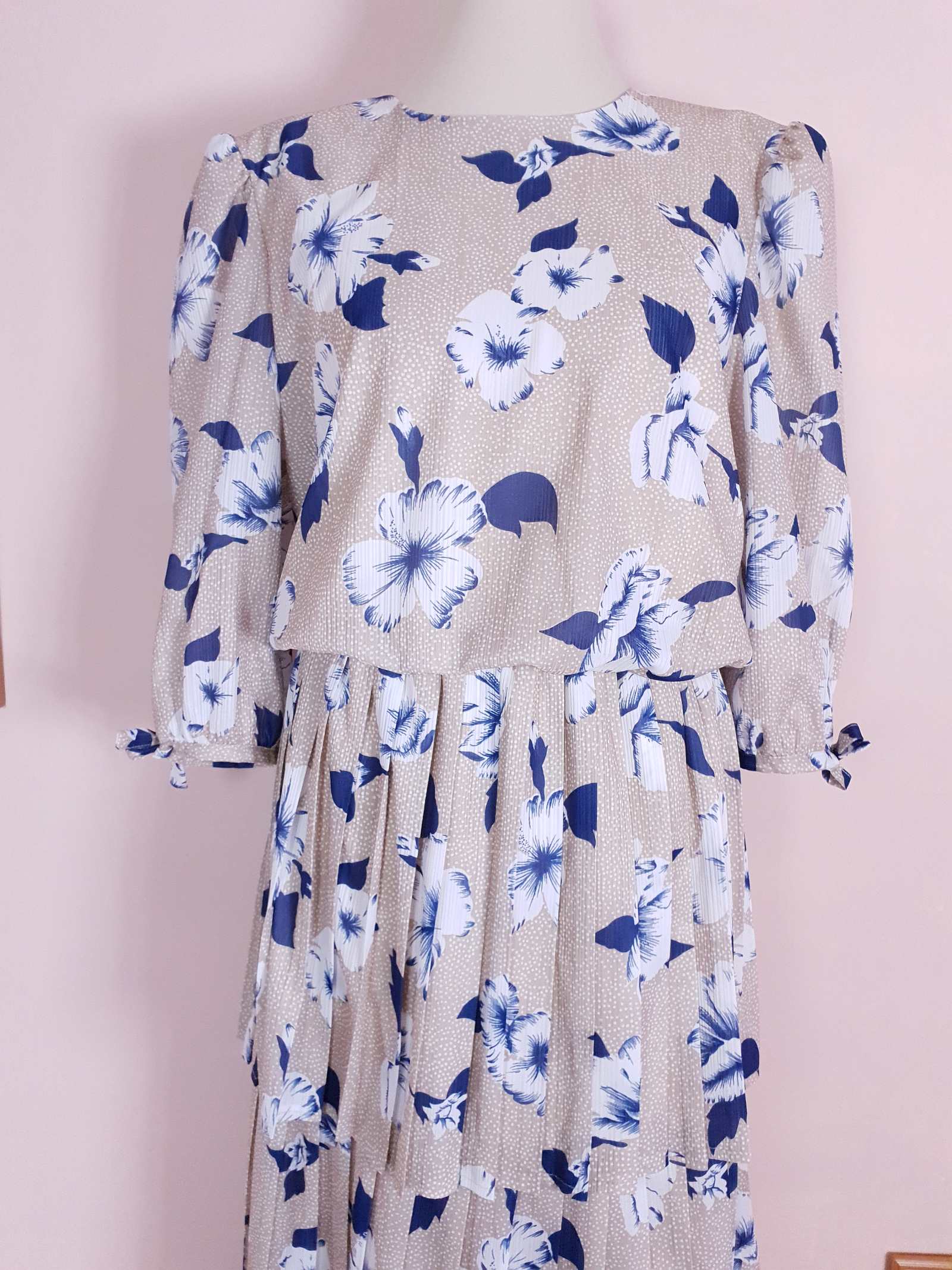 A cute 70s dress tailored with a lightweight fabric of blue and white flowers against a beige and white polka dot background. Featuring a two-tier pleated bottom of the dress and three-quarter sleeves with bow tie fastening.
