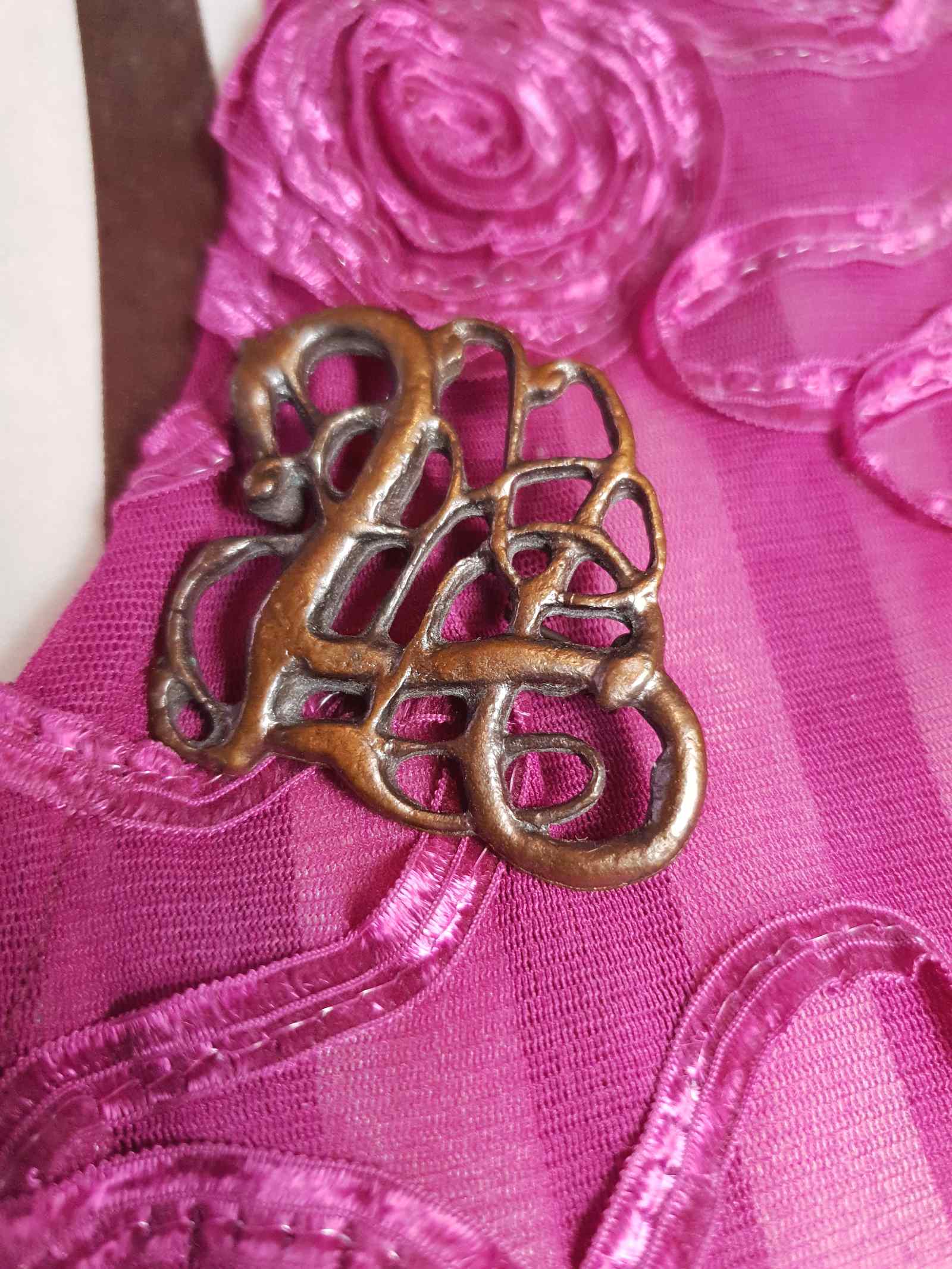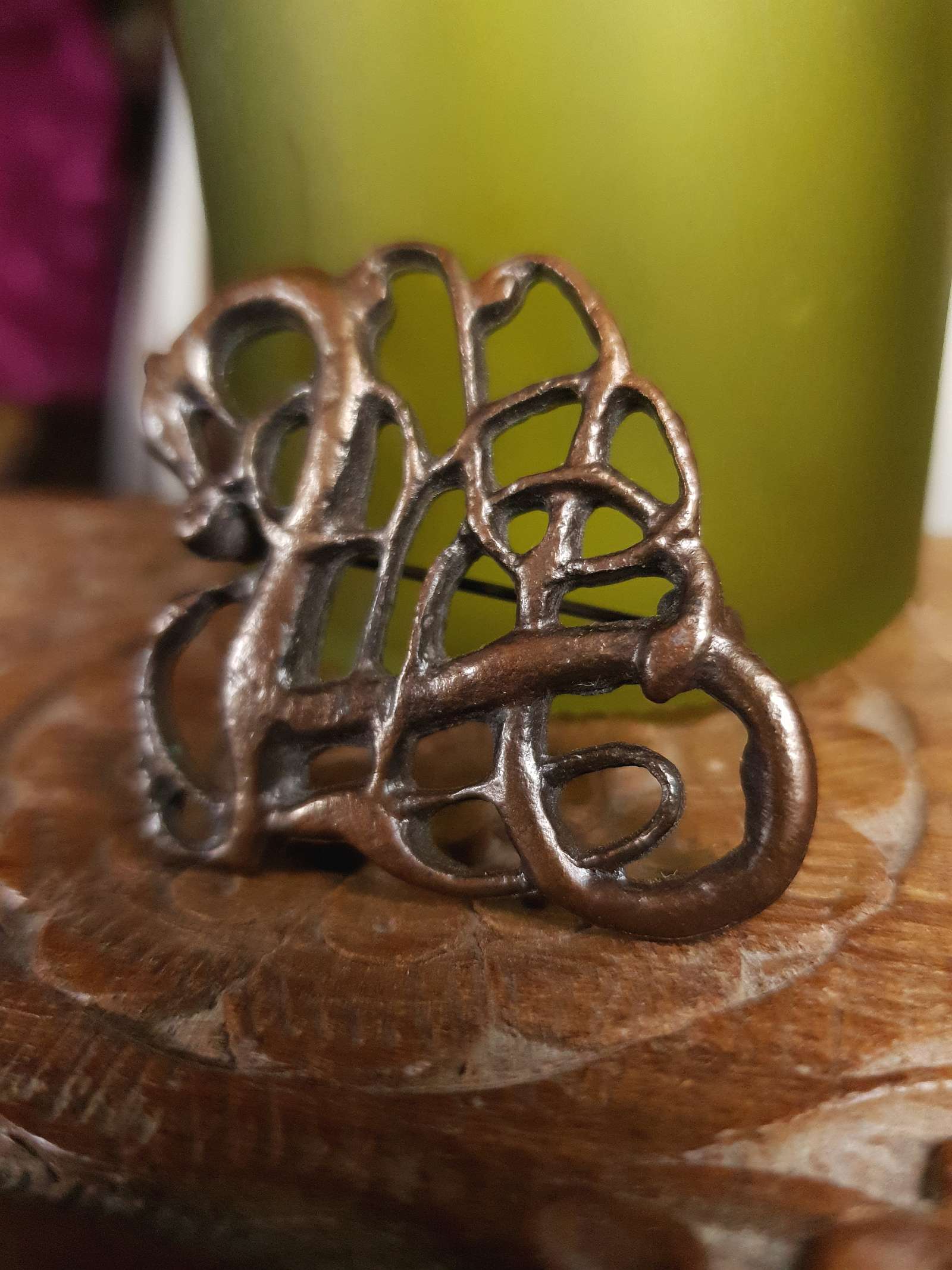 This vintage 1970s Viking dragon Urnes design brooch is handcrafted with a coppery bronze metal. The Urnes design combines elements of curved thick and thin swirly interlacing patterns featuring a dragon. Signed BMP, British Museum Penannular. The original design of this brooch is from the Viking age.