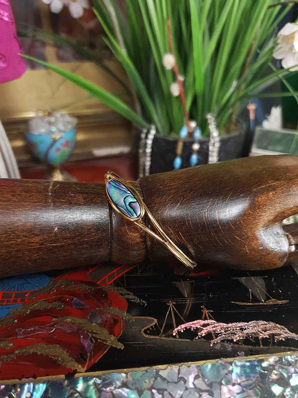 A simple and elegant vintage 80s bangle with gold plating and an oval abalone shell that beautifully shimmers in luminously iridescent hues of blue, green, and purple.
