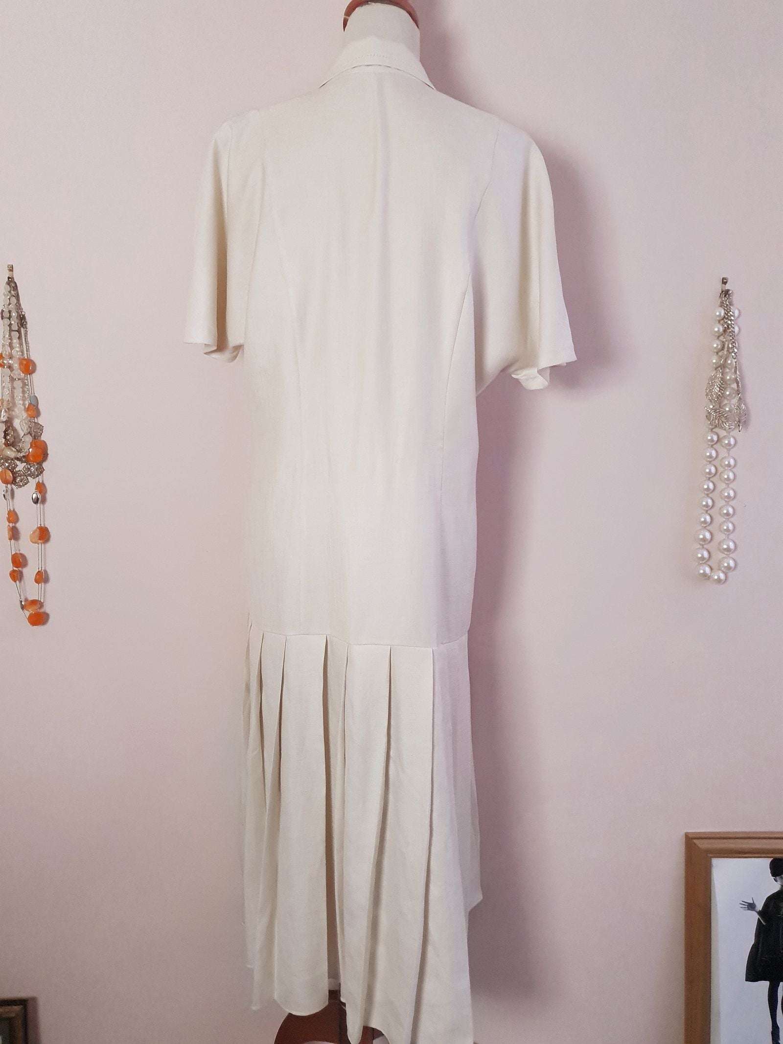 This vintage 80s cream pleat dress is elegantly tailored, featuring a chest pocket and pearlesque button details. It's dotted lined detailing on the lapel and pocket adds a unique touch to the classic 80s style design.