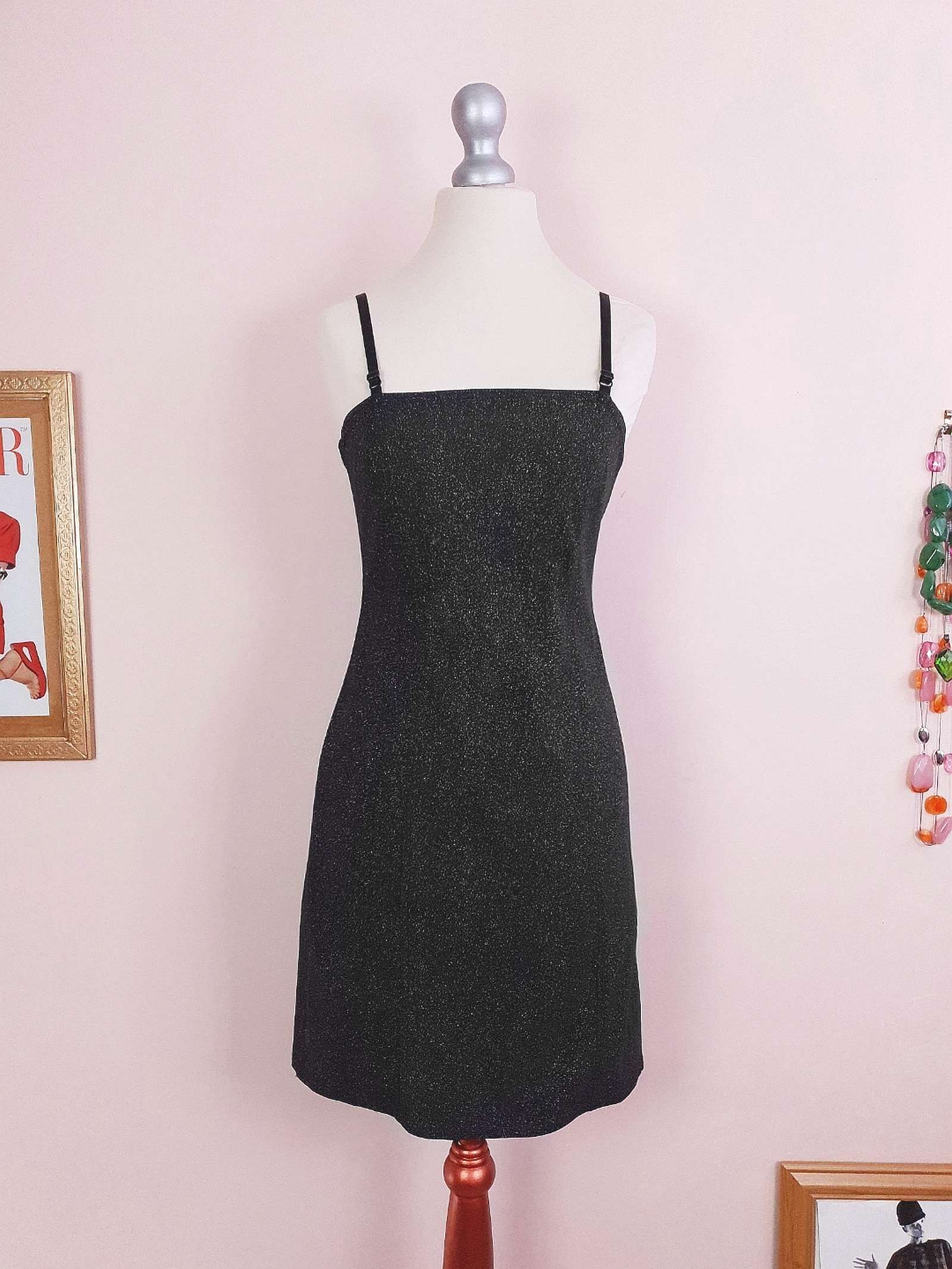 This vintage 80s black glitter dress is tailored with black glitter fabric. The bodycon stretch design hugs your curves, and the adjustable spaghetti shoulder straps provide a comfortable fit.