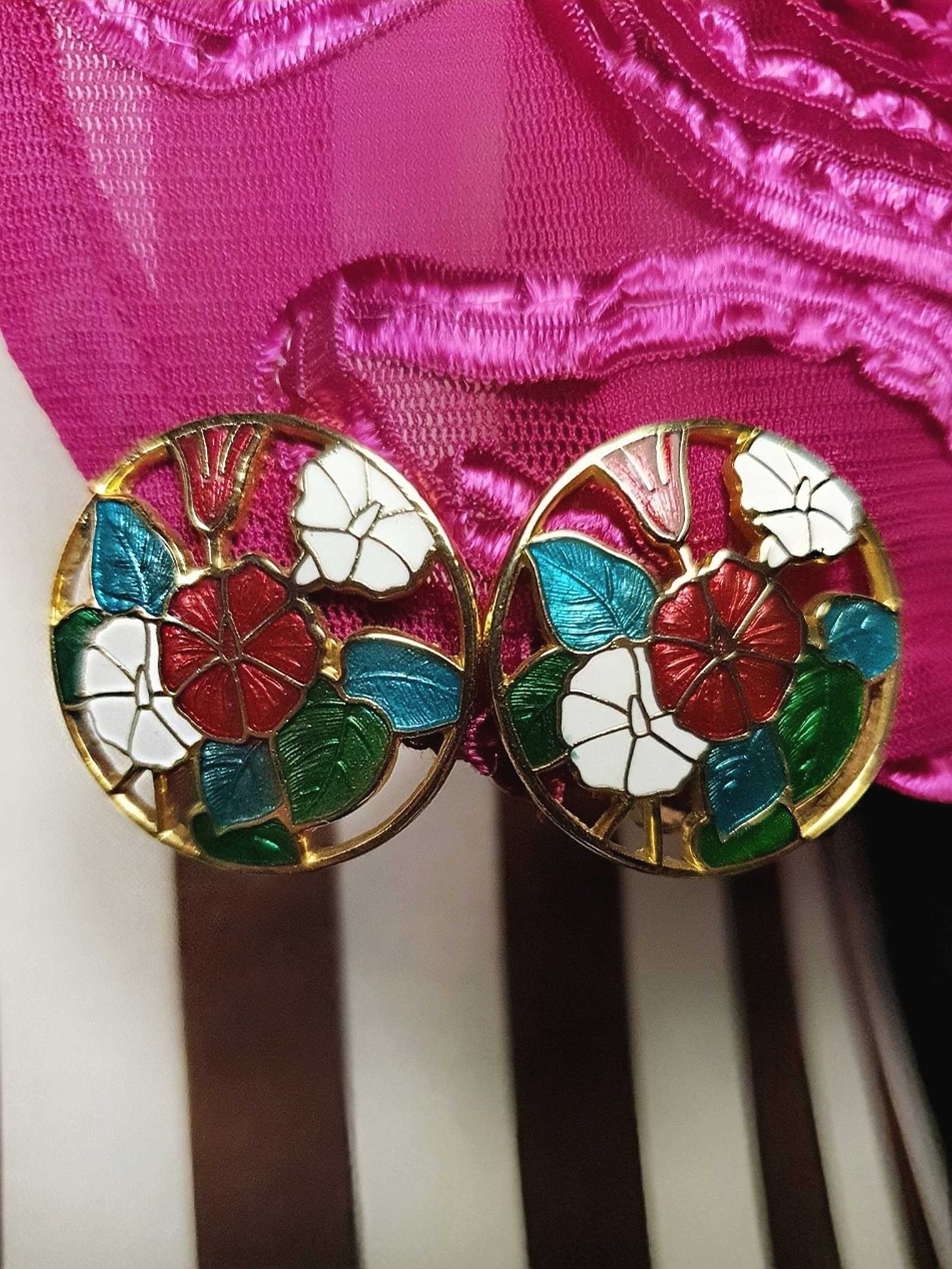 Vintage 1980s Cloisonne Floral Earrings Clip-On Flower Retro