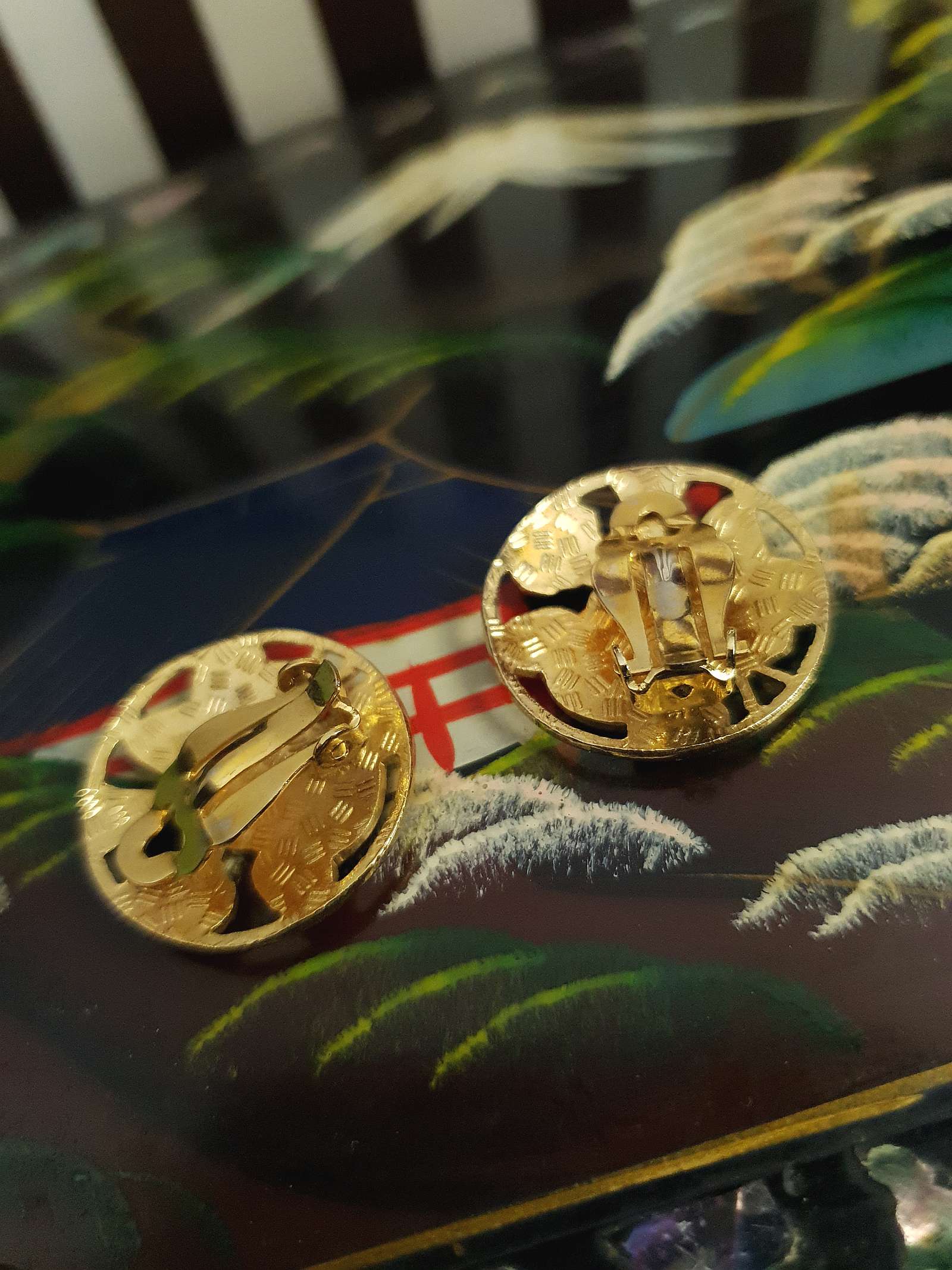 Expertly crafted in the 80s, these round vintage cloisonne floral earrings feature a beautifully intricate red and white floral design with green leaves, set in gold-tone metal. Finished with a clip-on fastening.