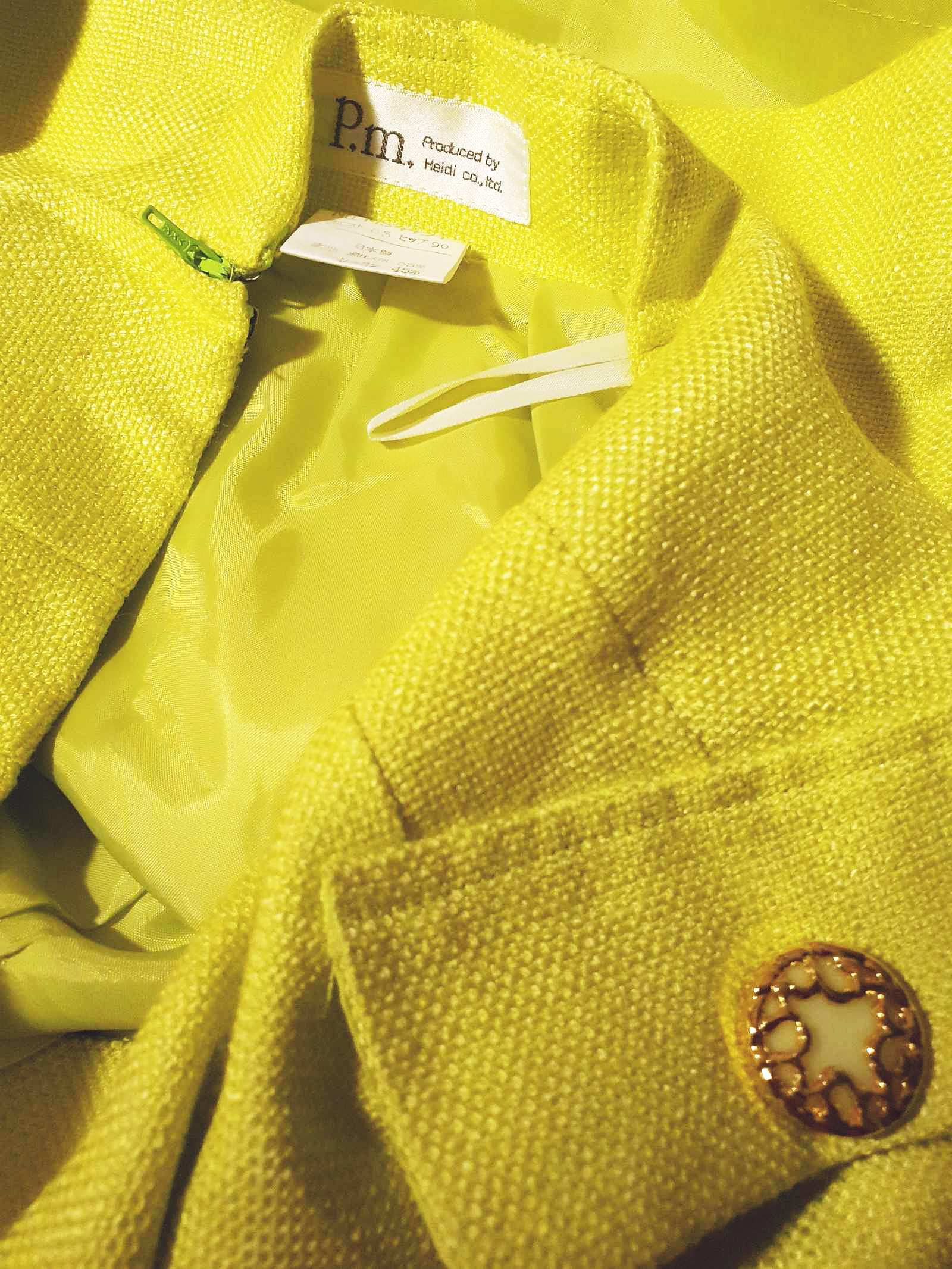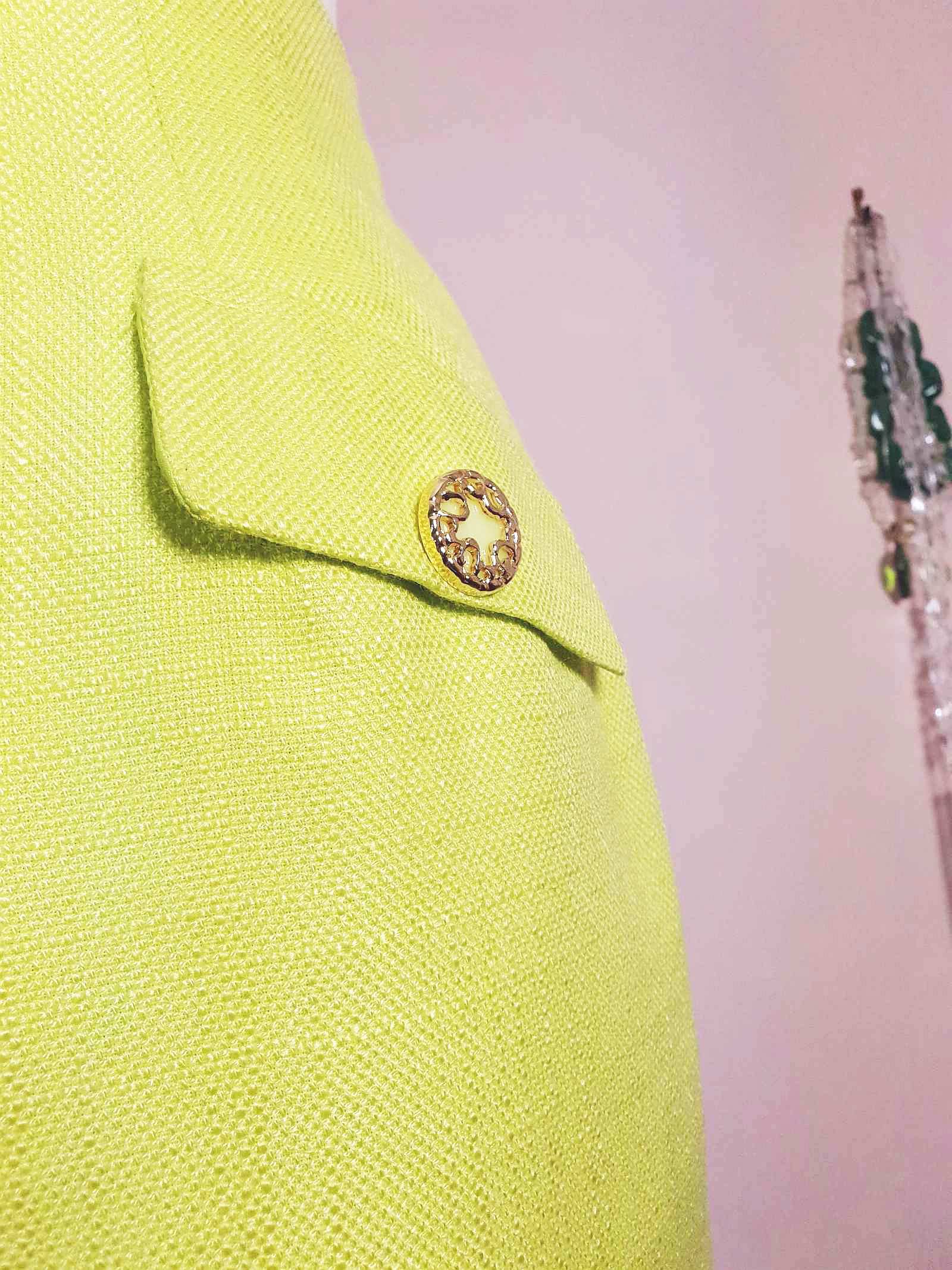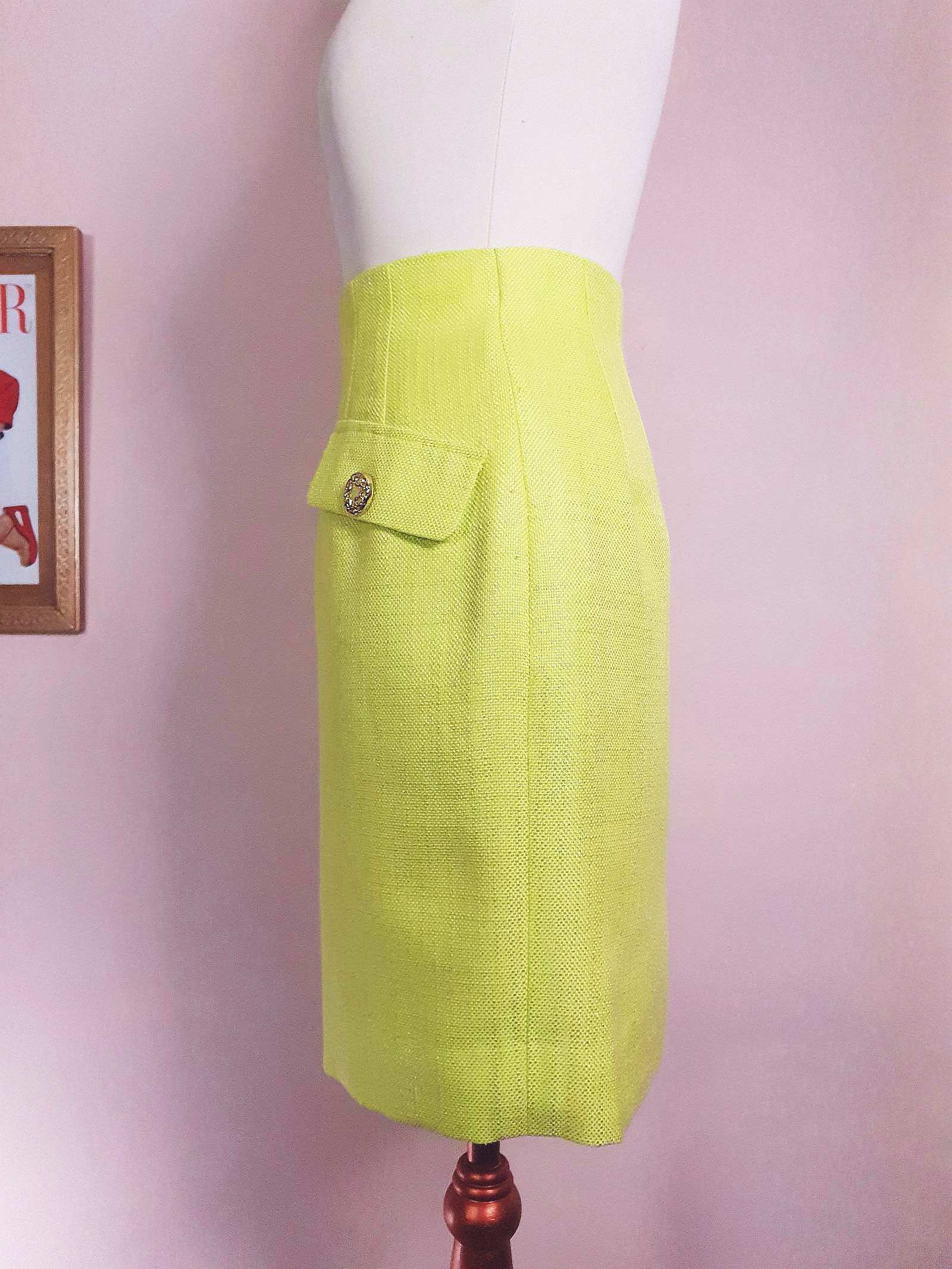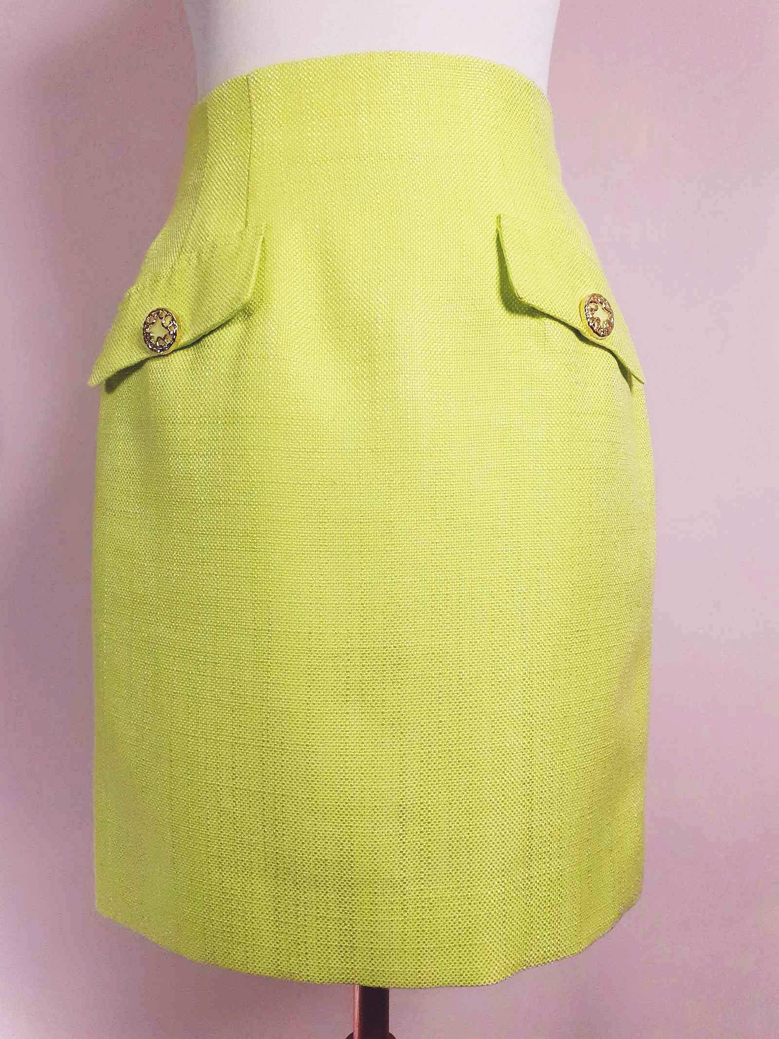 This vintage 1980s lime green mini skirt was tailored in Japan, featuring faux flap pockets with ornate gold and lime green buttons. With a back zip, eye and hook closure, it's fully lined with lime green fabric. Perfect for adding a touch of retro charm to any outfit.