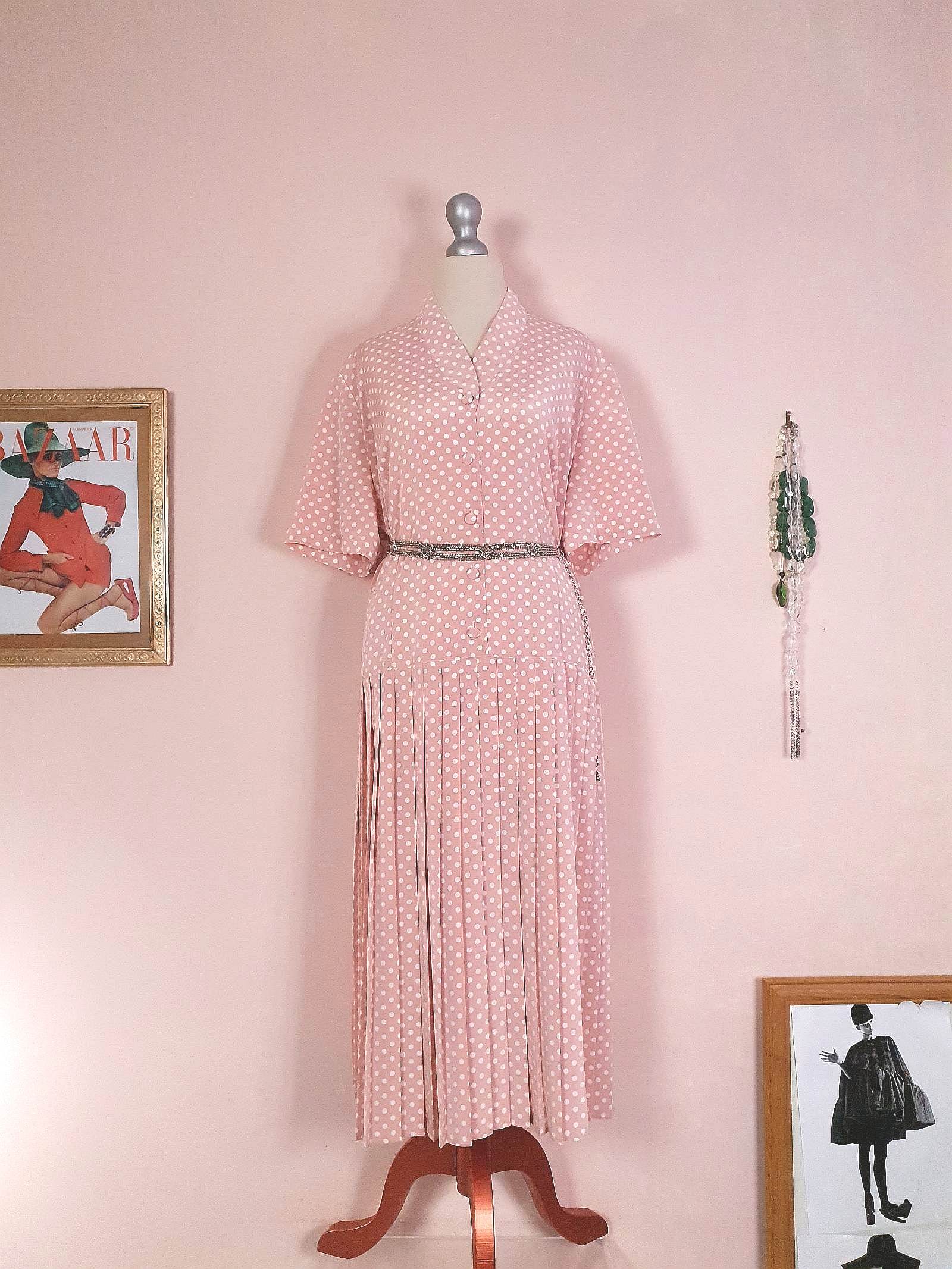 This pretty vintage 80s pale pink pleated dress is made from soft rayon satin in a pale pink hue, this dress features a cream polka dot print, fabric button front closure, a drop waist and pleated bottom half. Styled with a belt, not included.