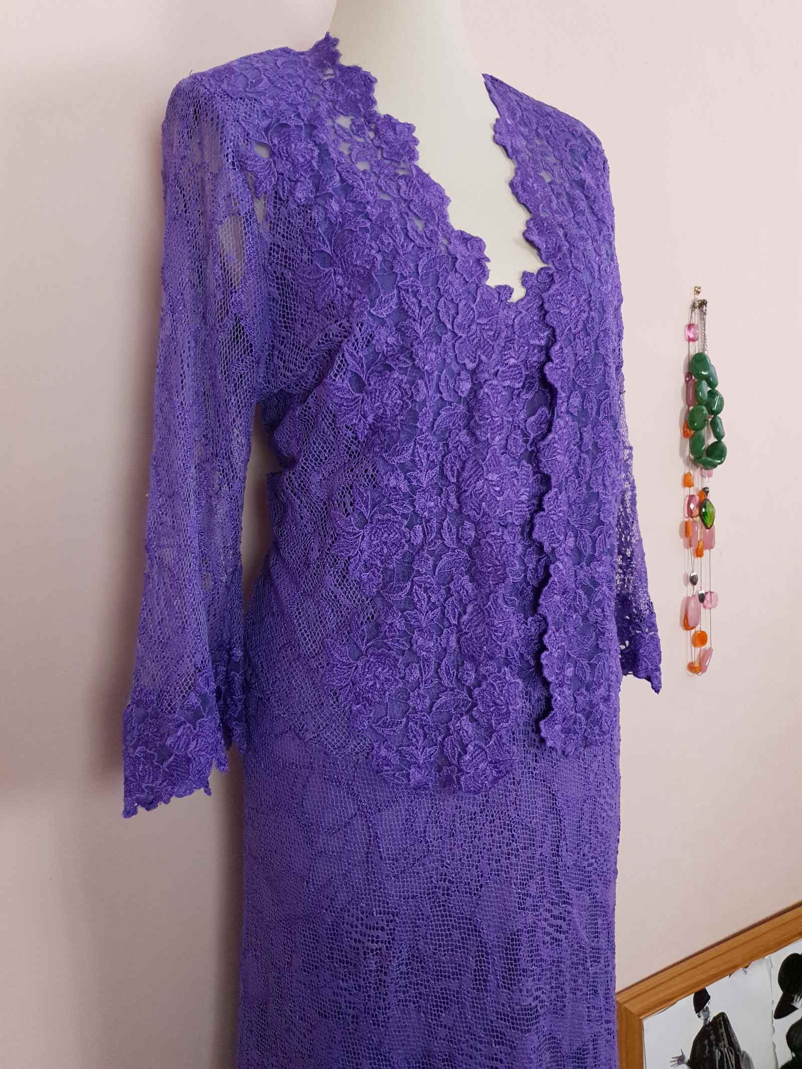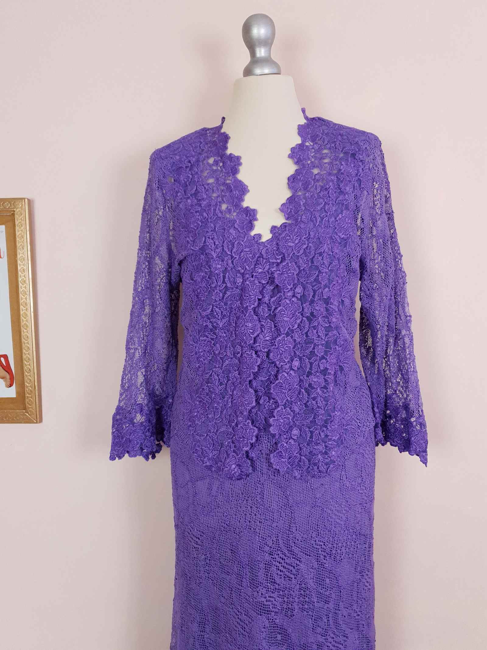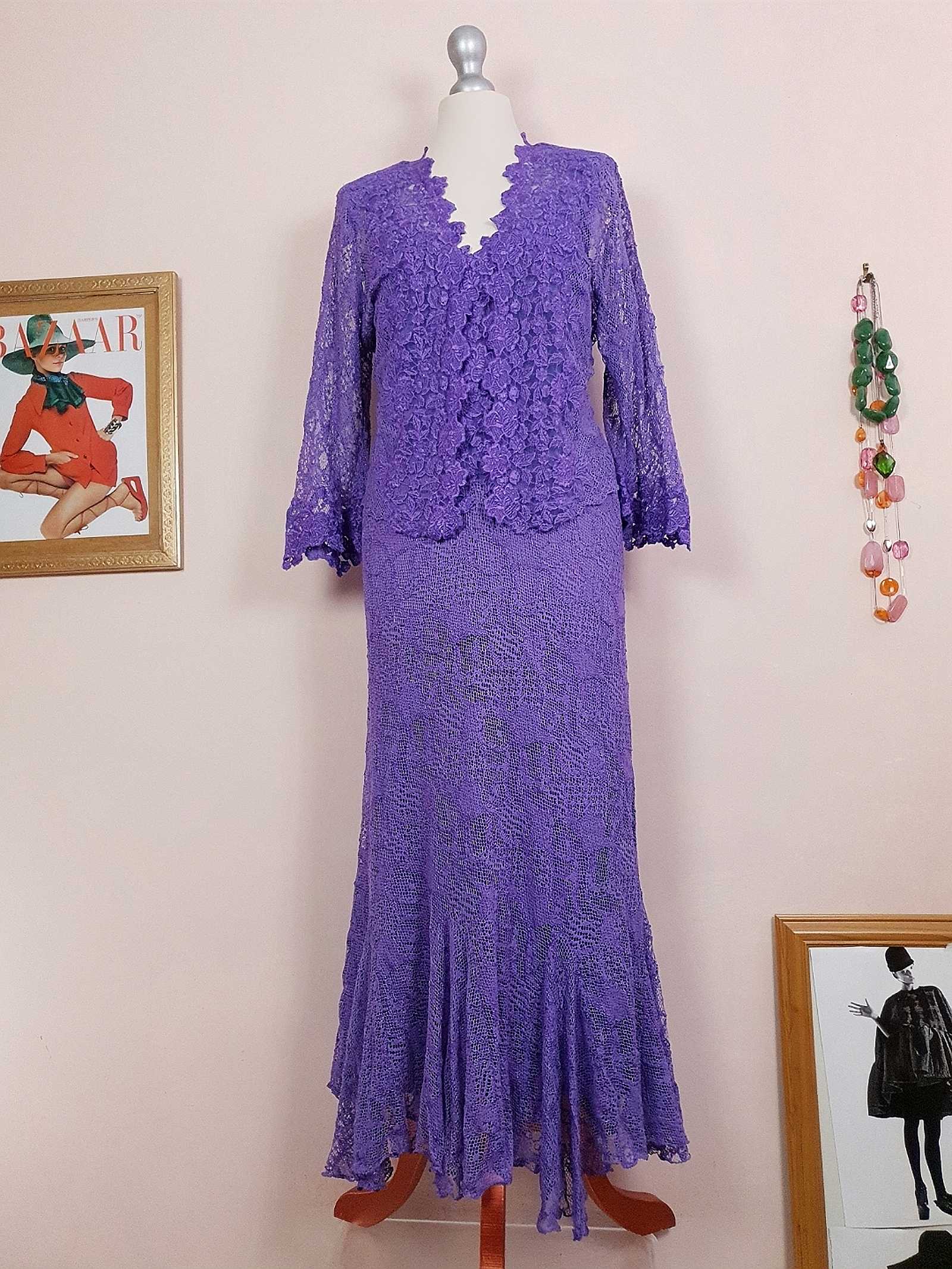 Vintage 1980s Purple Lace Dress Suit Jacket Lilac Cocktail Evening Maxi - Size 14 - 16