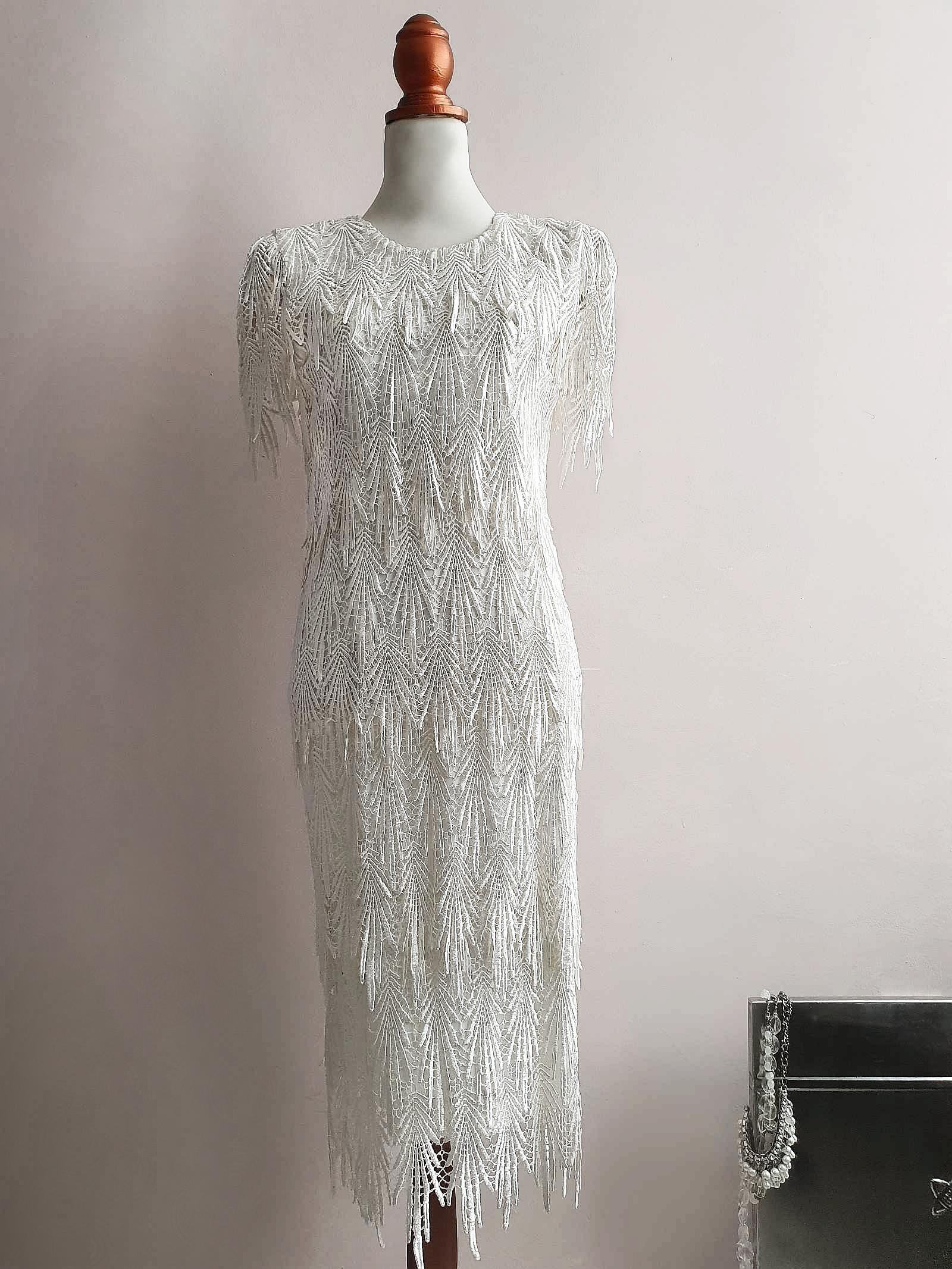 This vintage 80s white layered lace dress features shoulder pads and a tailored construction with elegant lace pattern mesh layers, creating a timelessly classic look (also good for twirling!). This one-of-a-kind vintage piece is perfect for any special occasion.