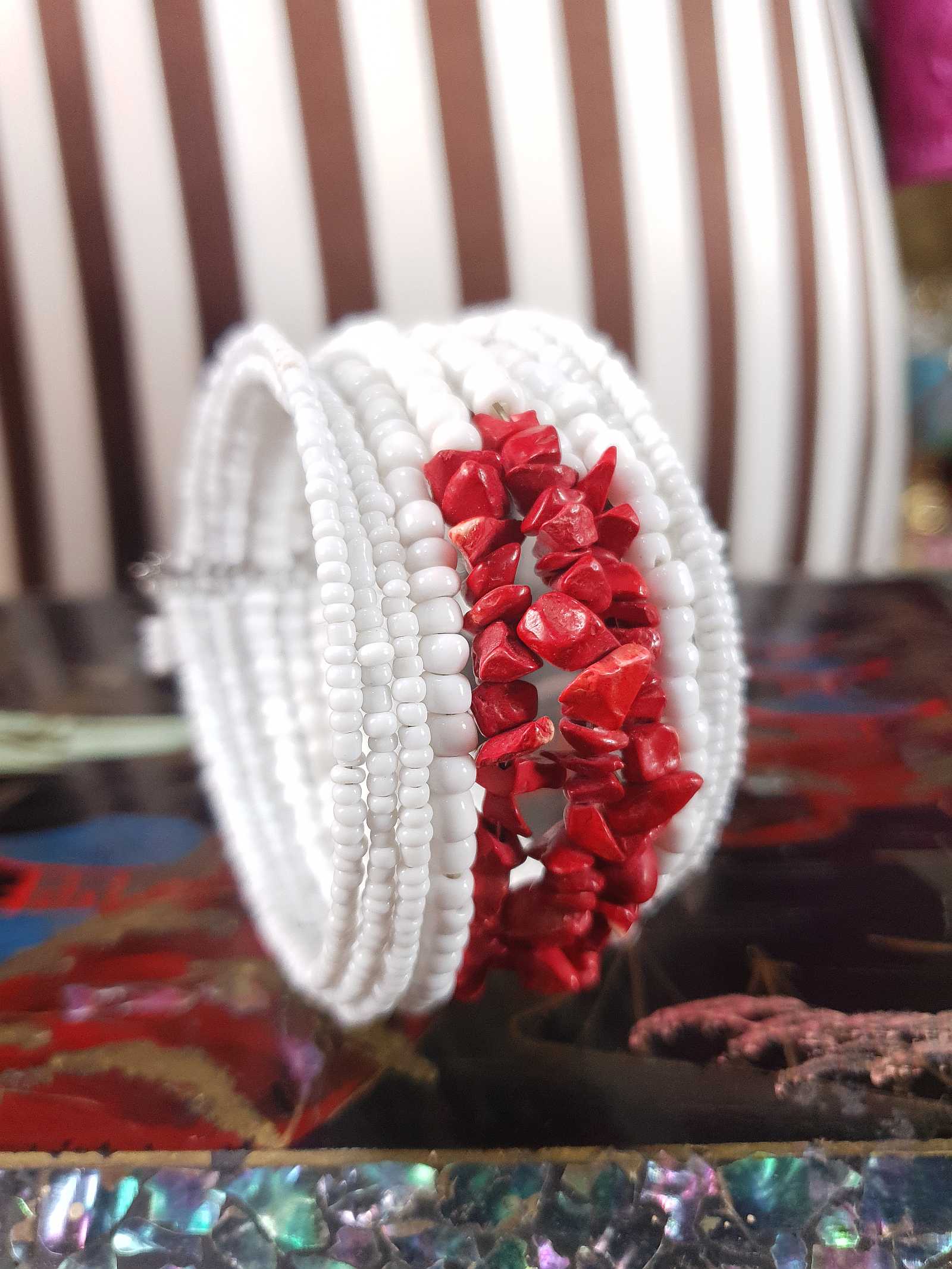 Striking vintage 80s cuff bracelet featuring white glass beads paired with bold red ceramic accents strung on memory wire, giving it structure. This bohemian bangle captures the free-spirited aesthetic of the era with its distinctive colour contrast and artisanal beadwork. Perfect for layering or wearing solo, it brings vintage character to any ensemble.