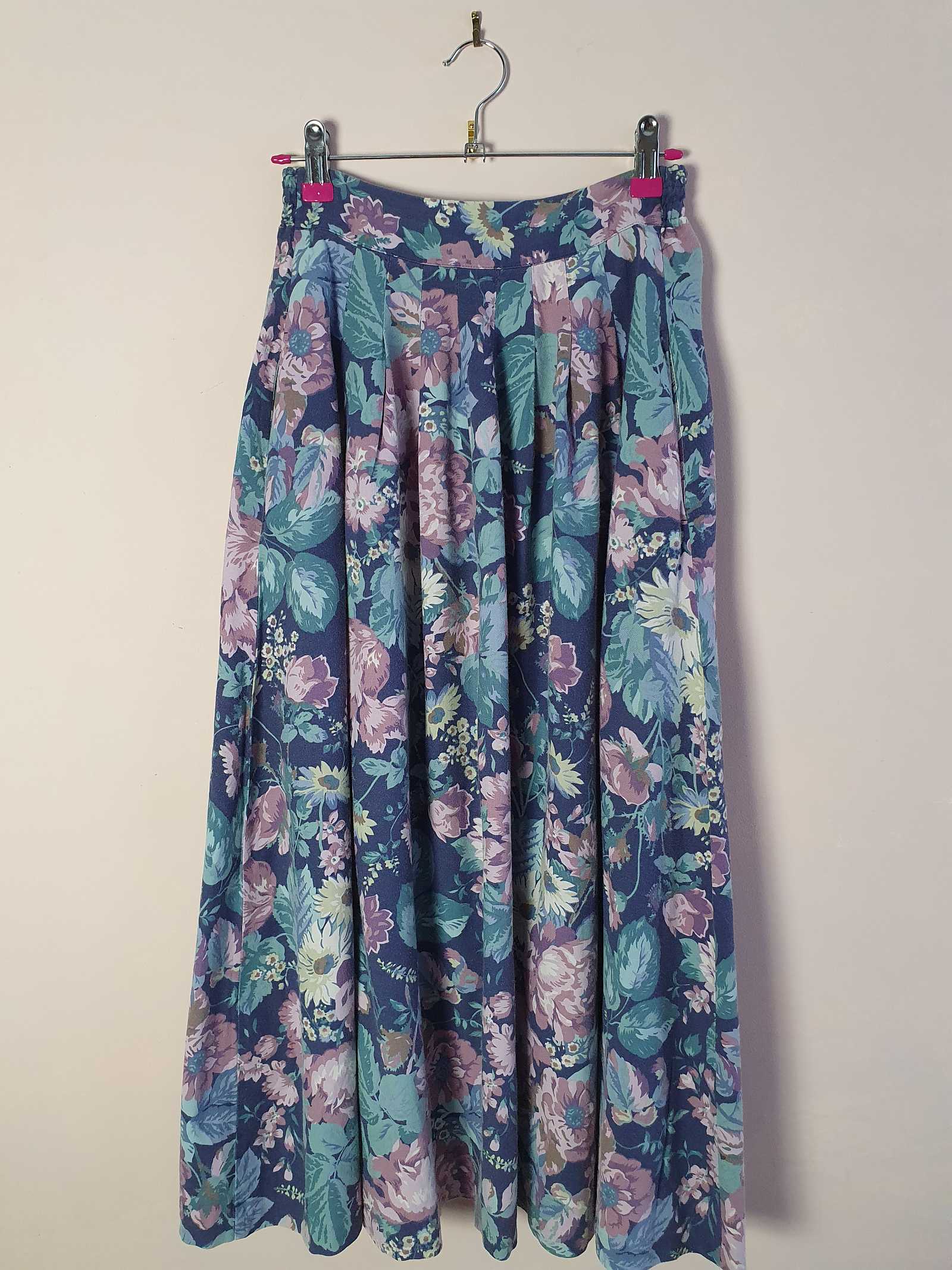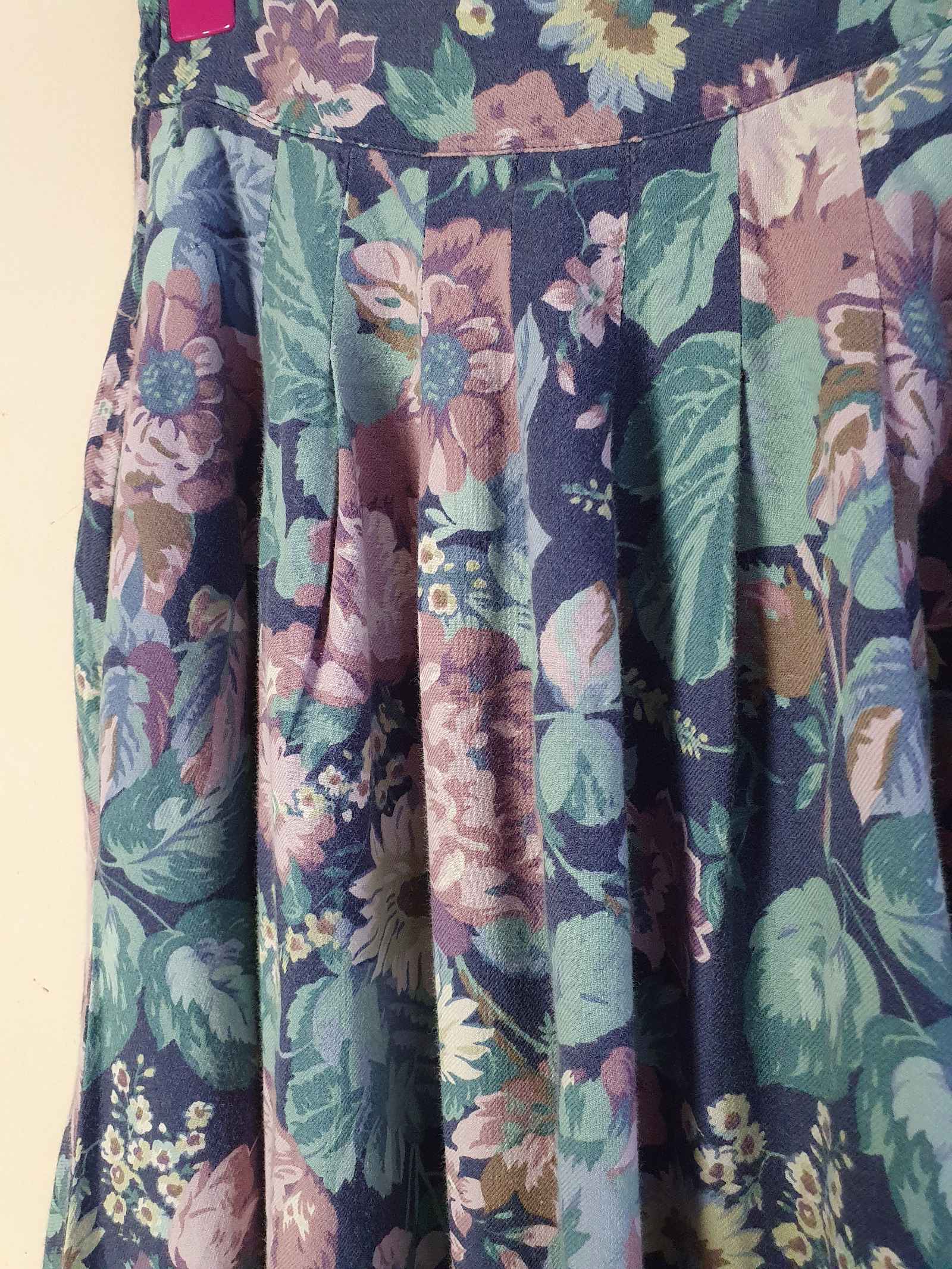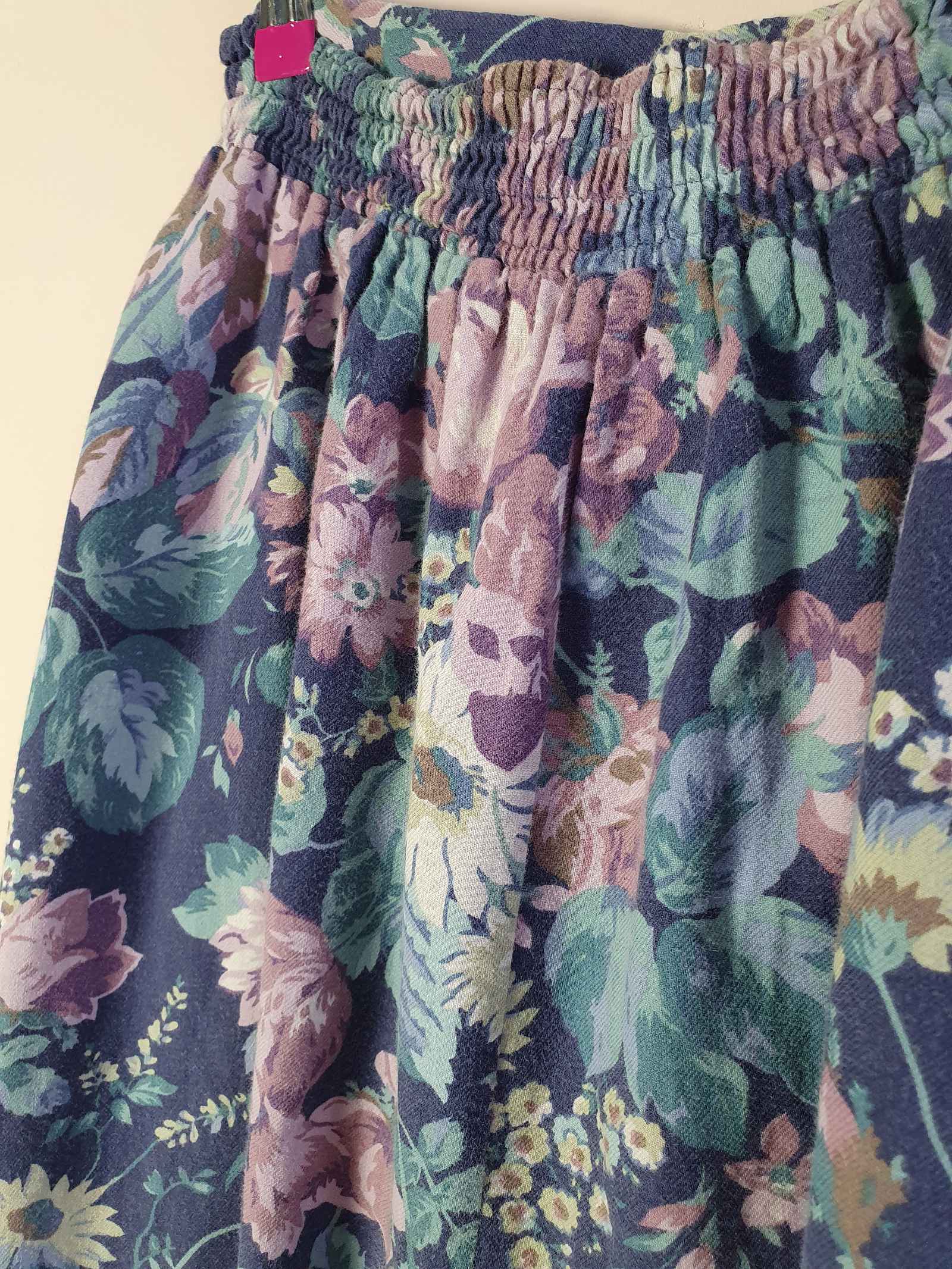Look irresistible in this vintage 80s Laura Ashley floral skirt. Features a soft vintage navy base adorned with different shades of pink and green flowers and leaves for a sweet and elegant look. Perfect for adding a charming touch to any ensemble. Two side pockets.