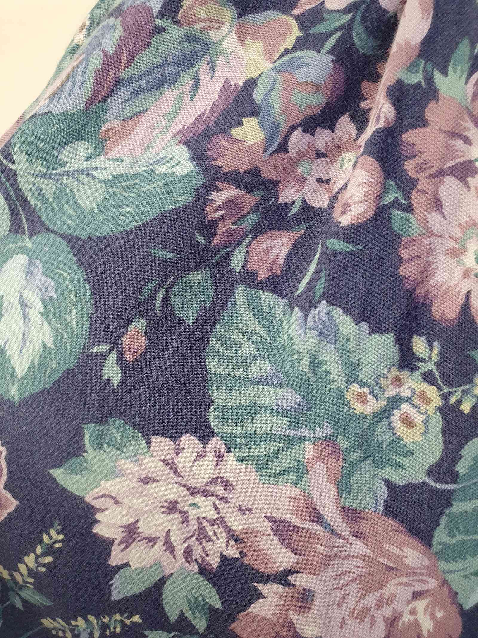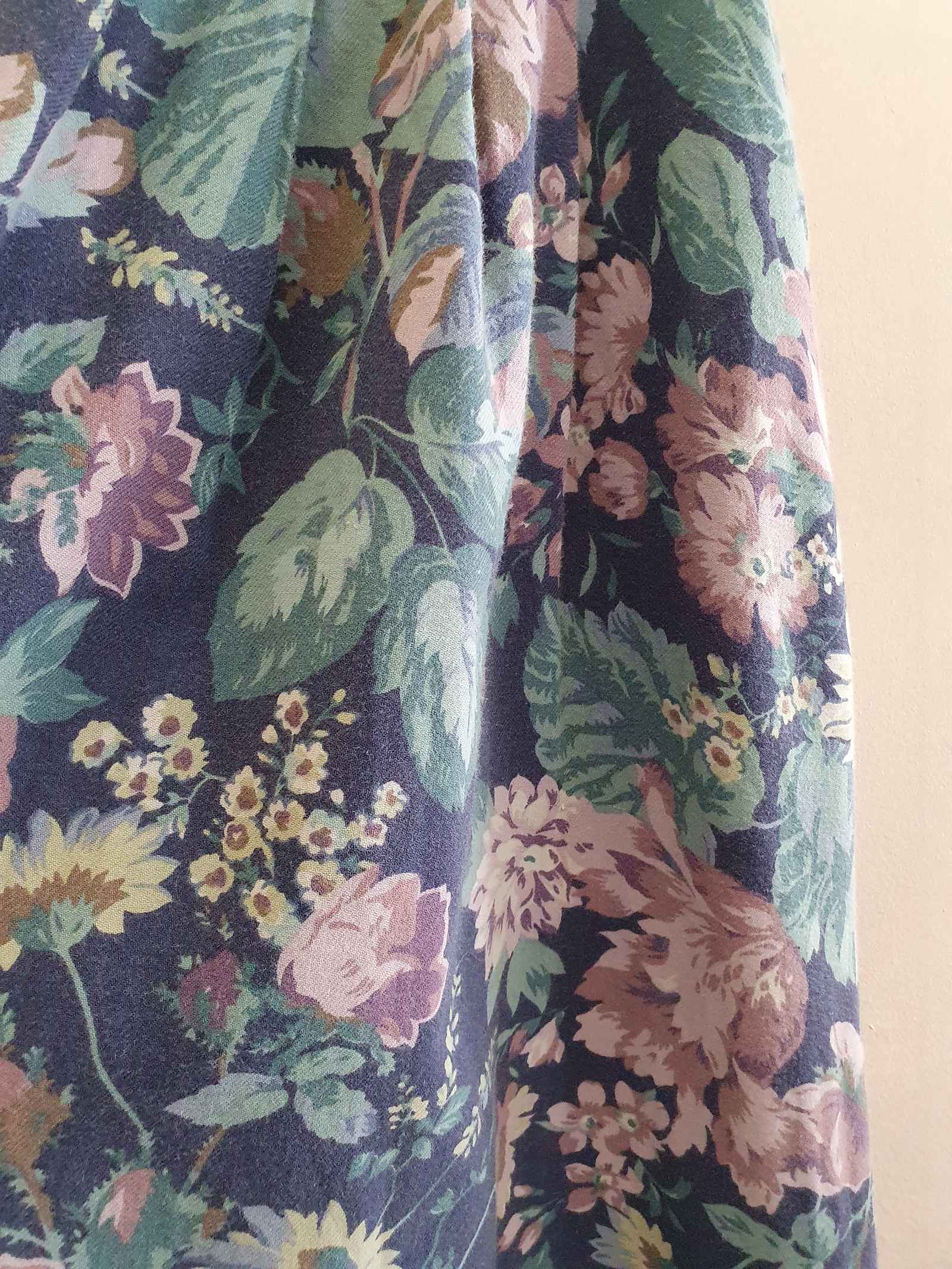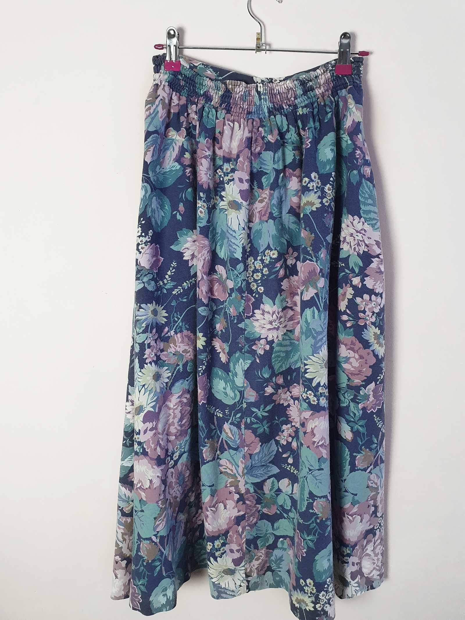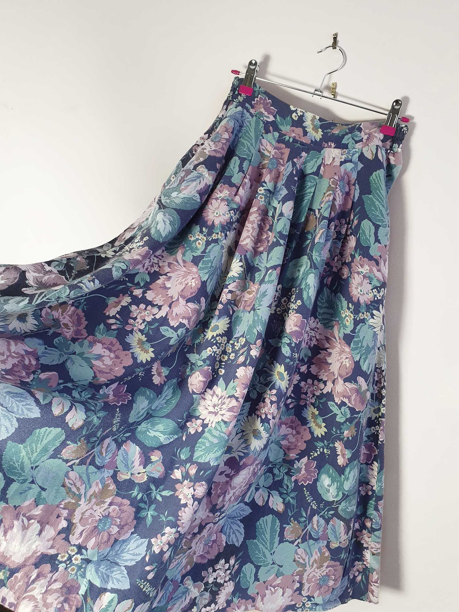 Look irresistible in this vintage 80s Laura Ashley floral skirt. Features a soft vintage navy base adorned with different shades of pink and green flowers and leaves for a sweet and elegant look. Perfect for adding a charming touch to any ensemble. Two side pockets.