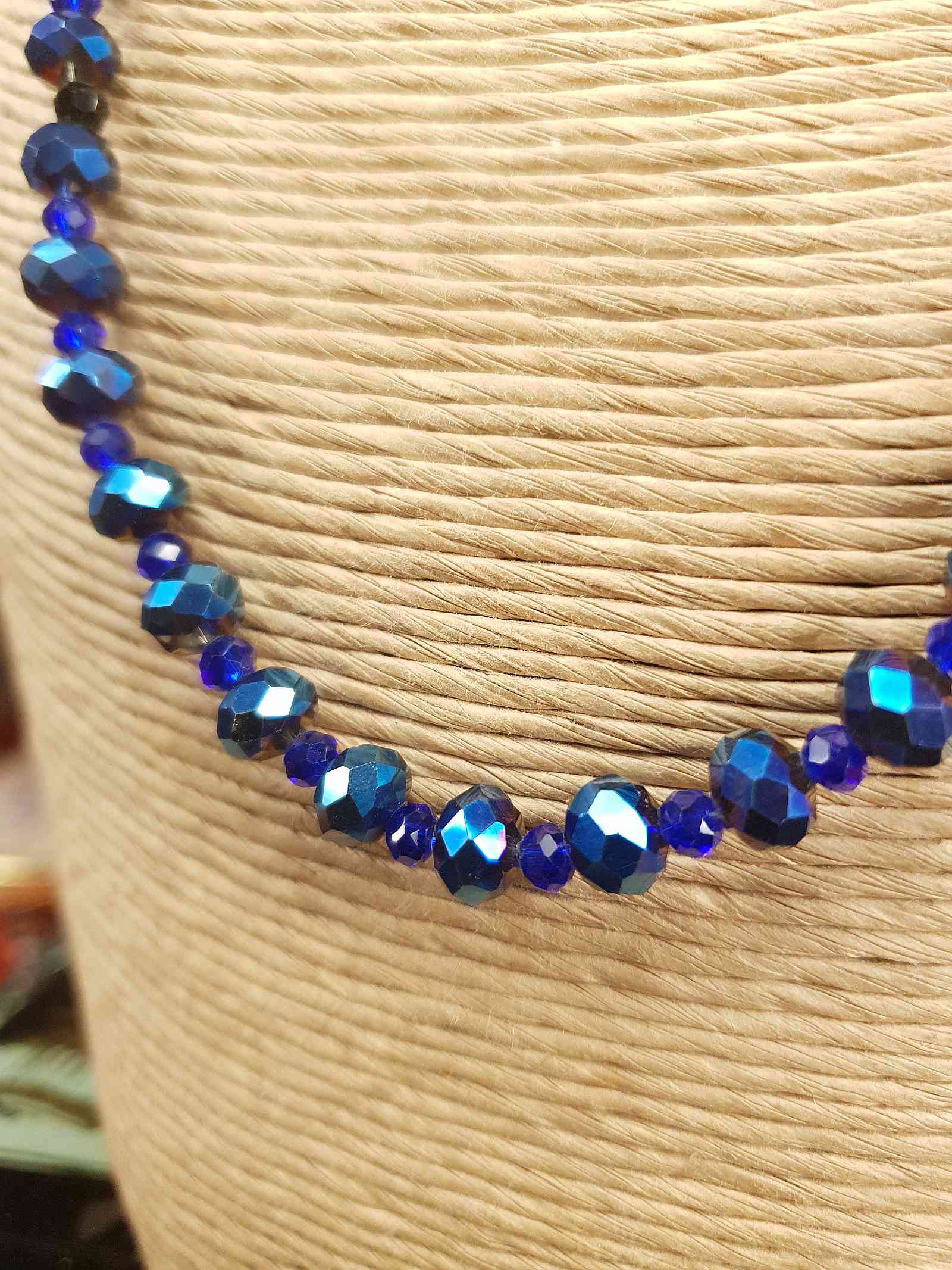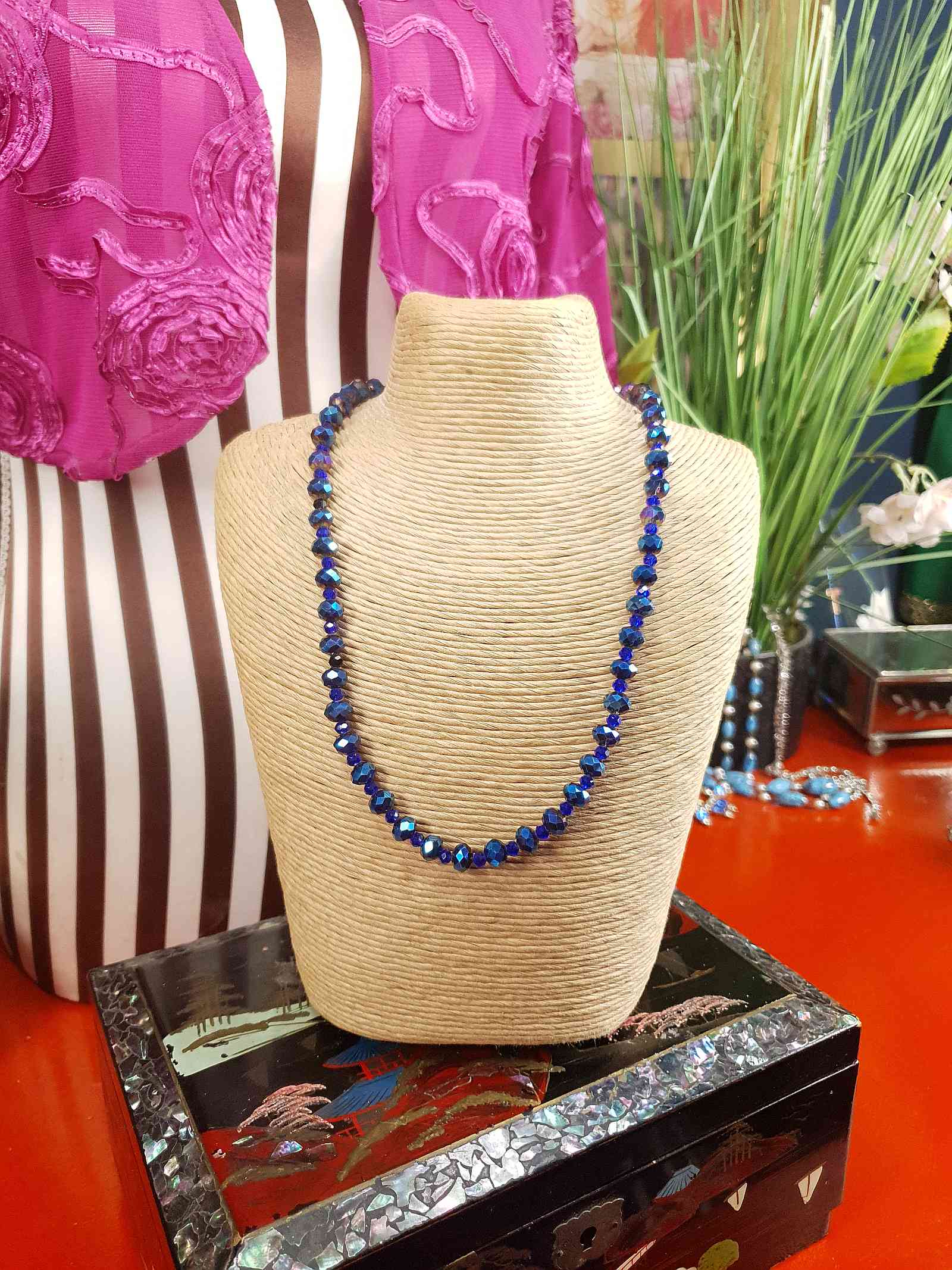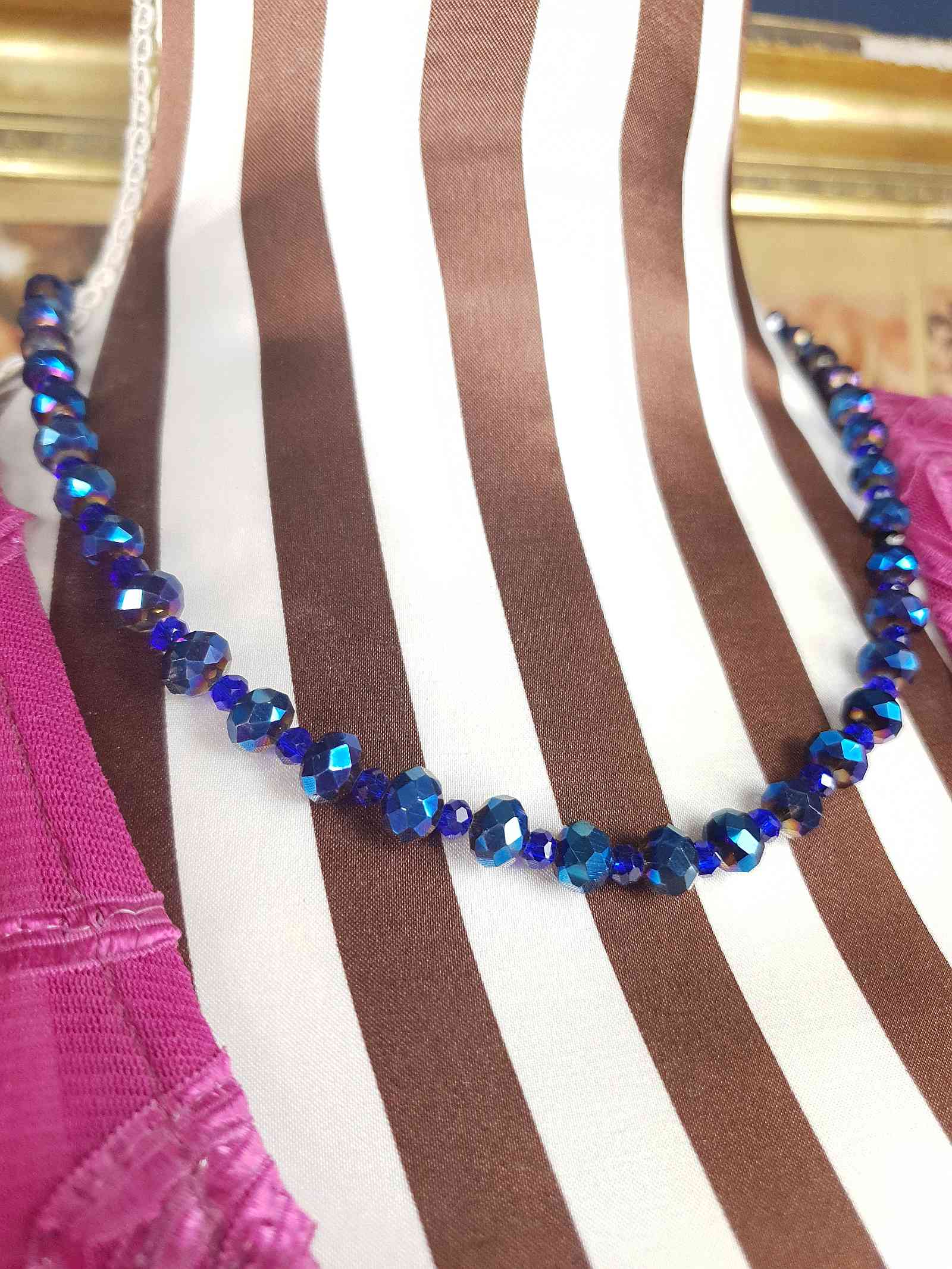 Stunning vintage 90s necklace featuring faceted glass beads in deep marine blue with a shimmering Aurora Borealis finish. Each bead catches the light beautifully, creating an iridescent rainbow effect that shifts with movement. A timeless piece perfect for adding retro glamour to any outfit. Finished with a gold-tone metal lobster claw clasp.