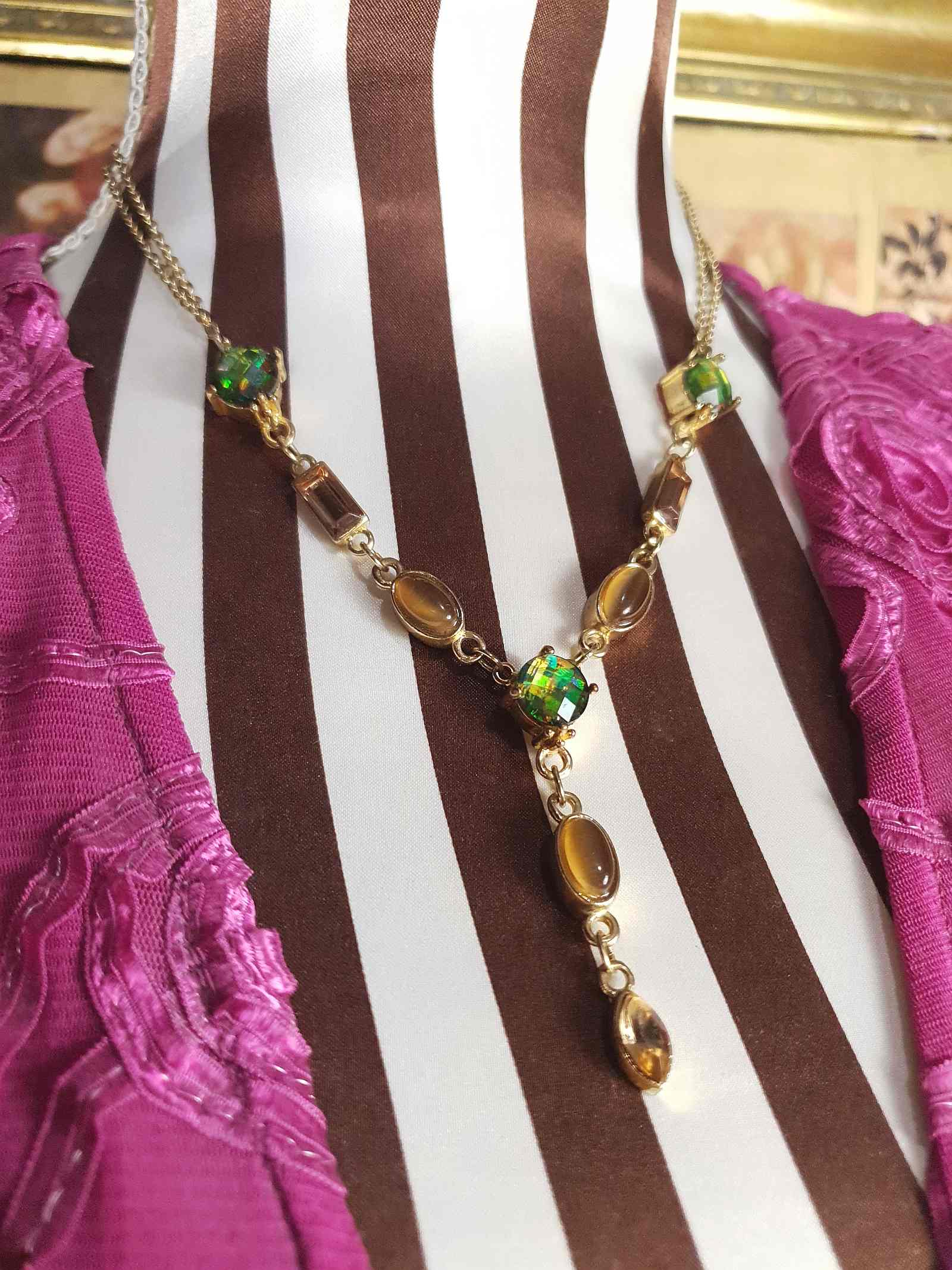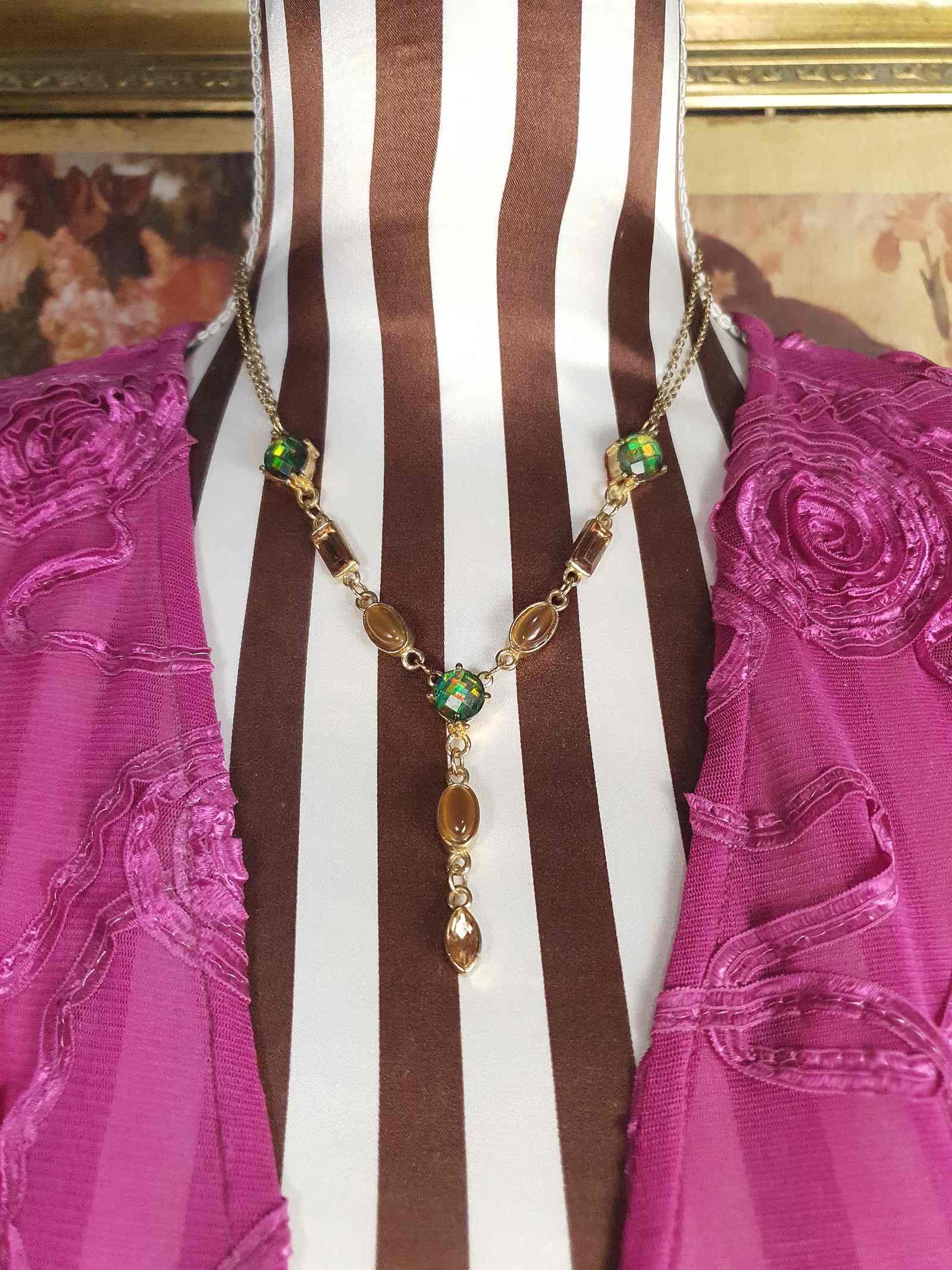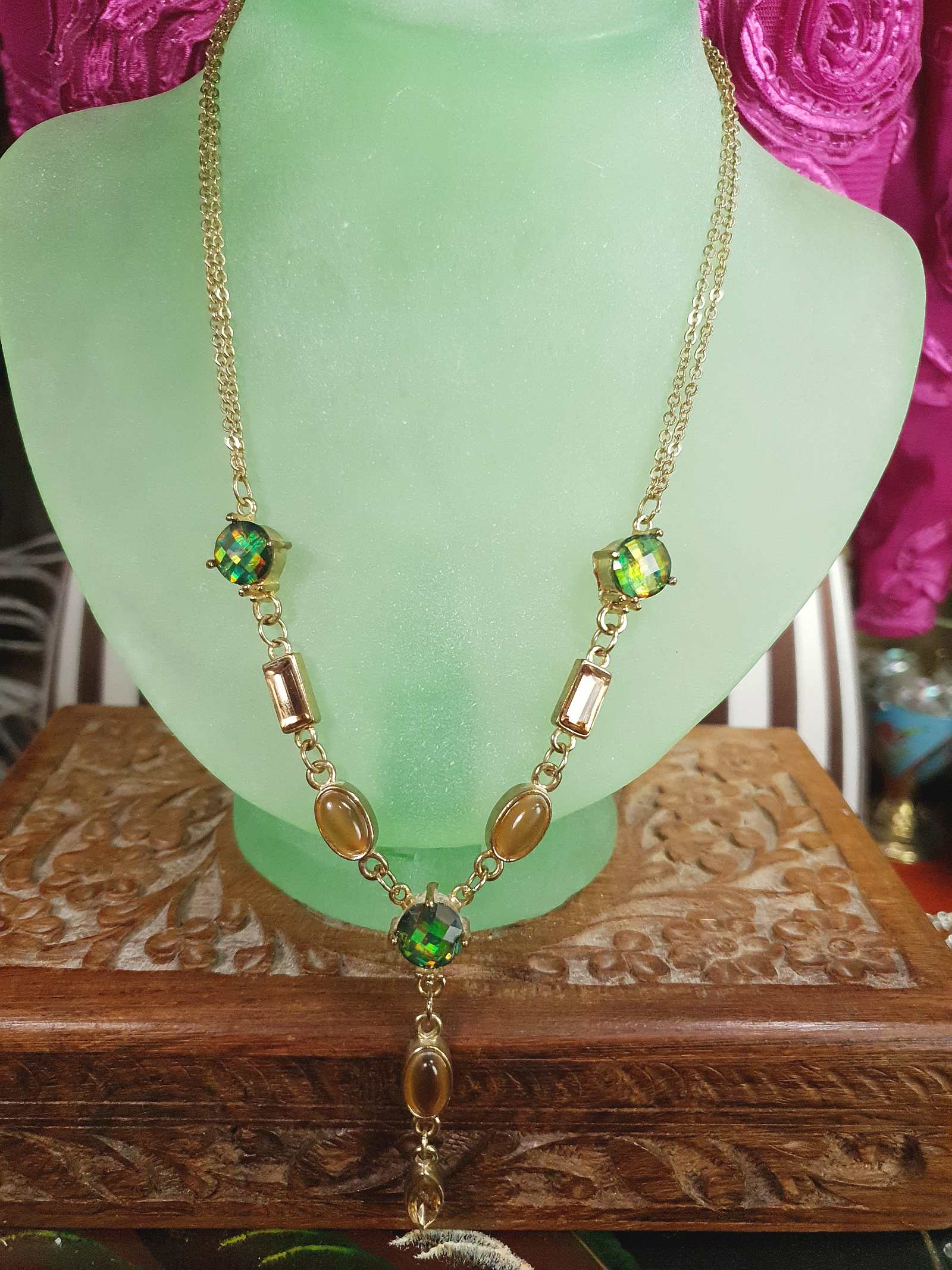From the 90s, this beautiful vintage gold-tone metal necklace displays green aurora borealis and bronze glass rhinestones in oval cabochon, baguette, and marquise cuts, mounted on a double-strand belcher chain. Lobster claw clasp closure with extender chain.