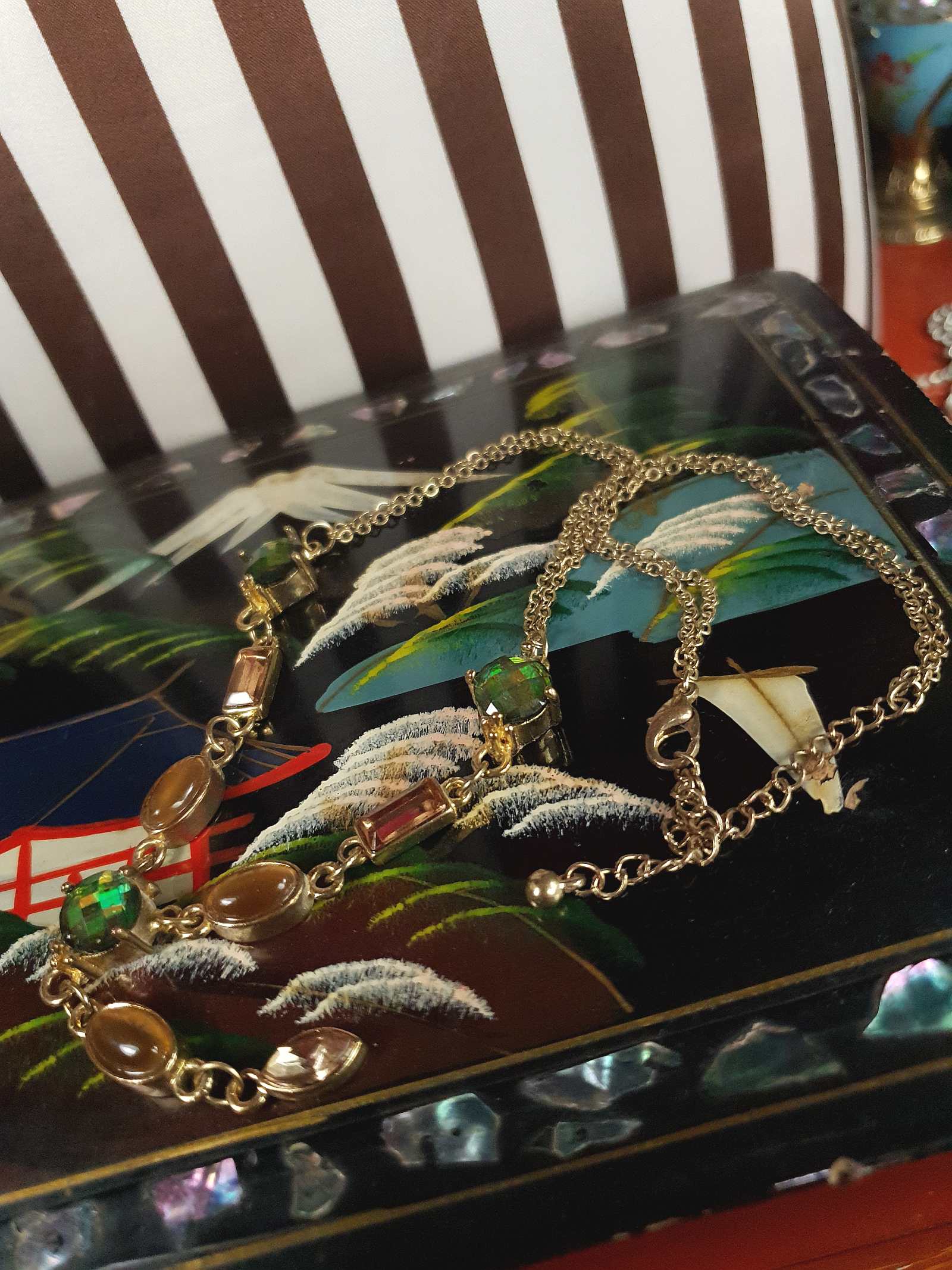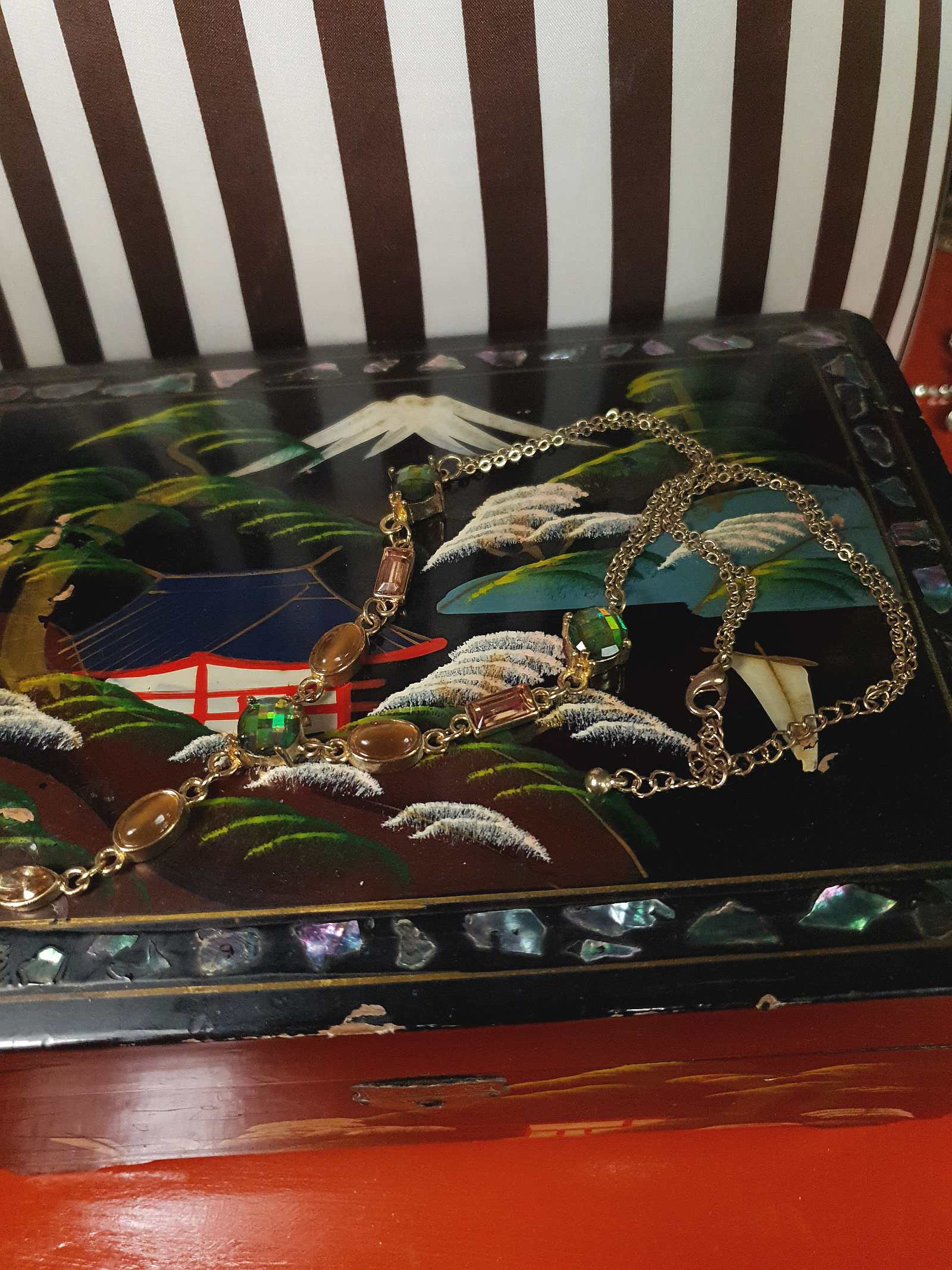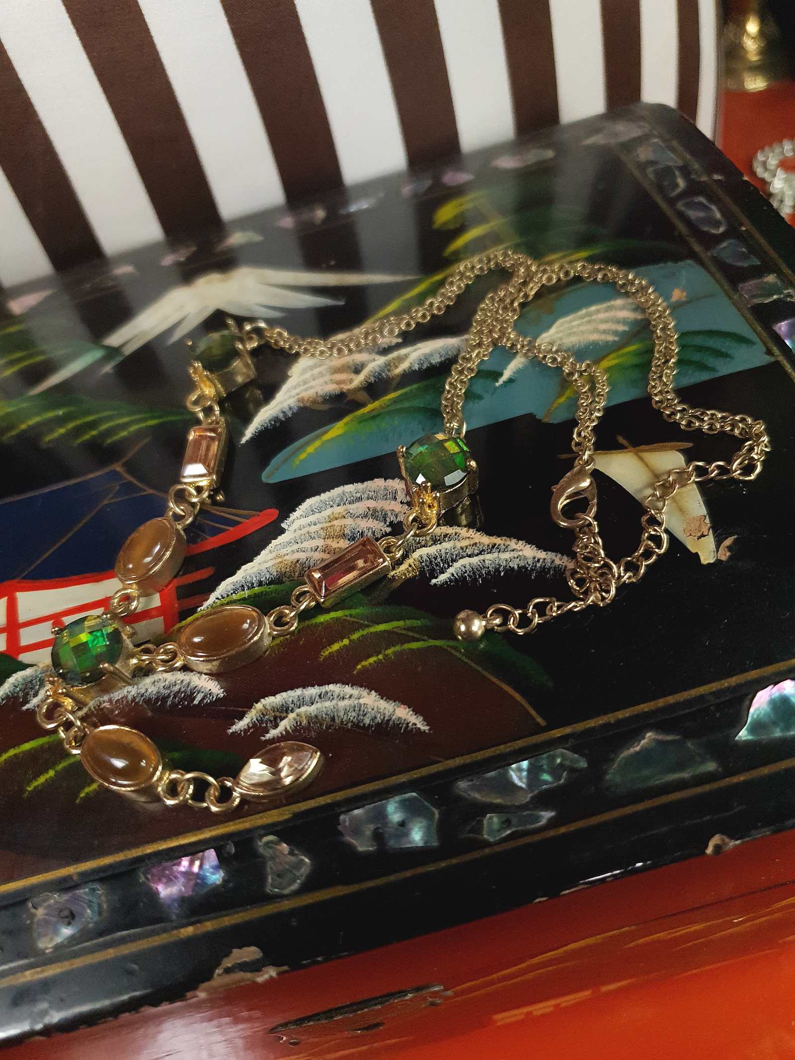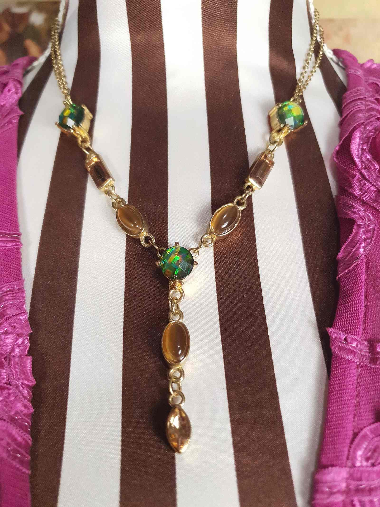 From the 90s, this beautiful vintage gold-tone metal necklace displays green aurora borealis and bronze glass rhinestones in oval cabochon, baguette, and marquise cuts, mounted on a double-strand belcher chain. Lobster claw clasp closure with extender chain.