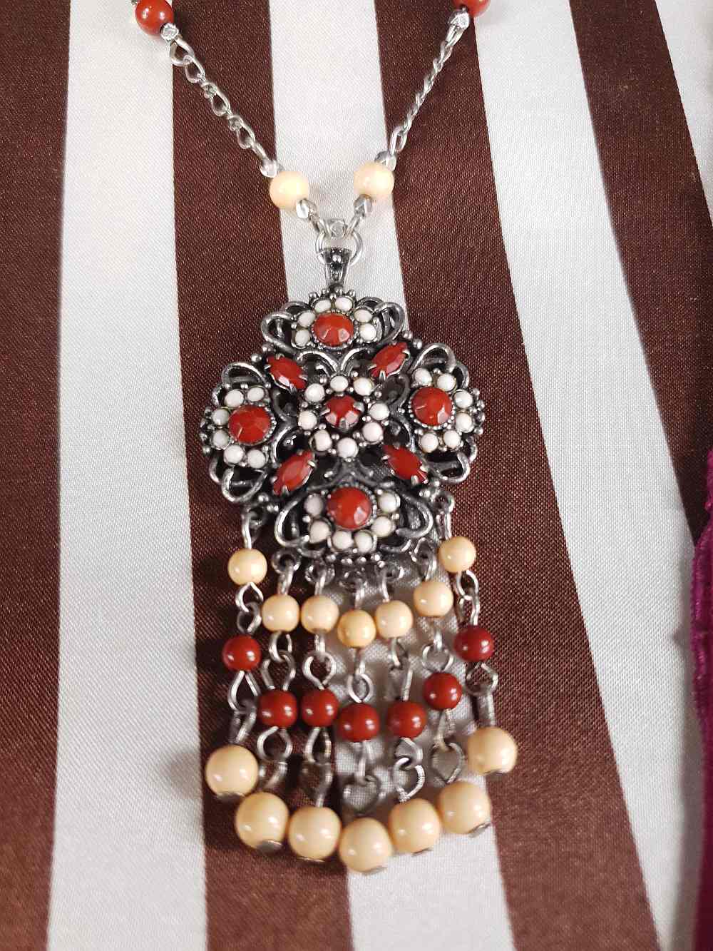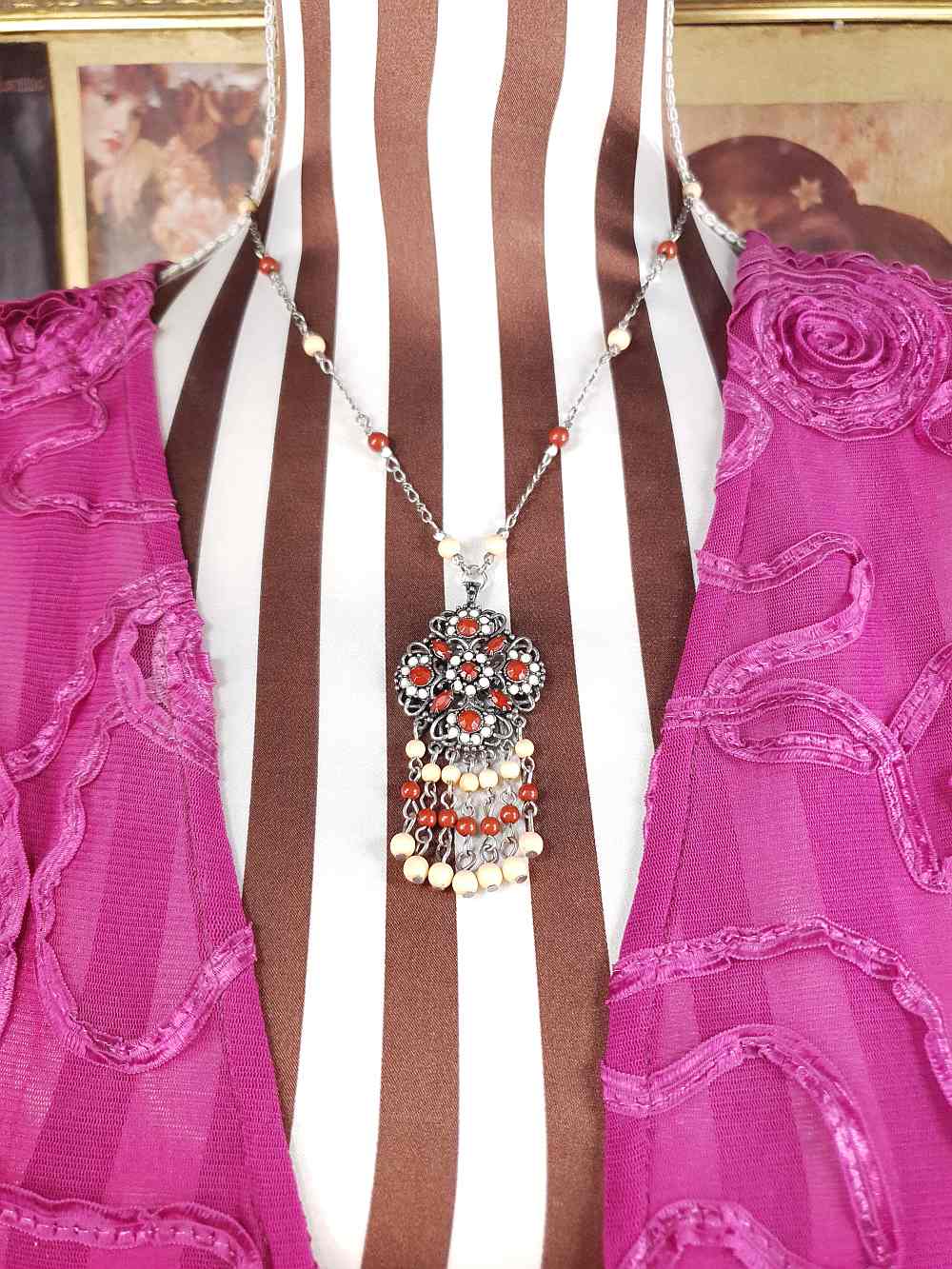 Ornate gunmetal filigree pendant featuring prong-set faceted russet beads and delicate white accents. Finished with dangling bead drops and suspended from a decorative chain adorned with peach and russet beads. A quintessential bohemian piece with vintage charm and intricate detailing.