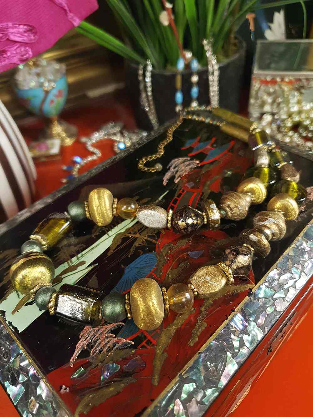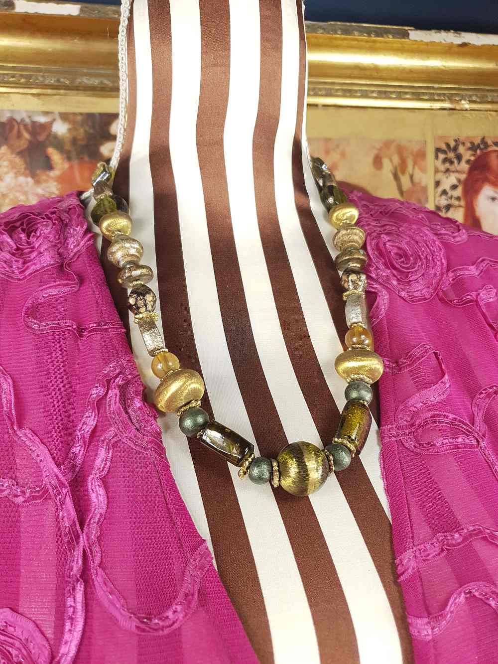 A bold and beautiful 90s statement necklace, this piece combines bohemian flair with high-quality artistry. The pressed olive green glass beads have the look of Venetian glass and feature rich, swirling colour and foil inclusion, giving it a stylish, eclectic boho look. It is strung with textured gold-tone metal and wood beads. Finished with a lobster claw clasp and extender for a customizable fit.