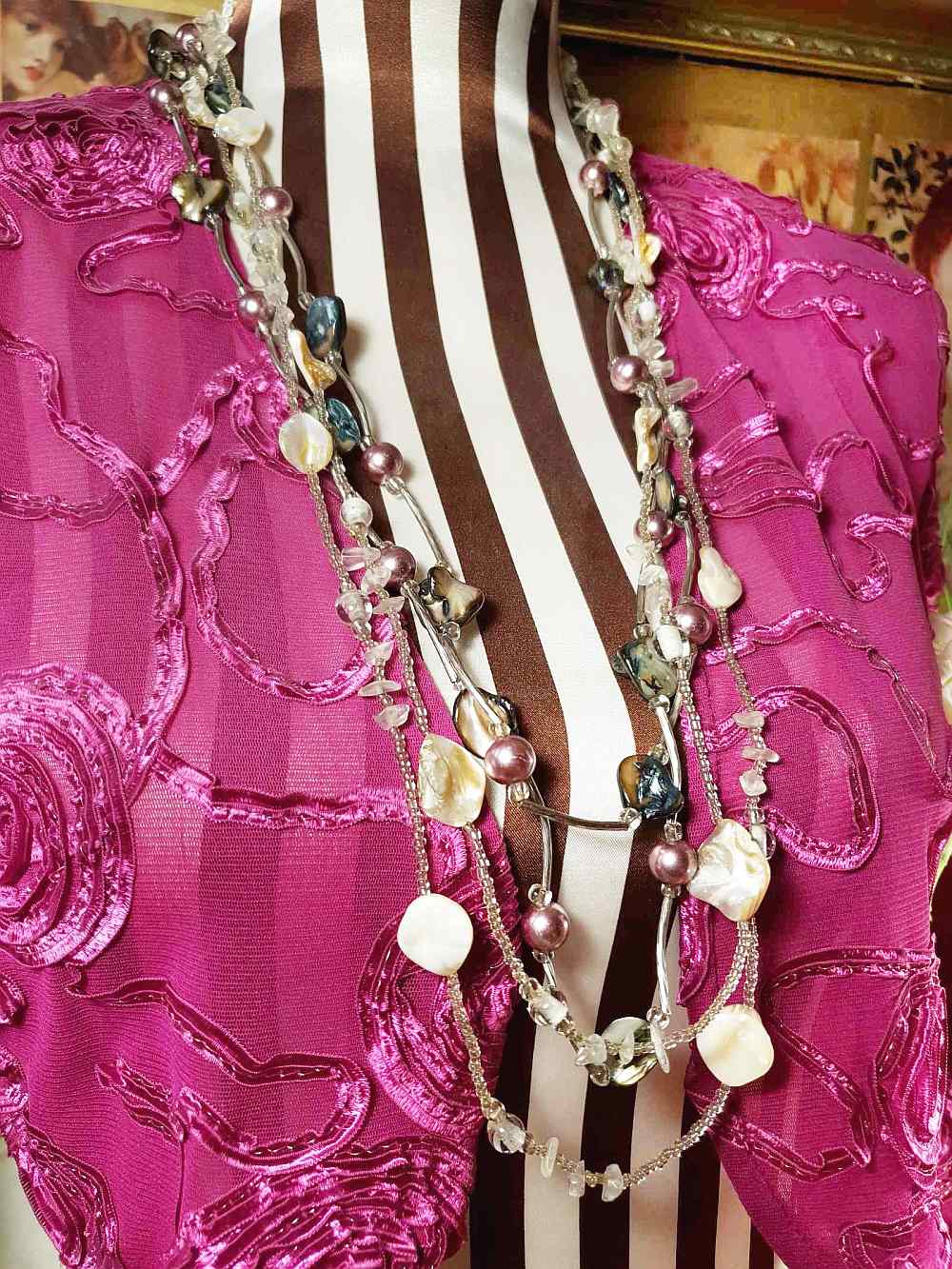 A beautiful 90s necklace featuring four graduating strands of organically shaped pieces of luminescent mother of pearl in hues of cream and grey, pale pink faux pearls, clear glass beads and silver-tone metal tubular beads. Secured with a lobster claw clasp.