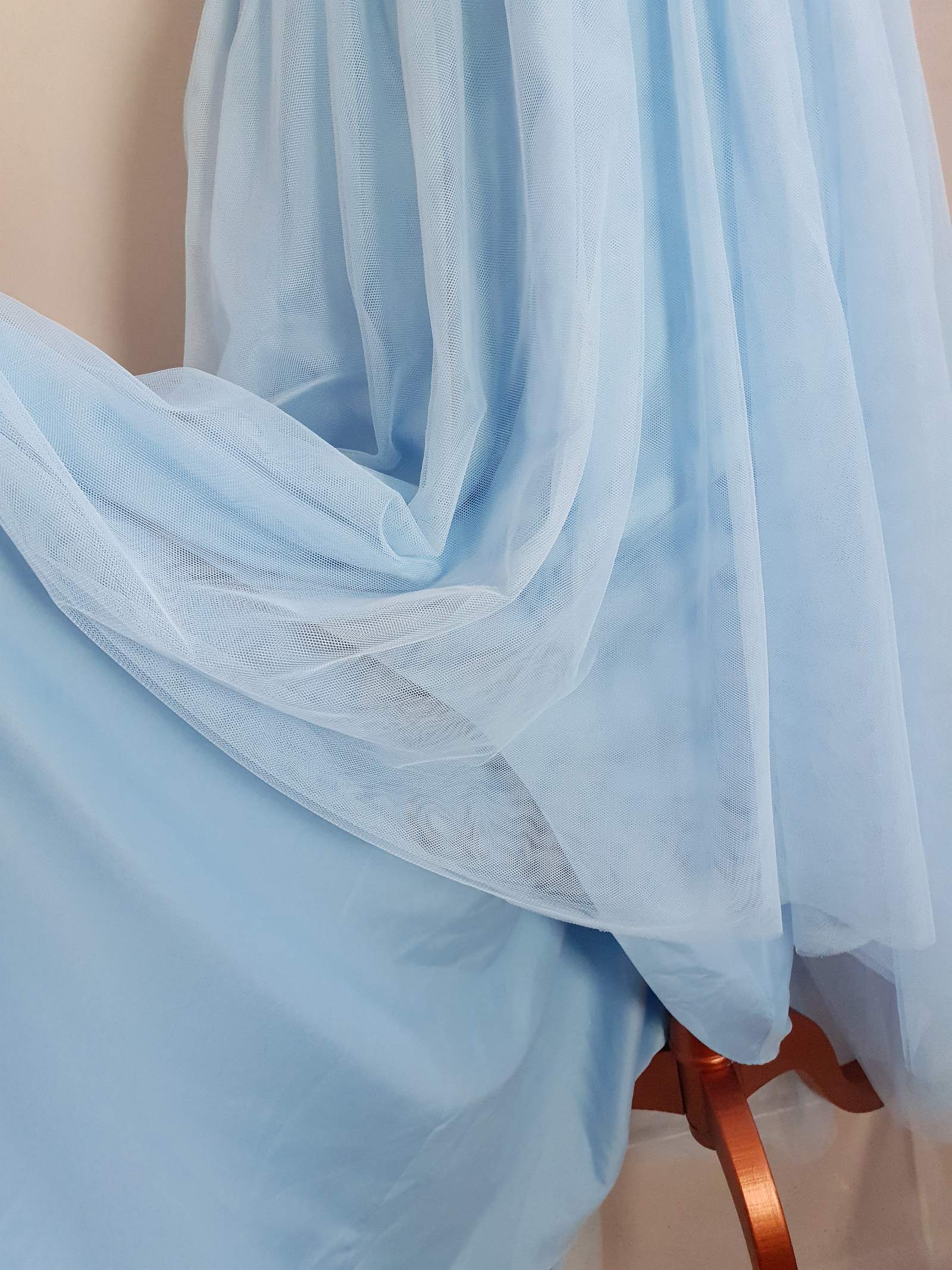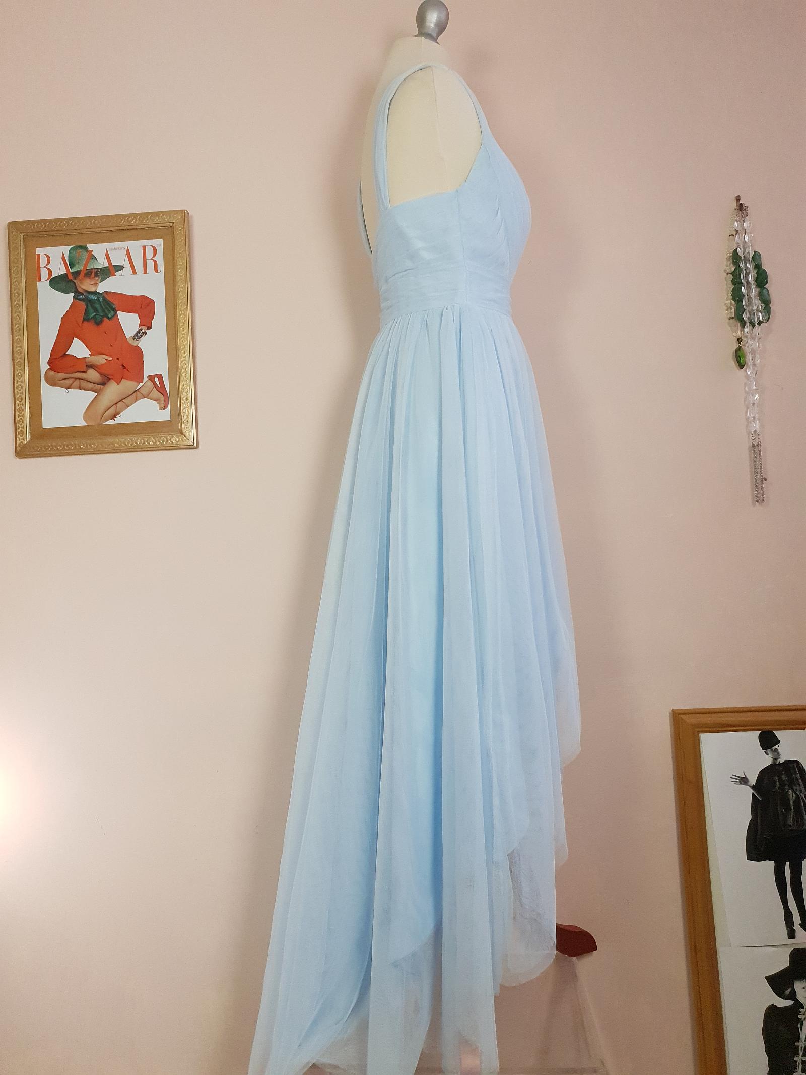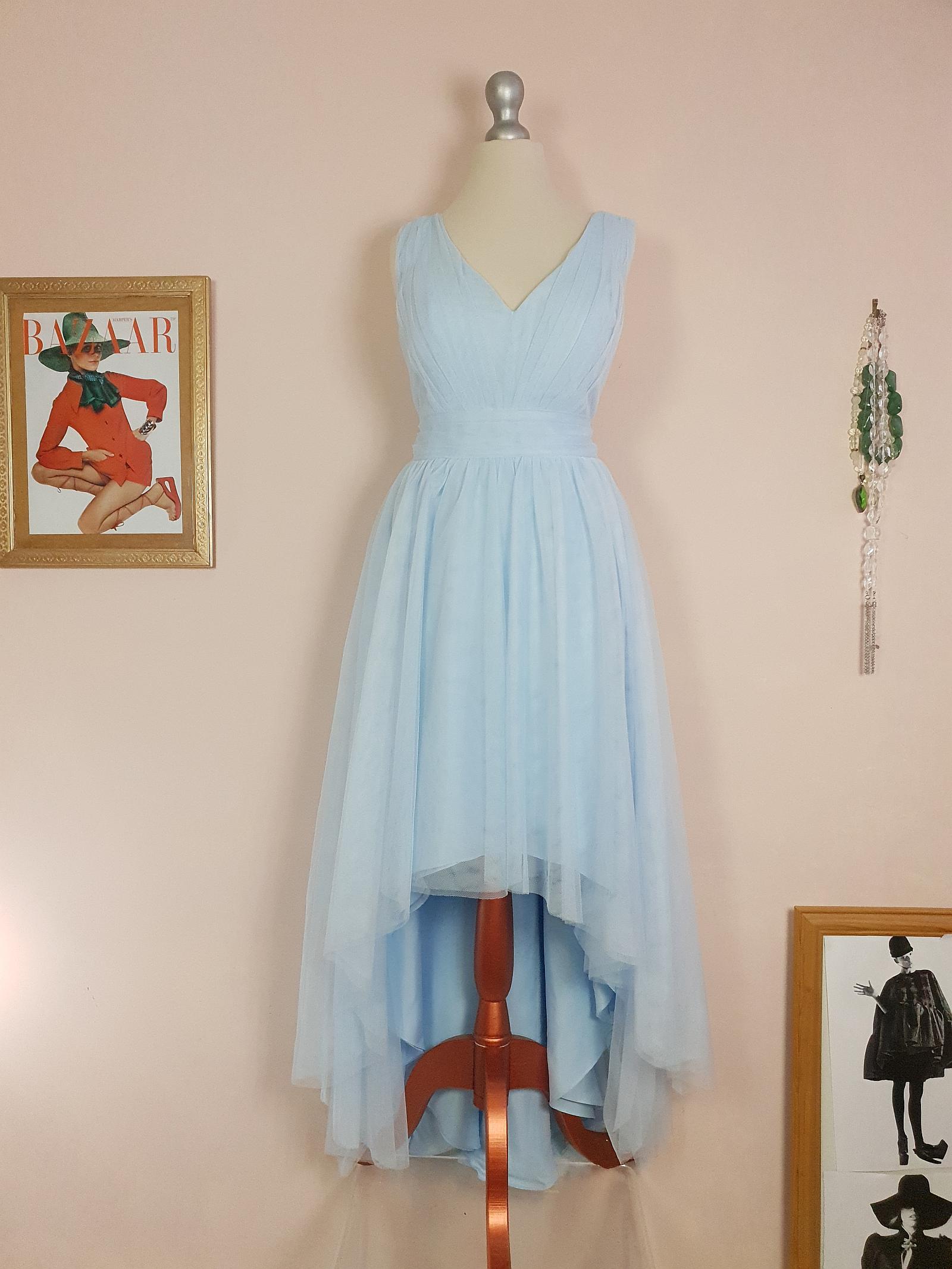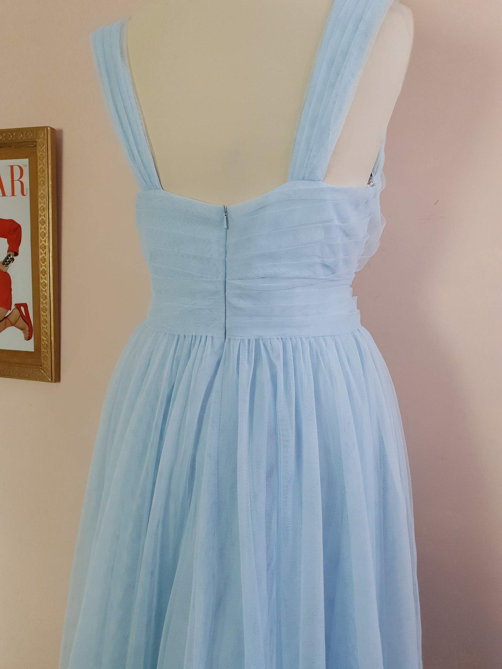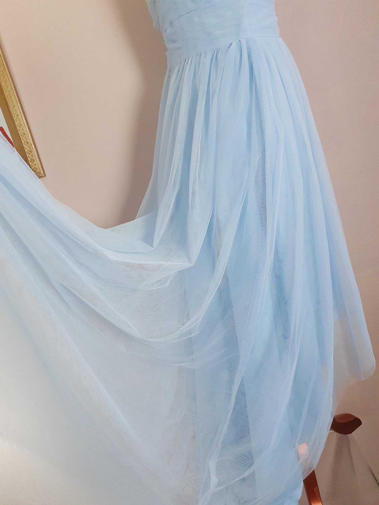 Evoke vintage glamour in this 90s pale blue dress. The asymmetric design and padded bust bodice provide a flattering fit, while the two layers of soft tulle over two layers of satin create a romantic feel. Perfect for prom, parties, or cocktails.
