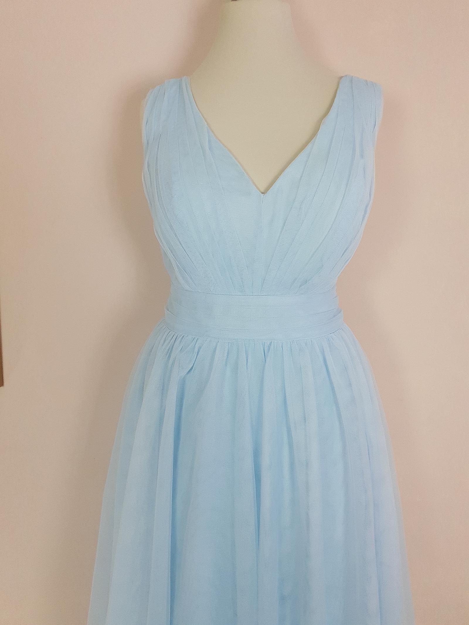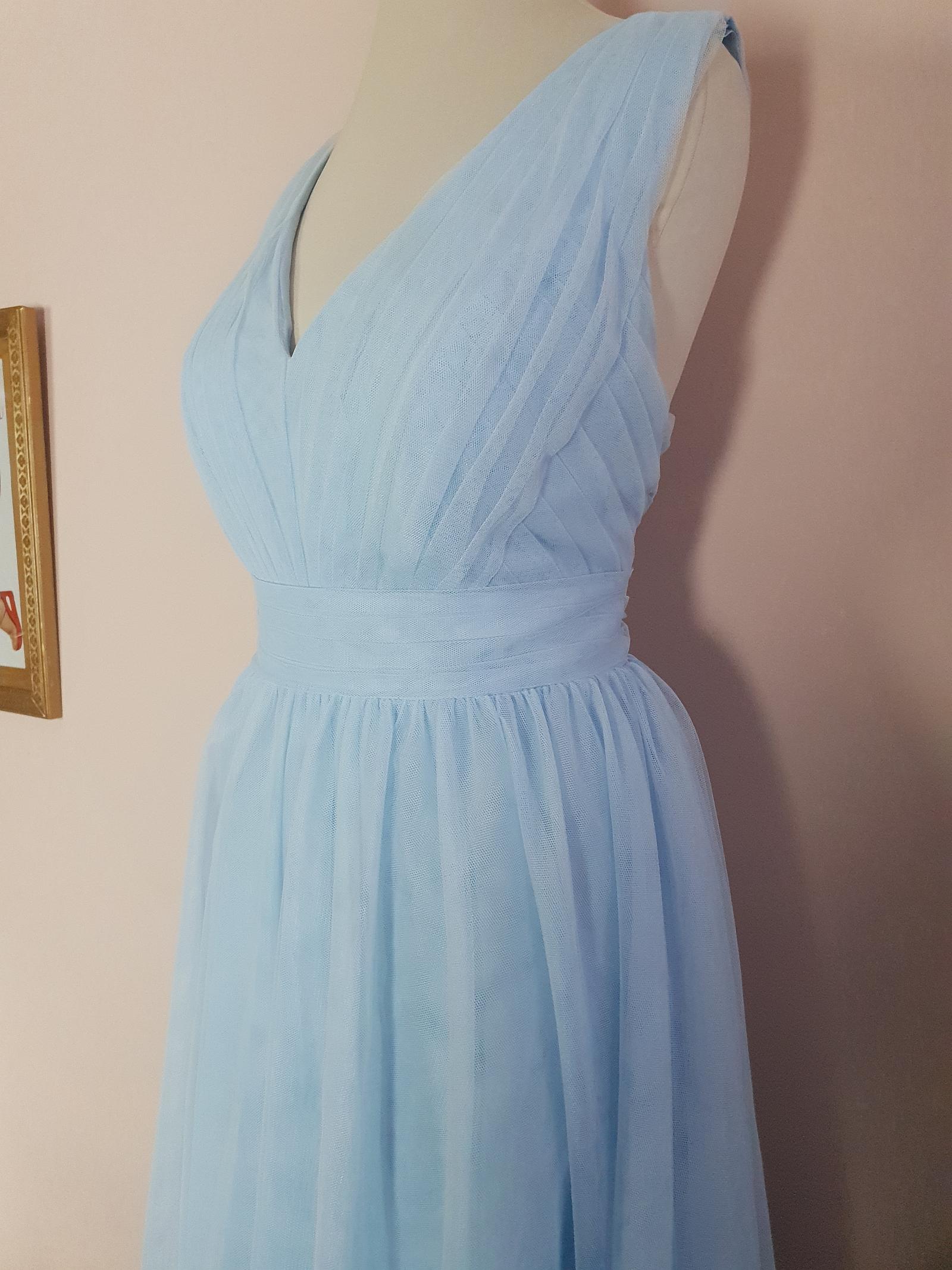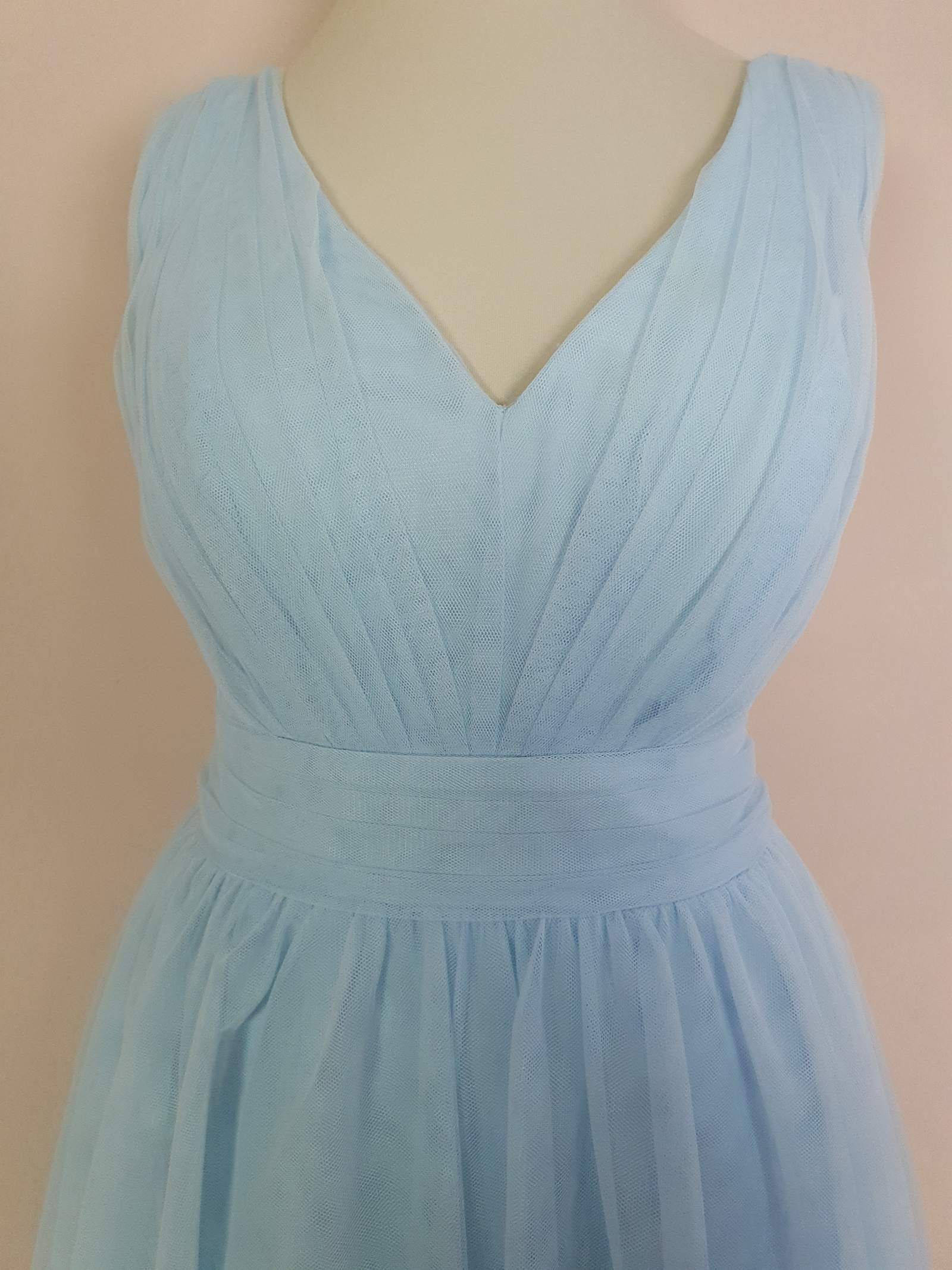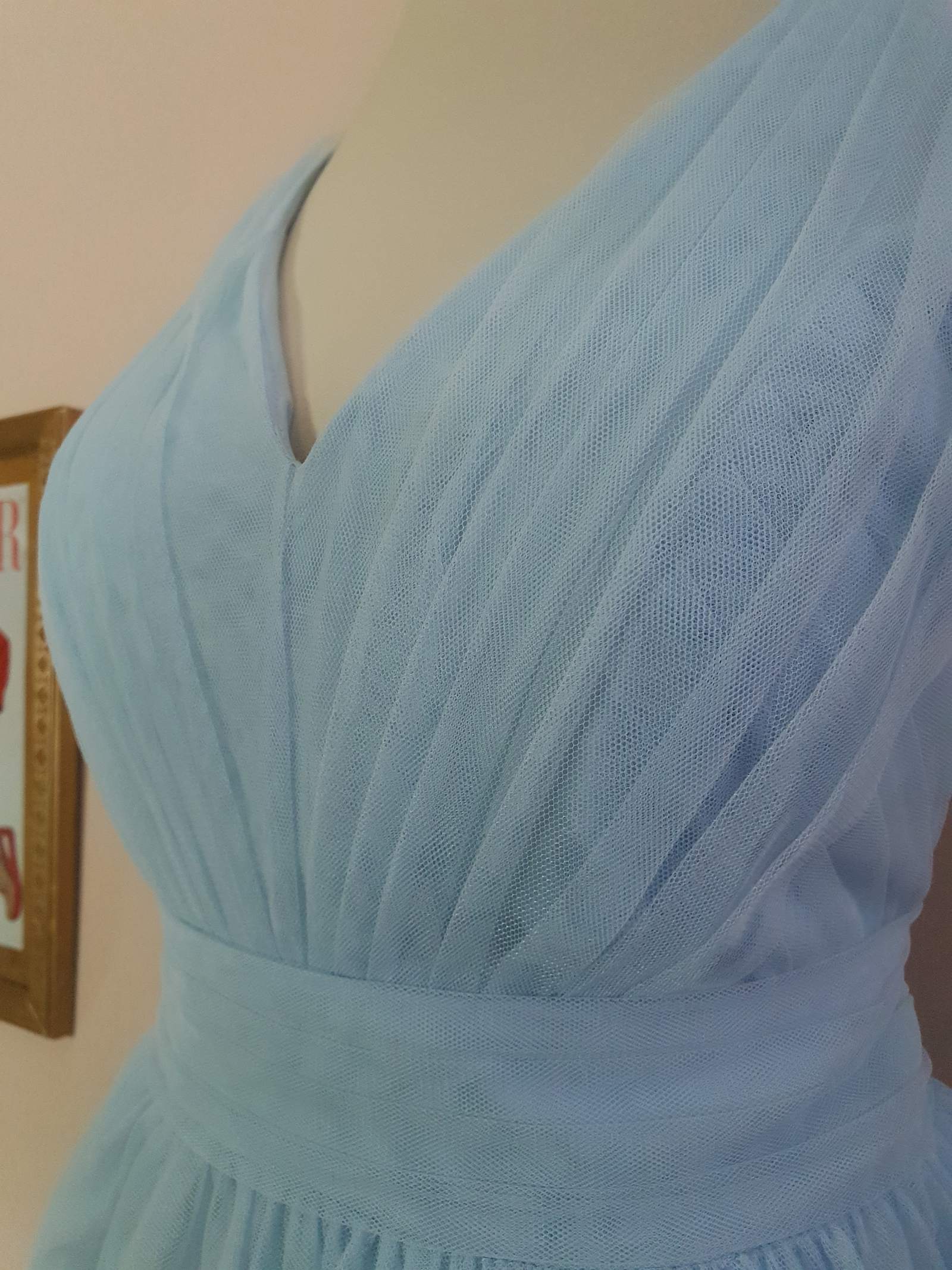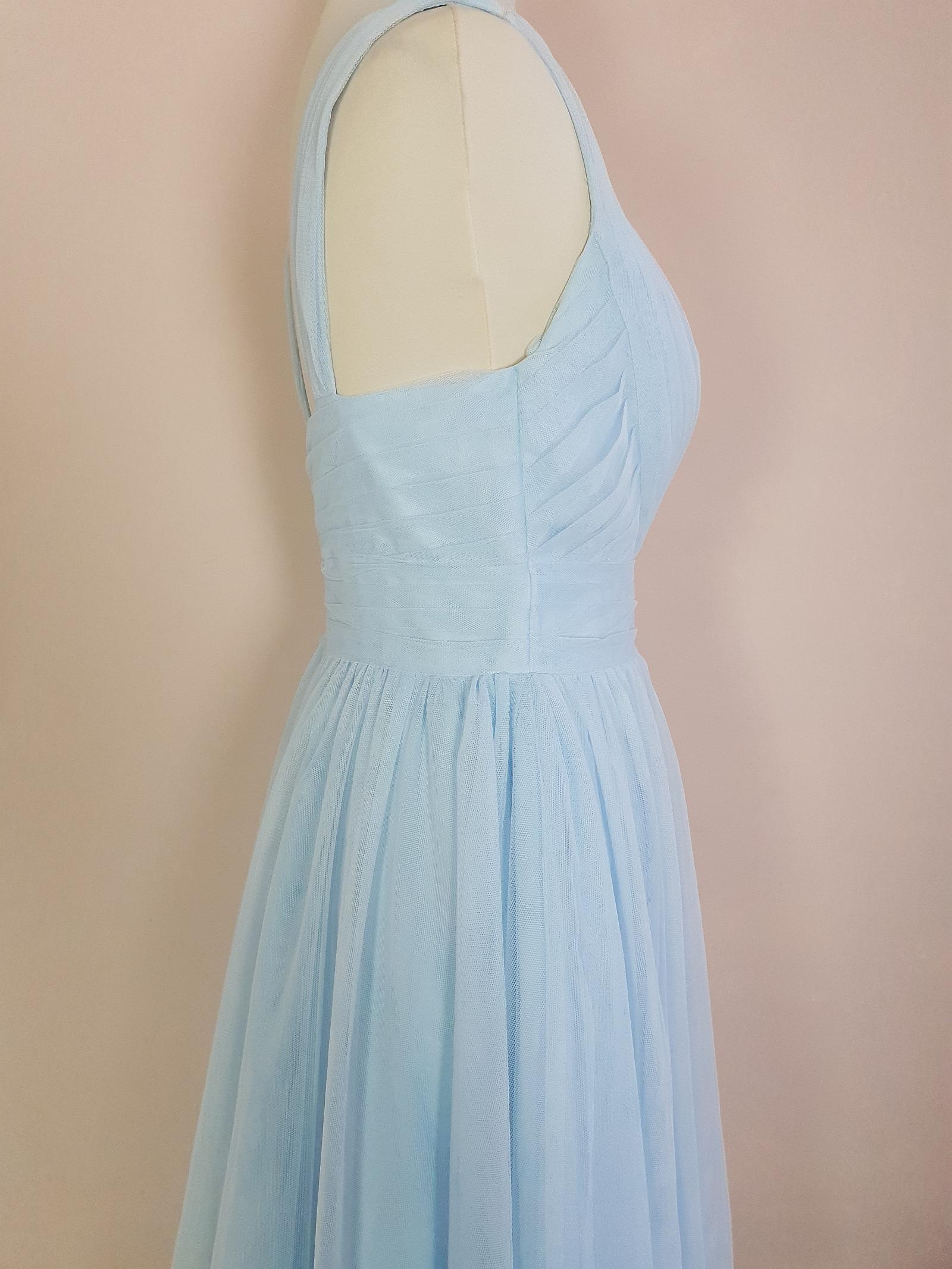Evoke vintage glamour in this 90s pale blue dress. The asymmetric design and padded bust bodice provide a flattering fit, while the two layers of soft tulle over two layers of satin create a romantic feel. Perfect for prom, parties, or cocktails.