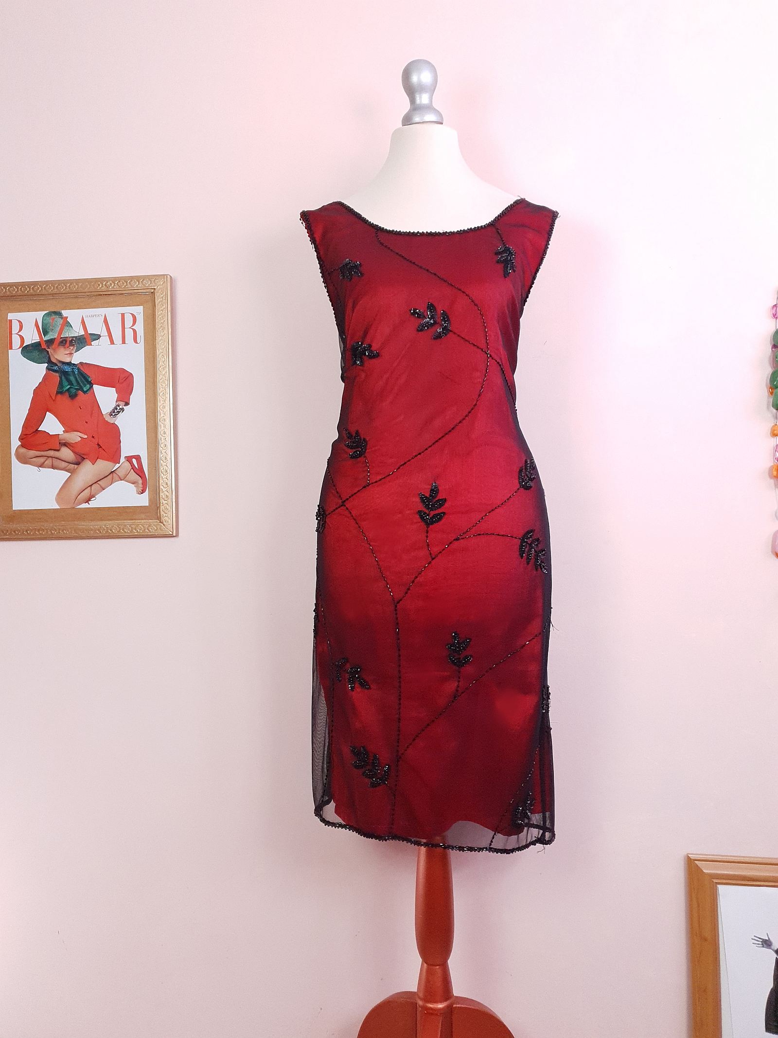 A gorgeous sleeveless party dress from the 90s featuring red satin with a black tulle overlay embellished with black beading and sequins in a delicate leaf pattern. Hem slit for ease of movement and a back zip closure.