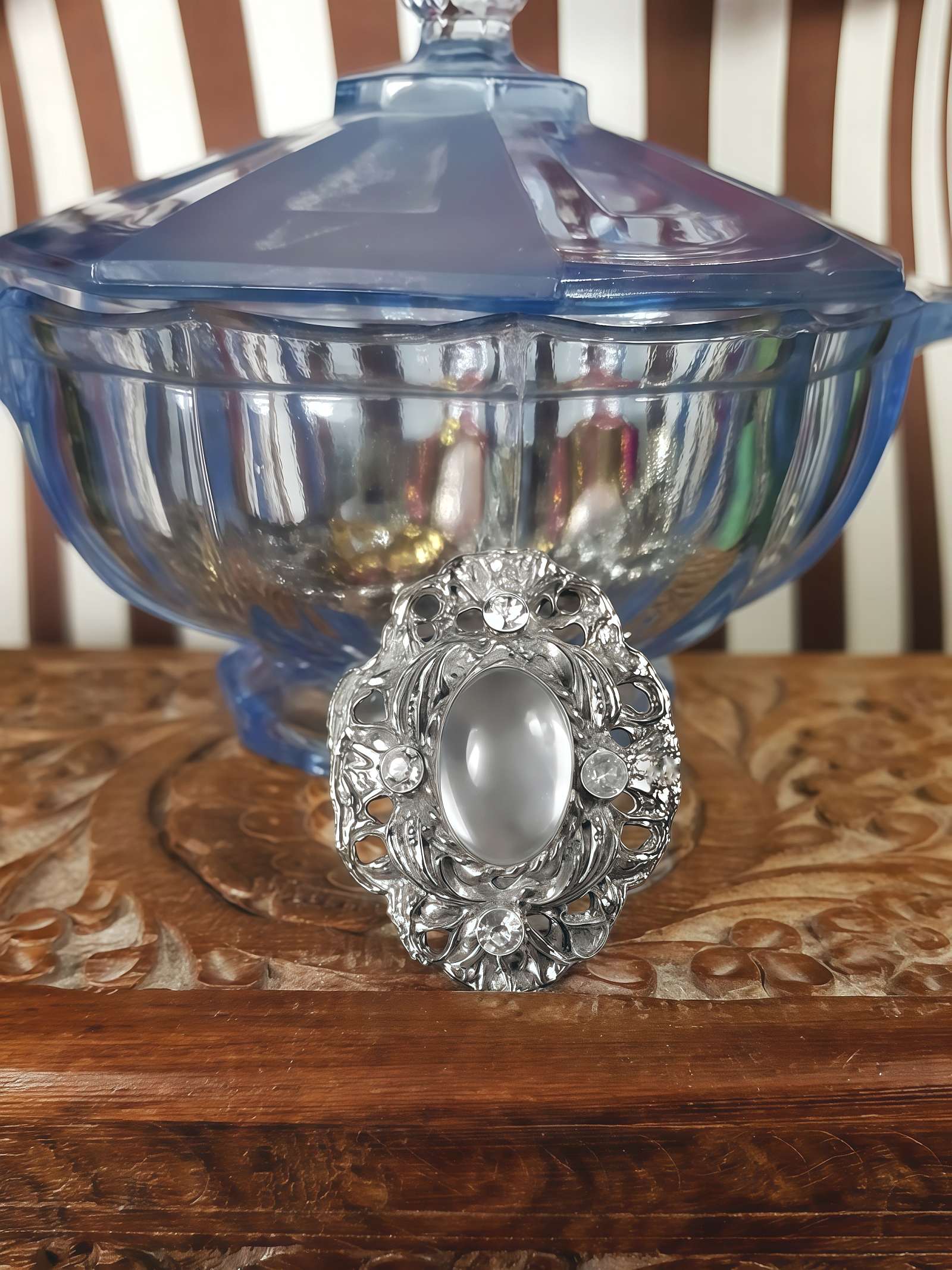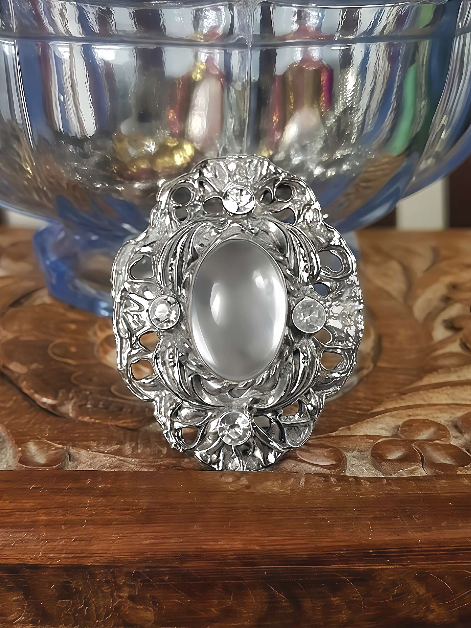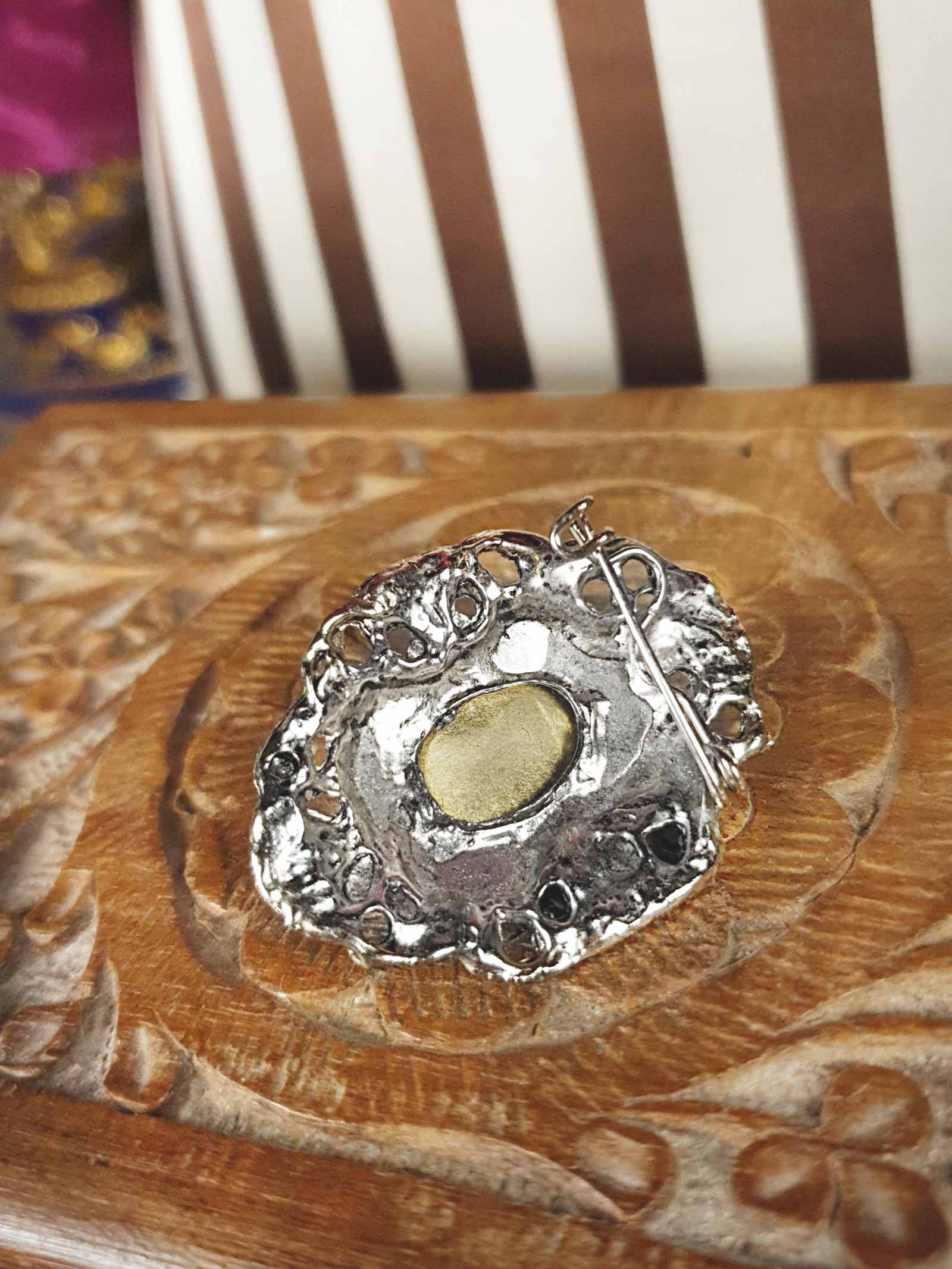 This pretty brooch from the 80s displays an Art Nouveau Revival aesthetic, constructed from antiqued silver-tone metal. A clear glass cabochon is surrounded by four round-cut glass rhinestones. It secures with a C pin fastening.