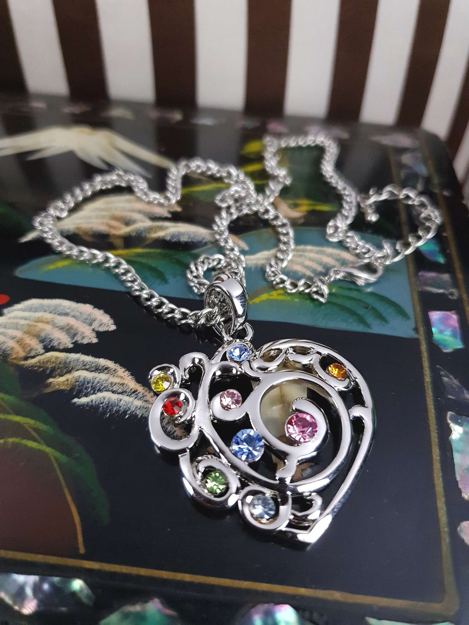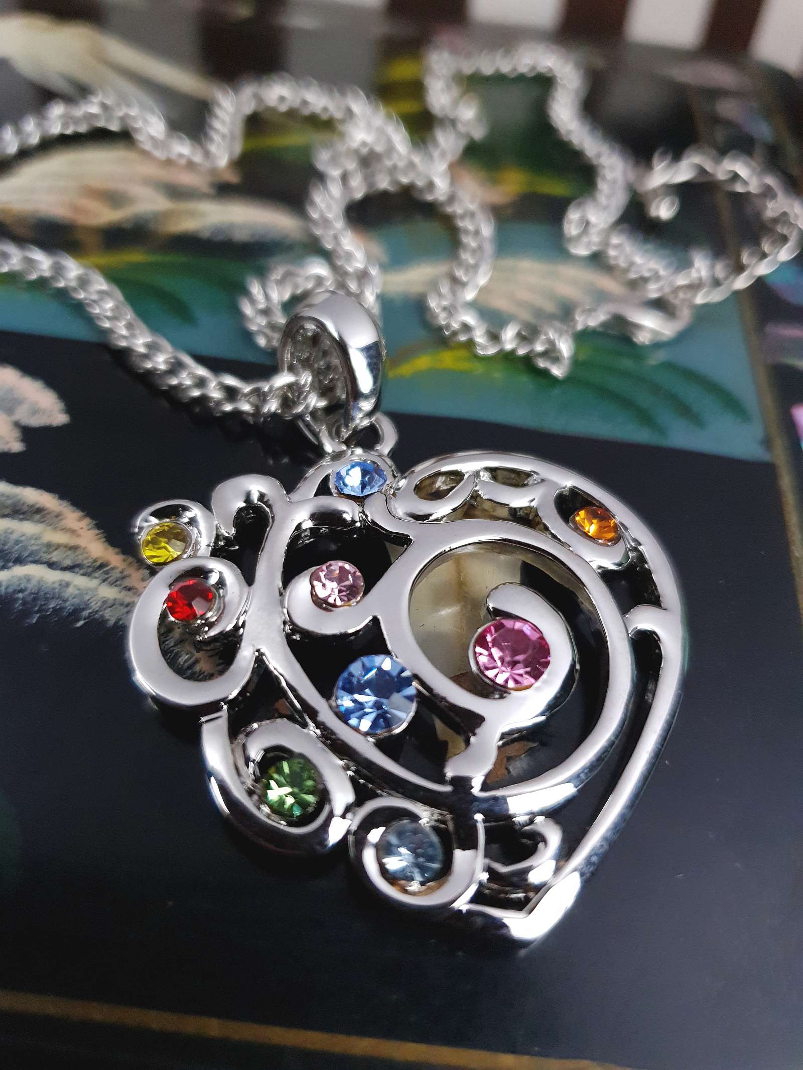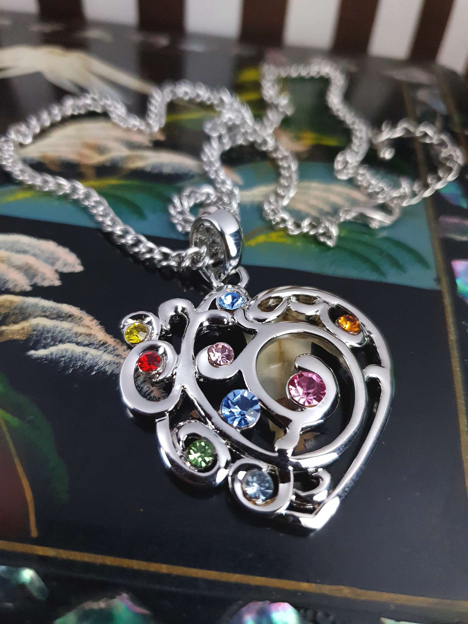 From the early 2000s Y2K era this vintage necklace features a shiny silver-tone metal curb link chain and heart pendant. The pendant features filigree patterns and colourful round-cut glass rhinestones in pale blue, pink, red, yellow, green, and orange. A lobster claw clasp secures the piece and includes an extender.