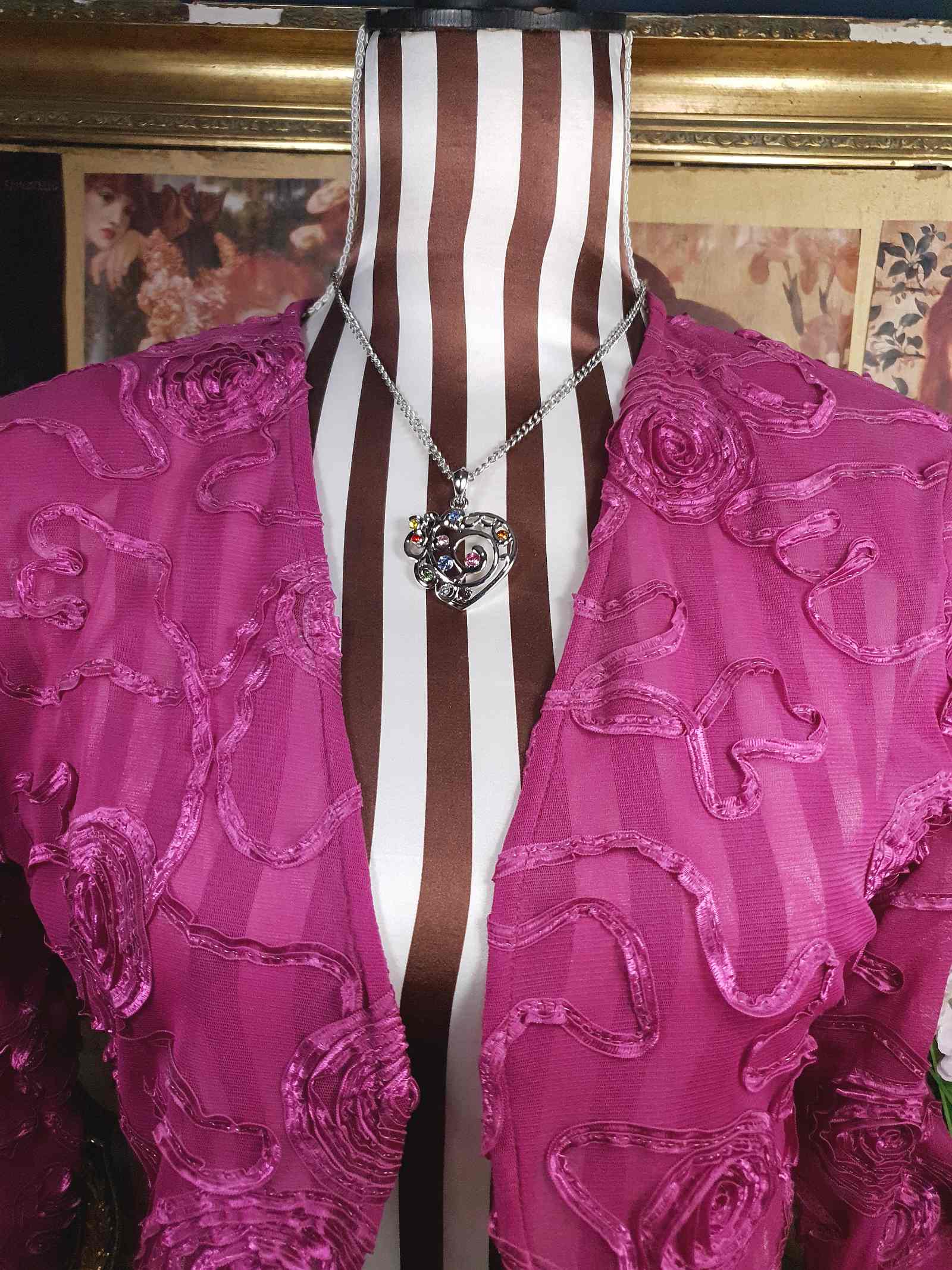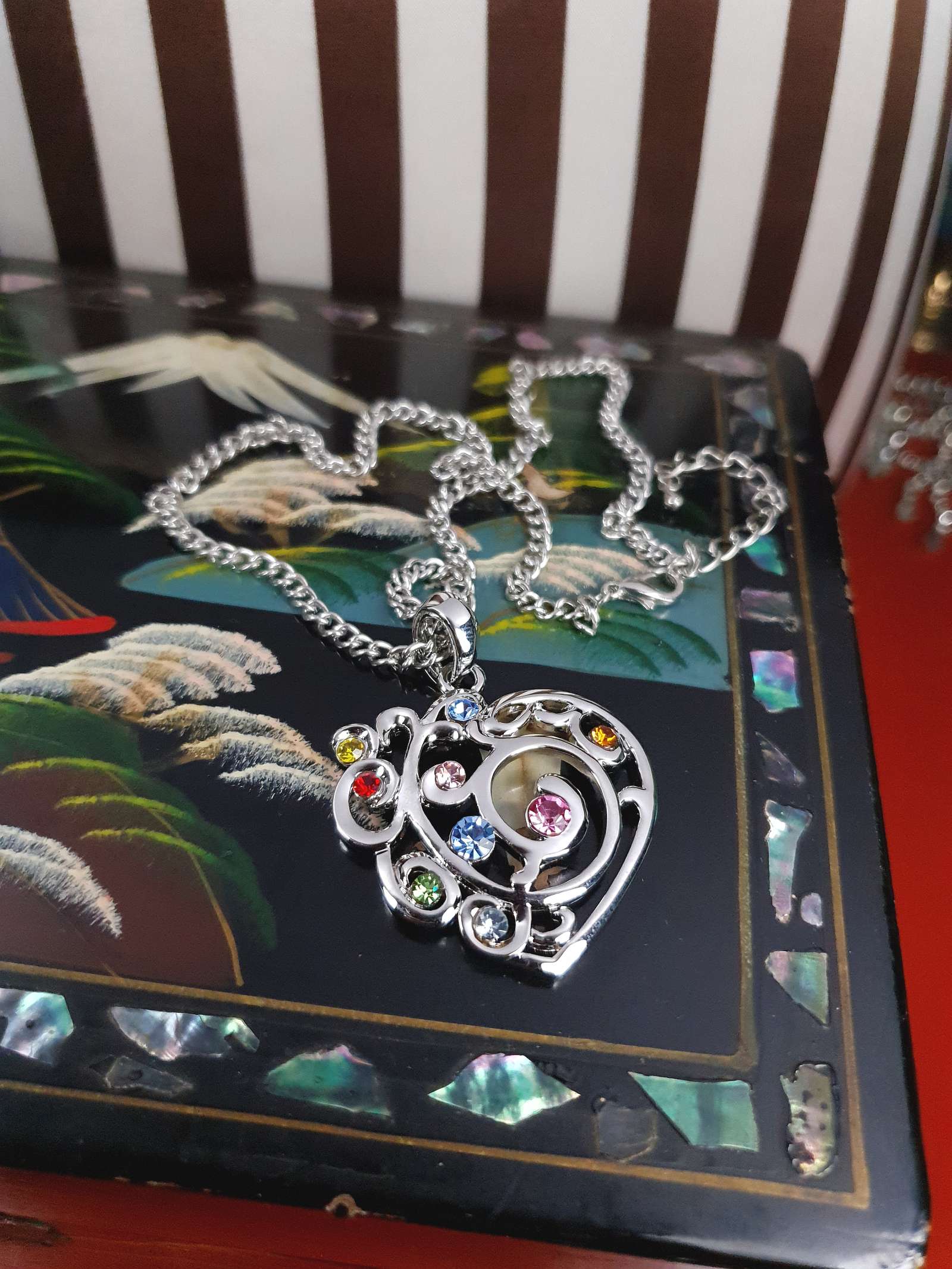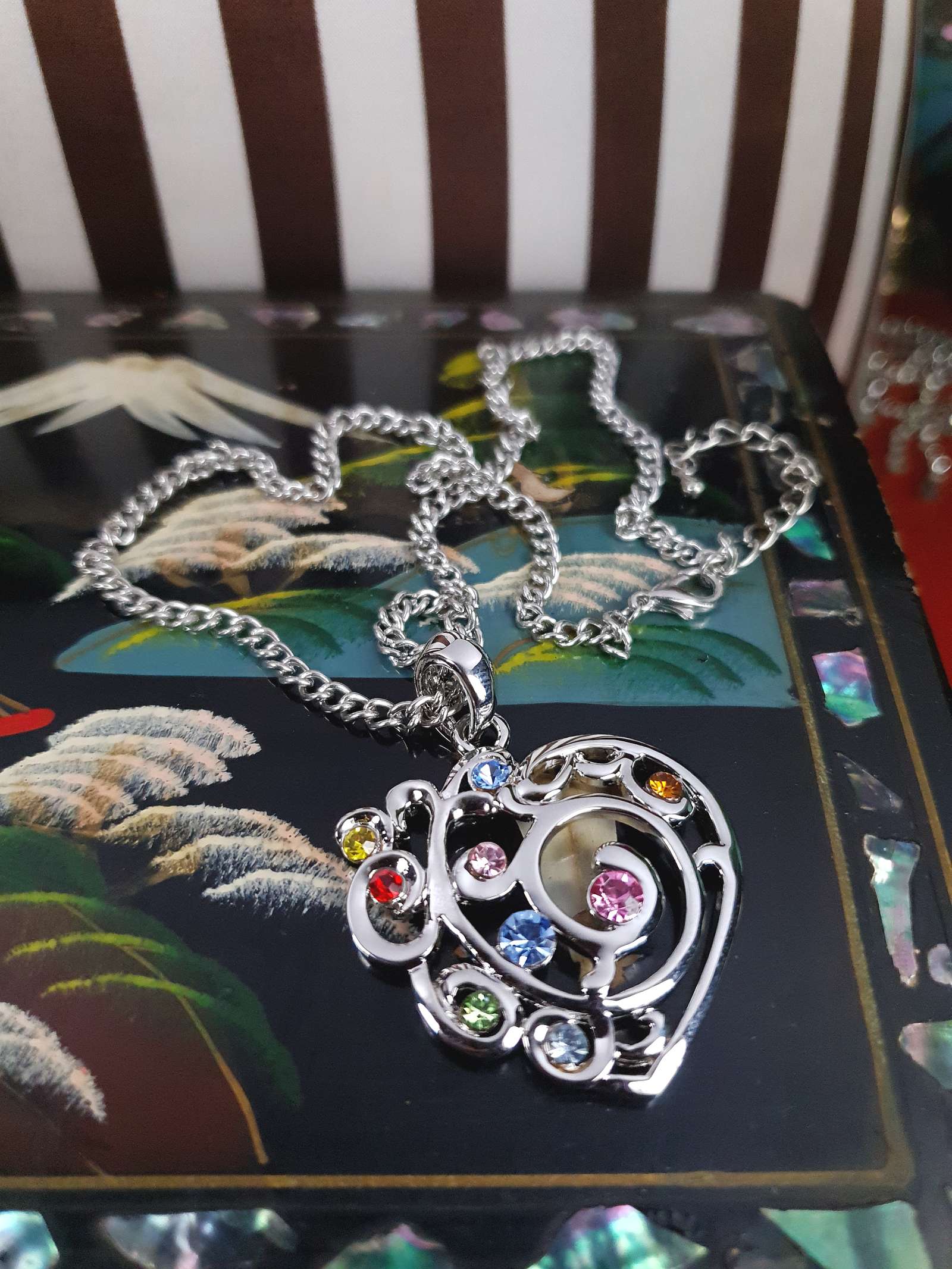 From the early 2000s Y2K era this vintage necklace features a shiny silver-tone metal curb link chain and heart pendant. The pendant features filigree patterns and colourful round-cut glass rhinestones in pale blue, pink, red, yellow, green, and orange. A lobster claw clasp secures the piece and includes an extender.