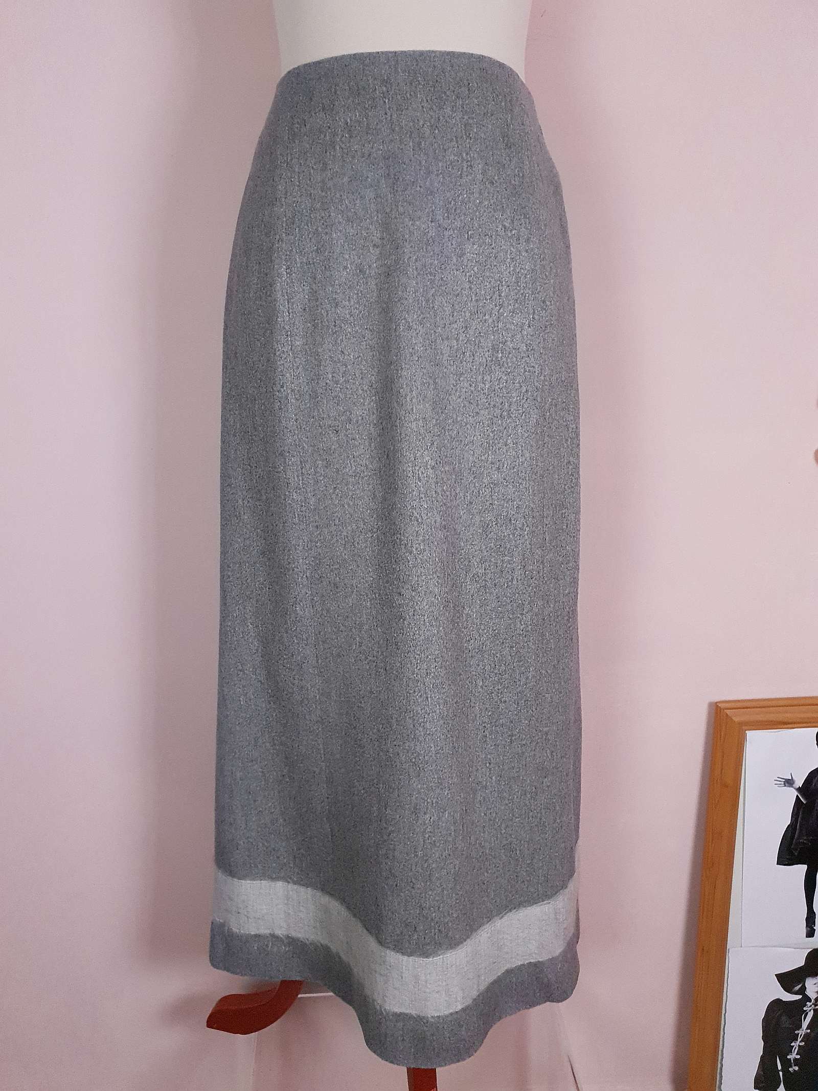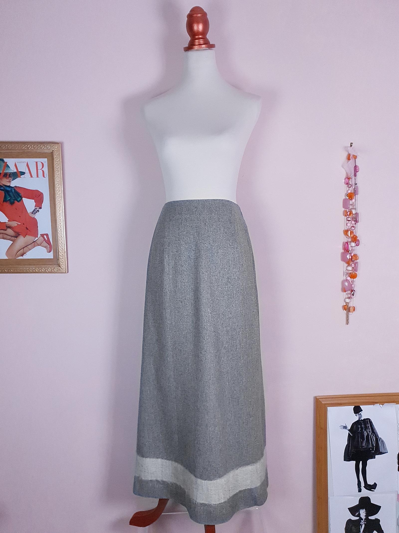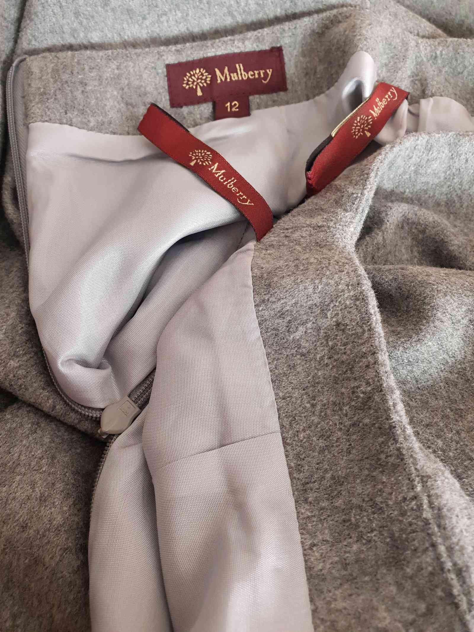 Beautifully tailored from a luxurious blend of silk, wool, and rayon, this vintage Mulberry skirt offers timeless elegance. With a pale grey lining, a back slit, and a light grey fabric band at the bottom.