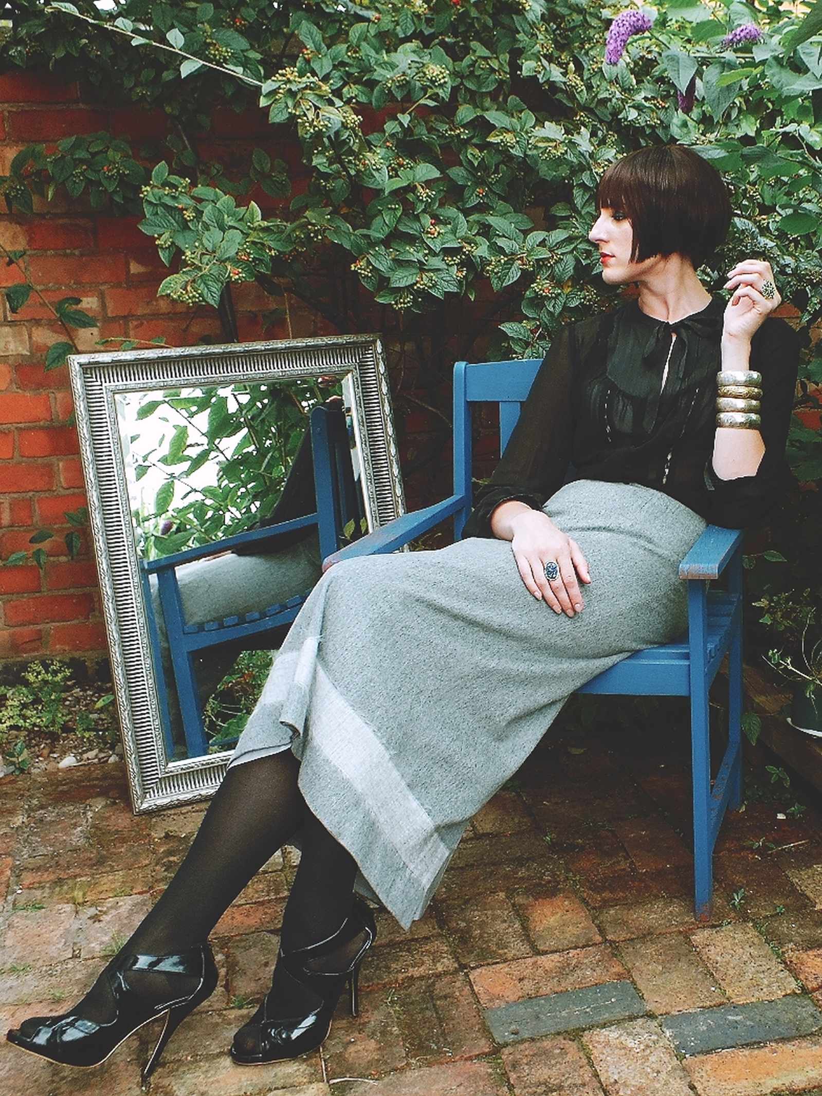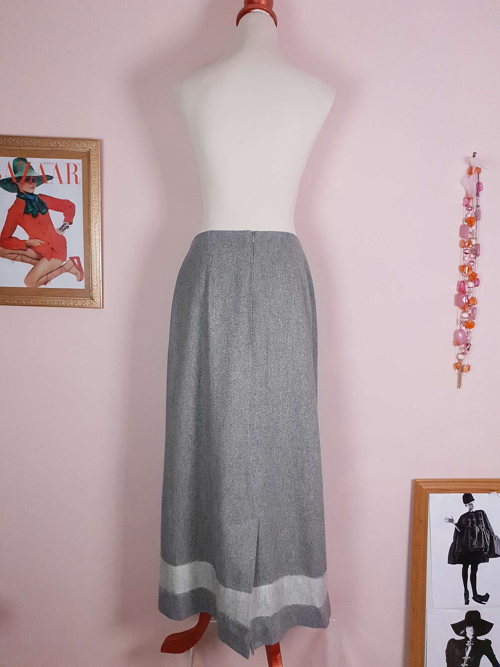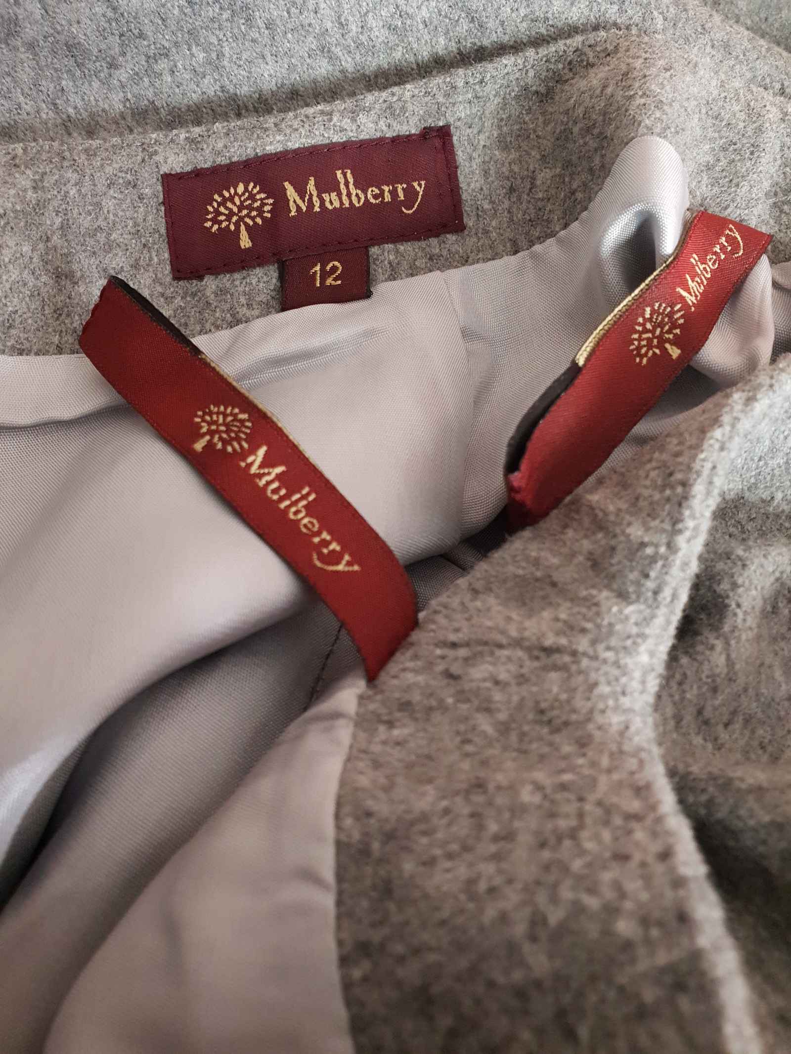 Beautifully tailored from a luxurious blend of silk, wool, and rayon, this vintage Mulberry skirt offers timeless elegance. With a pale grey lining, a back slit, and a light grey fabric band at the bottom.