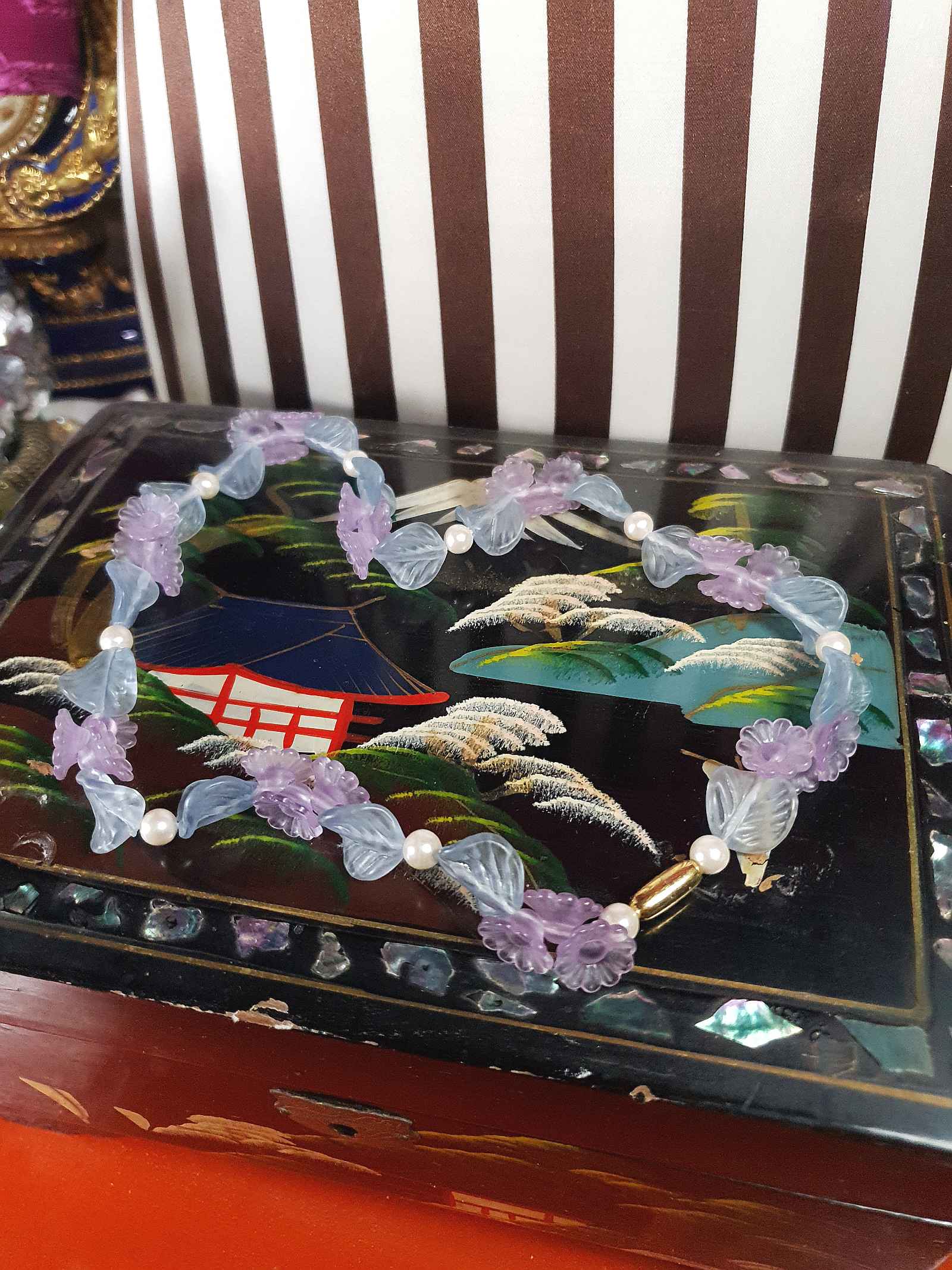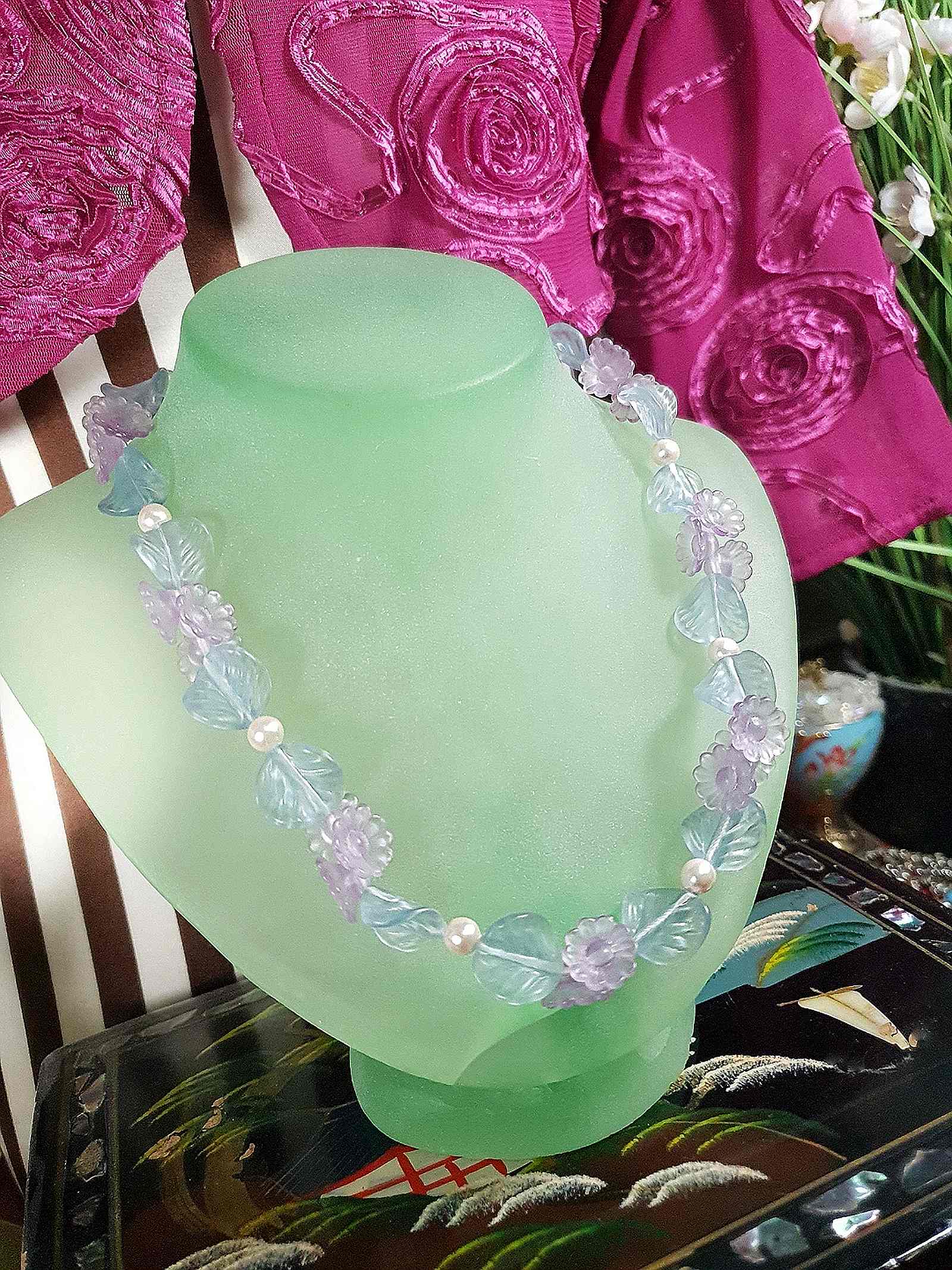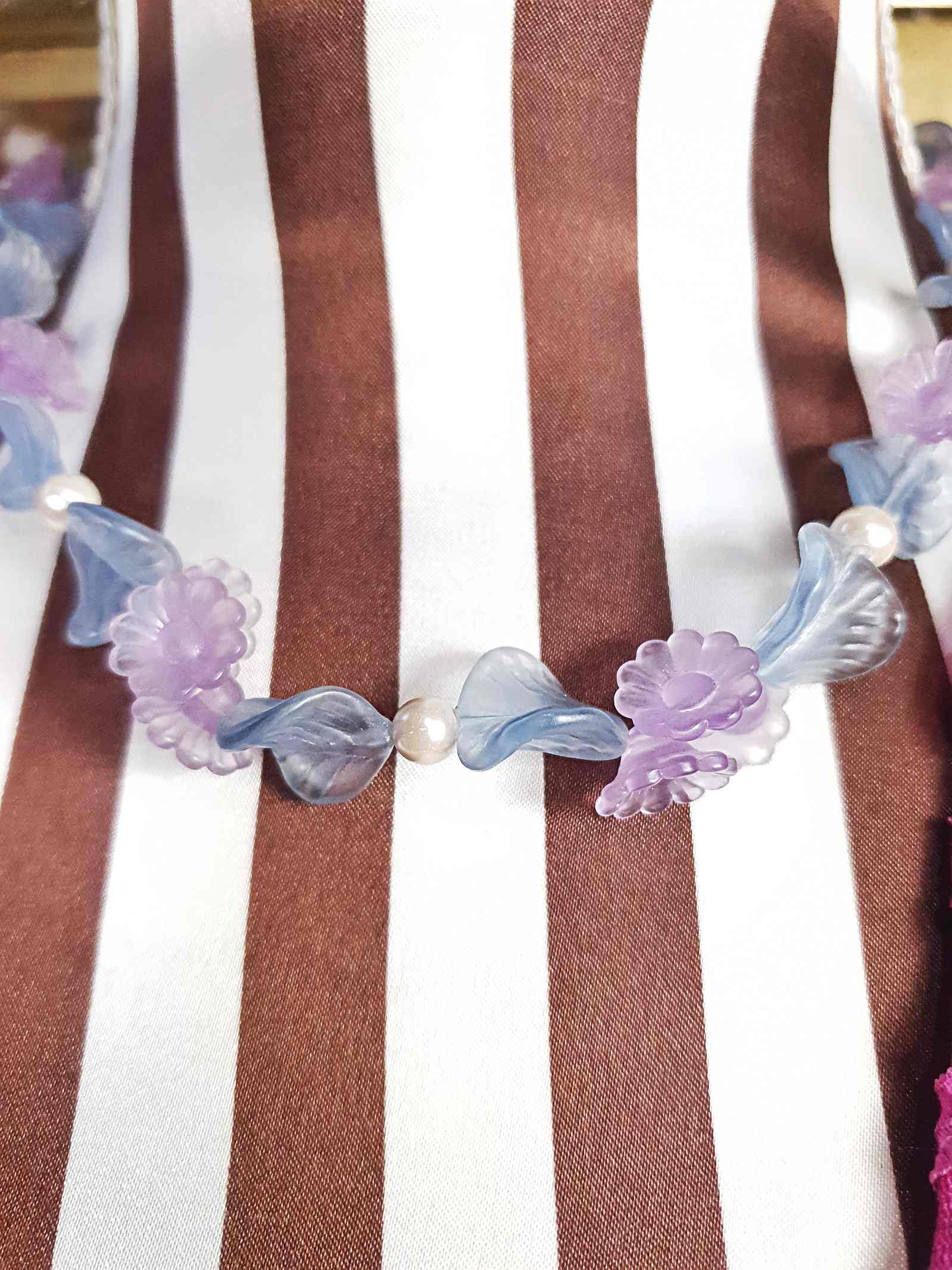 This pretty necklace features dainty pastel blue and lavender frosted flower, and leaf-shaped resin beads interspersed with beautifully iridescent white faux pearls. The beads possess a subtle translucent quality, allowing light to filter through gently. The necklace fastens with a classic smooth barrel clasp.