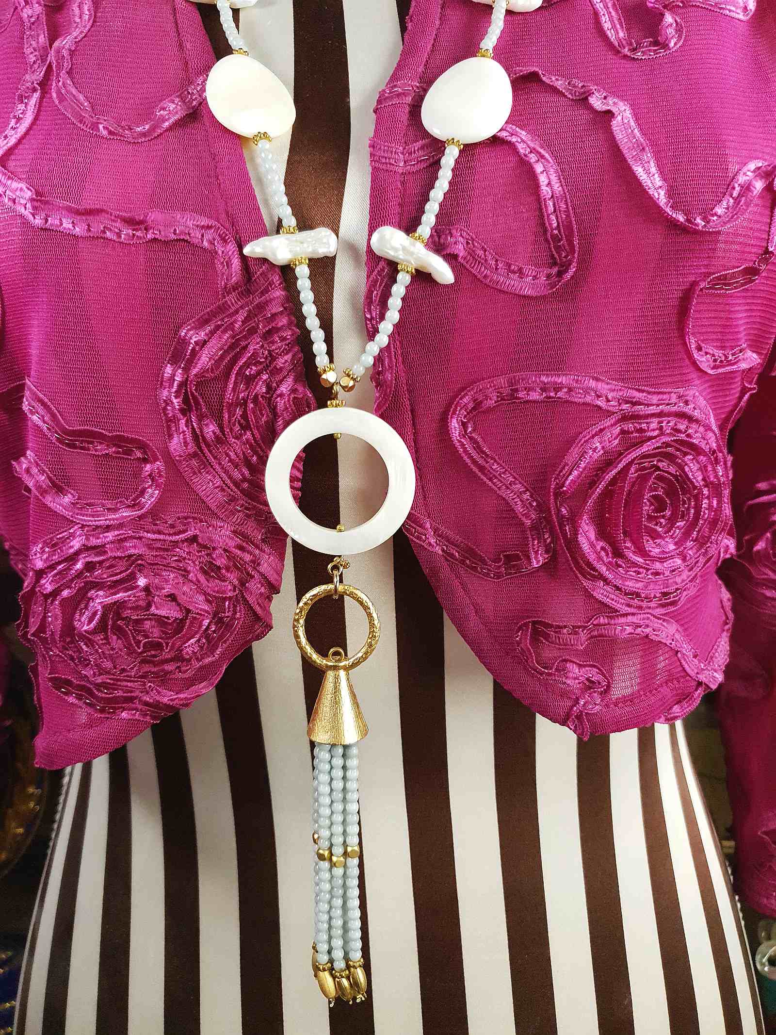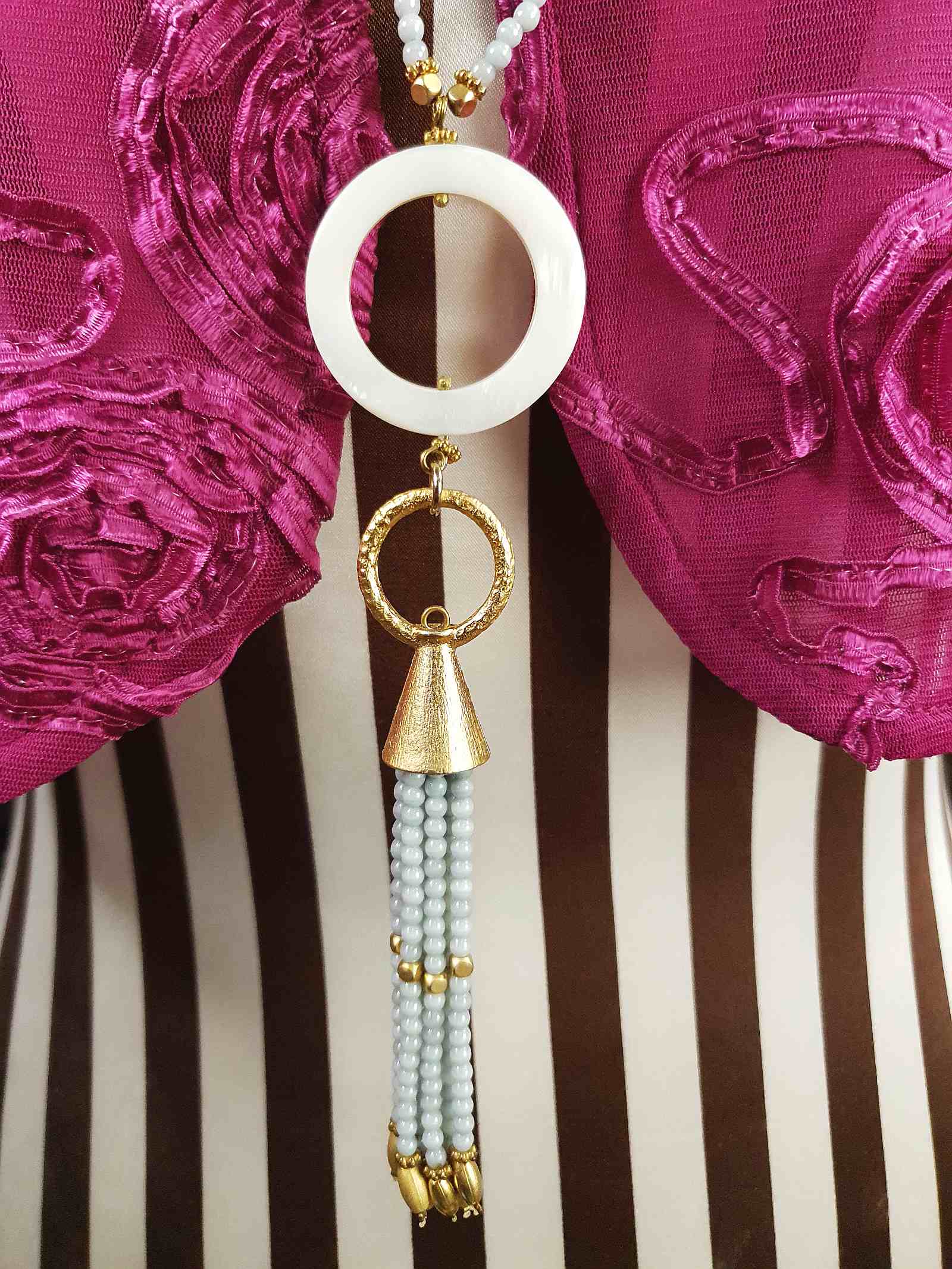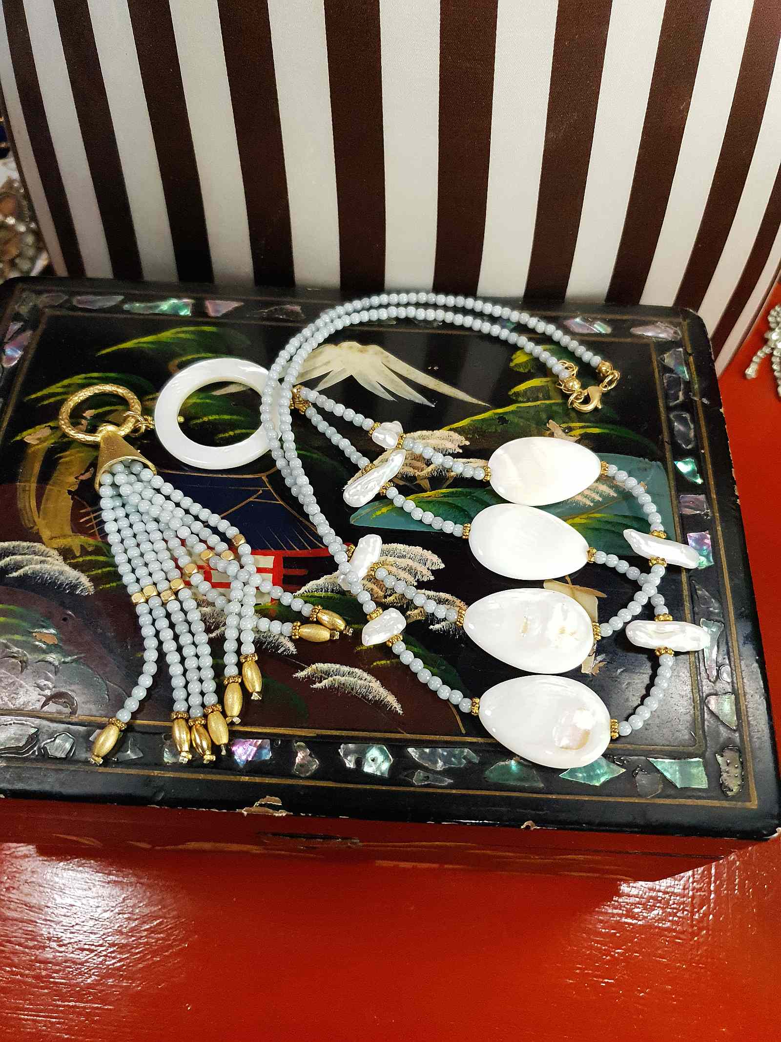 A captivating Y2K vintage necklace crafted with pale blue glass seed pearls, interspersed with uniquely shaped, luminous white baroque pearls and iridescent teardrop mother of pearl beads with natural golden inclusions. Matte gold-tone metal bead caps enhance the design's elegance. The necklace features a mother-of-pearl circular pendant, finished with a flowing strand pendant. Lobster claw clasp fastening with extender. This iridescent necklace captures the essence of the early 2000s.